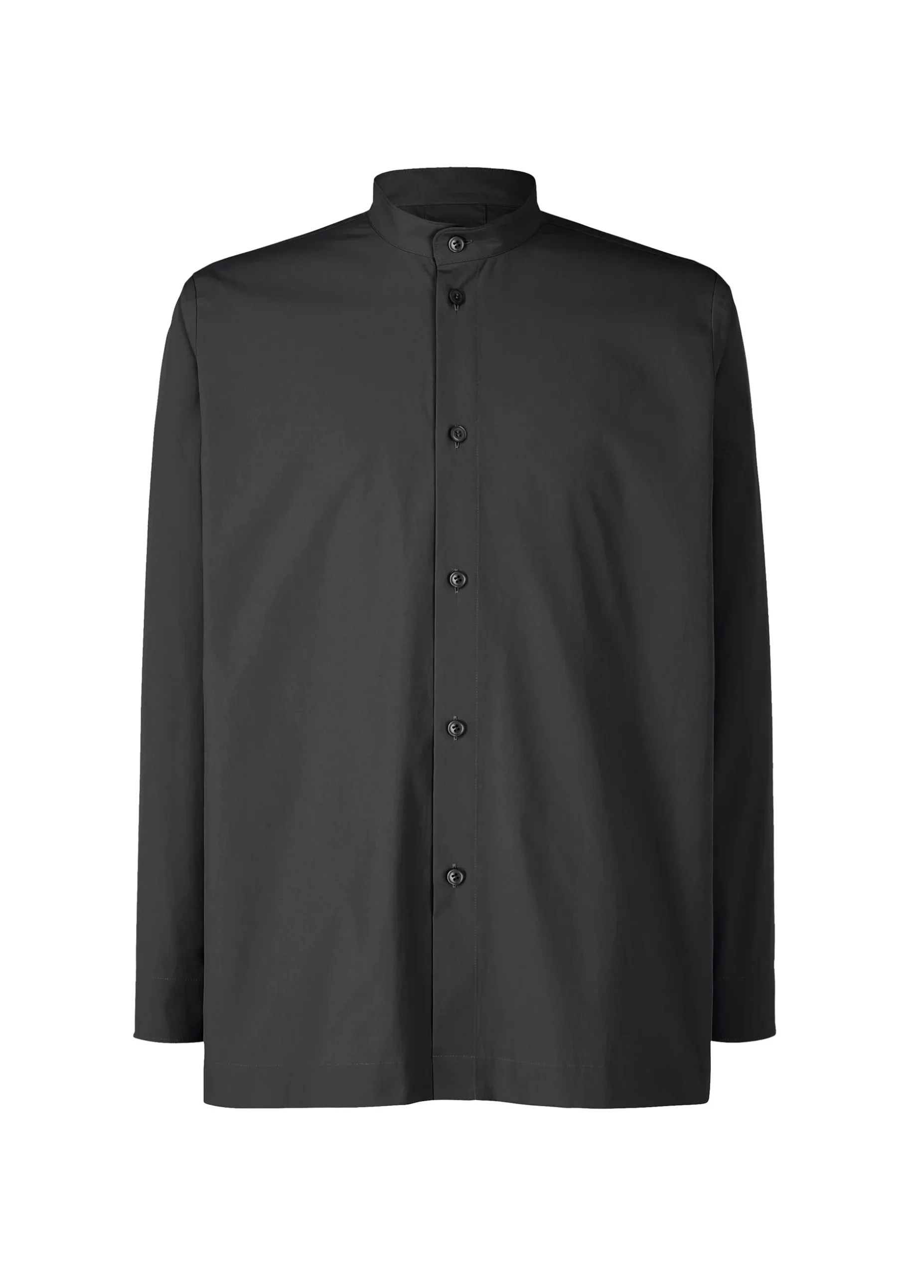 This shirt with a standing collar is available in deep color tones using yarn-dyed thread. It has a simple design that is easy to style in outfits. It has slits on both sides.