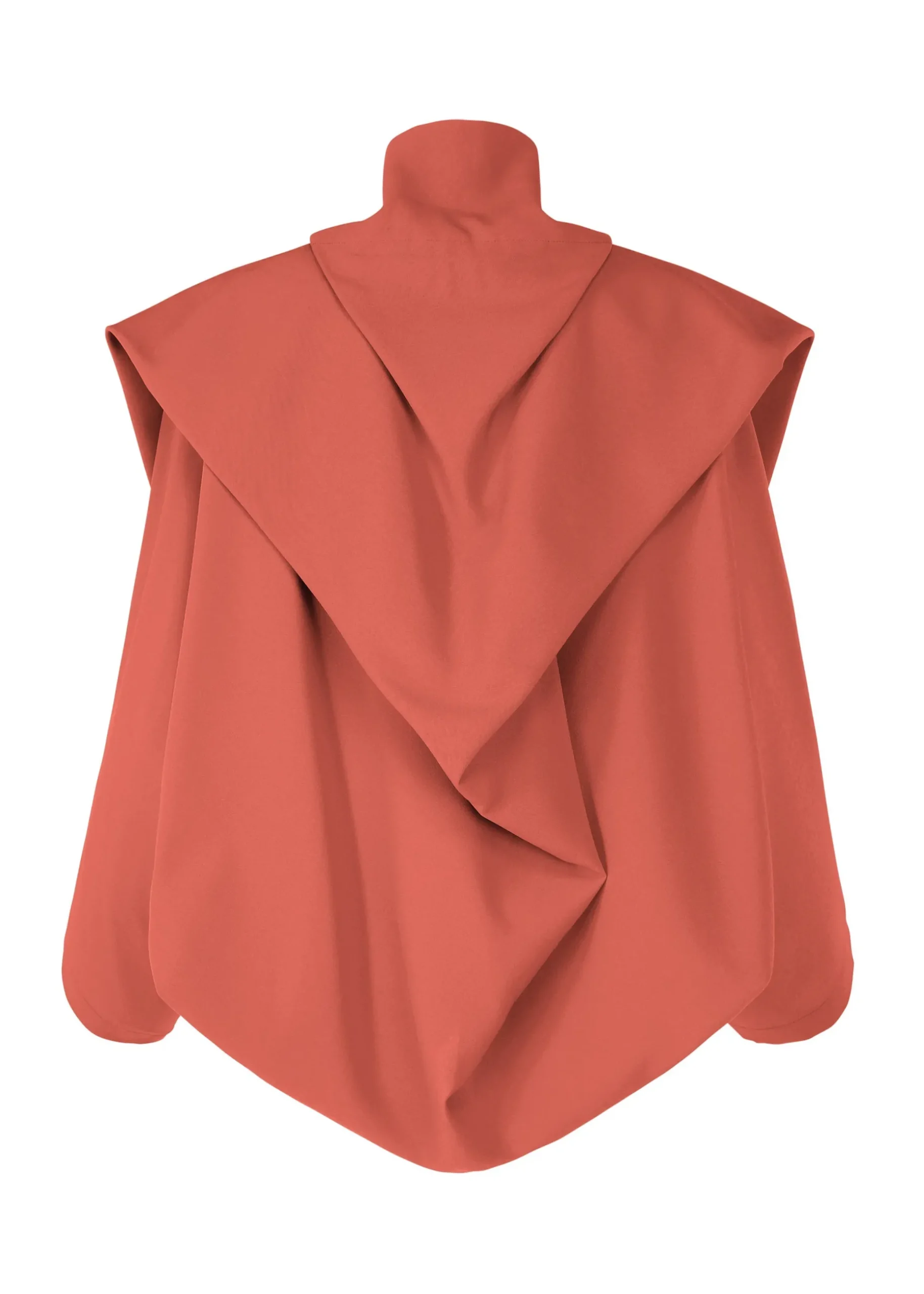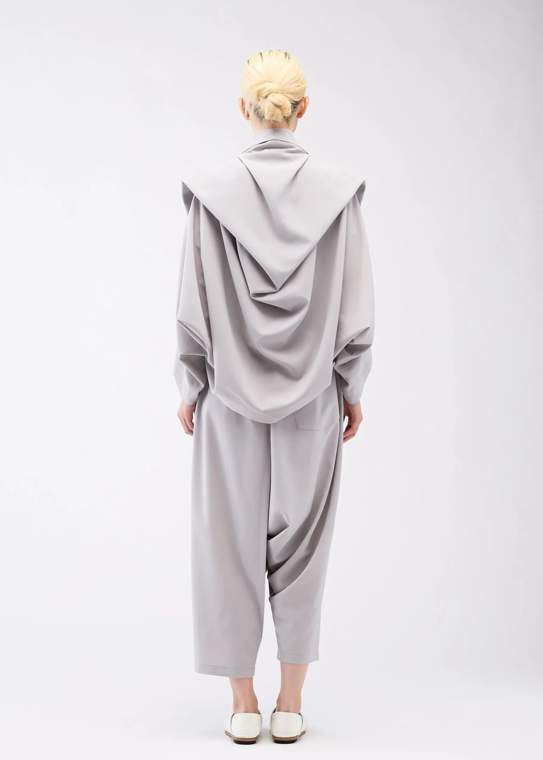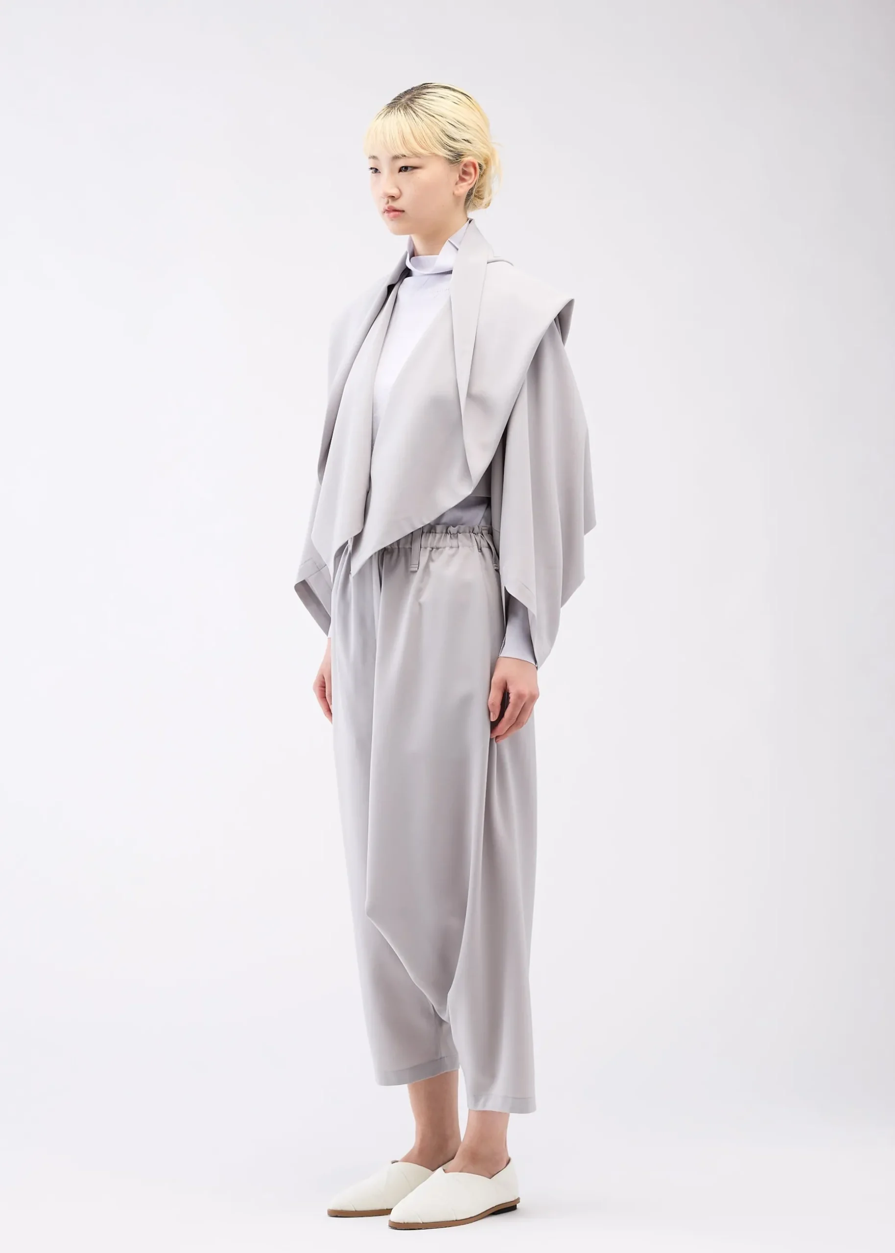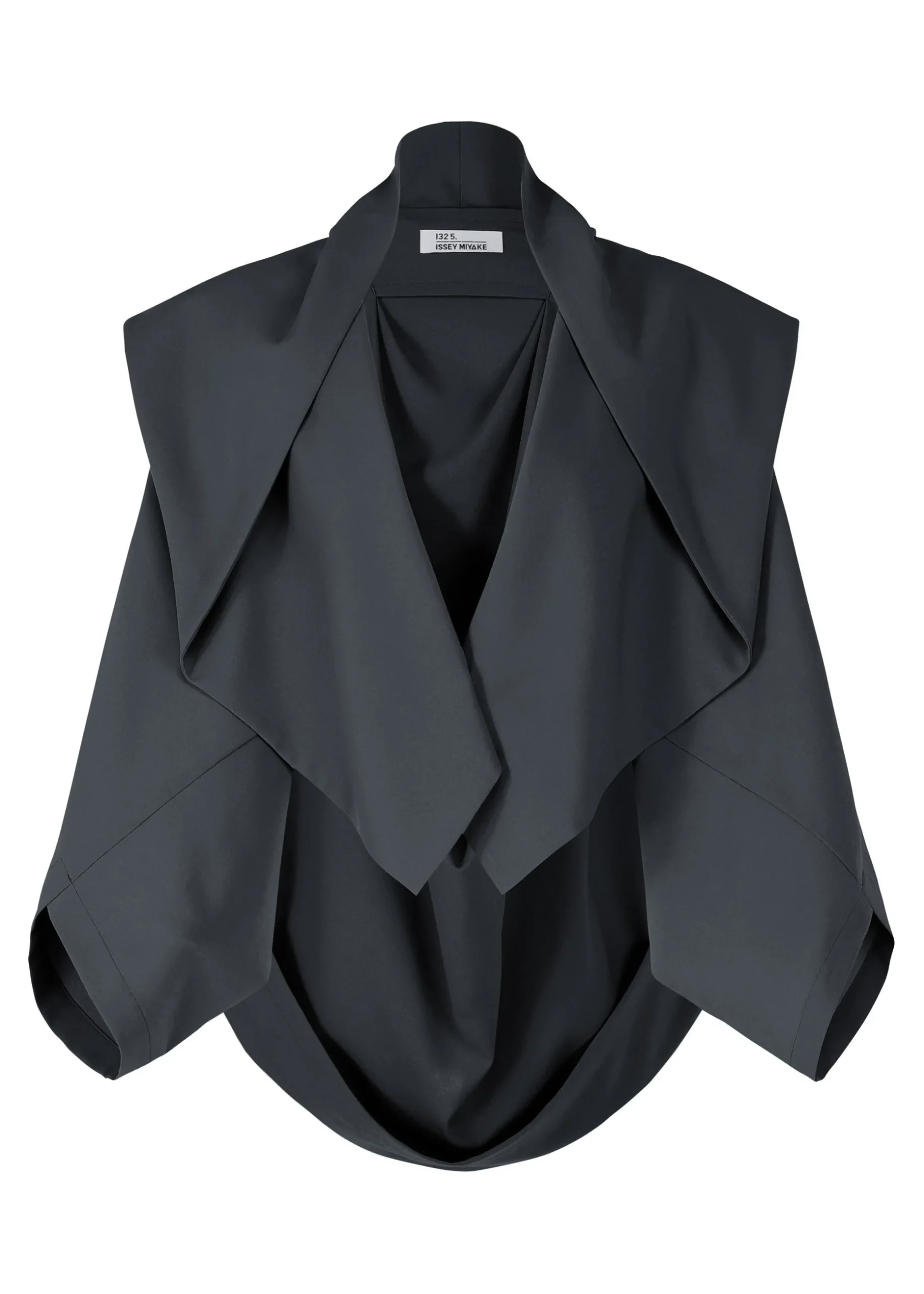 A feather cage made from a rectangular piece of cloth, with the collar, sleeves, and body all being made into one piece. It features a loose drape. Made from recycled polyester fabric.