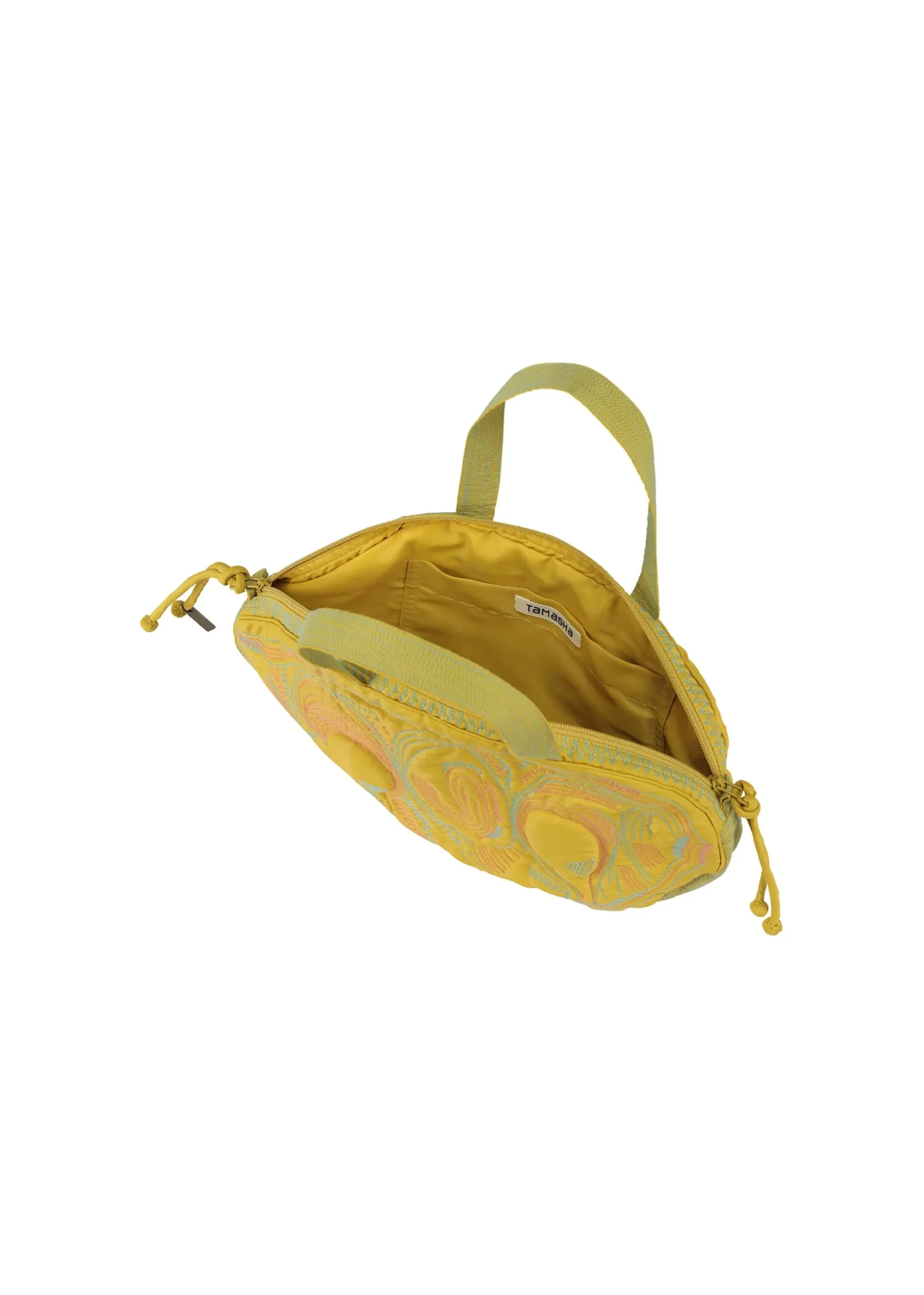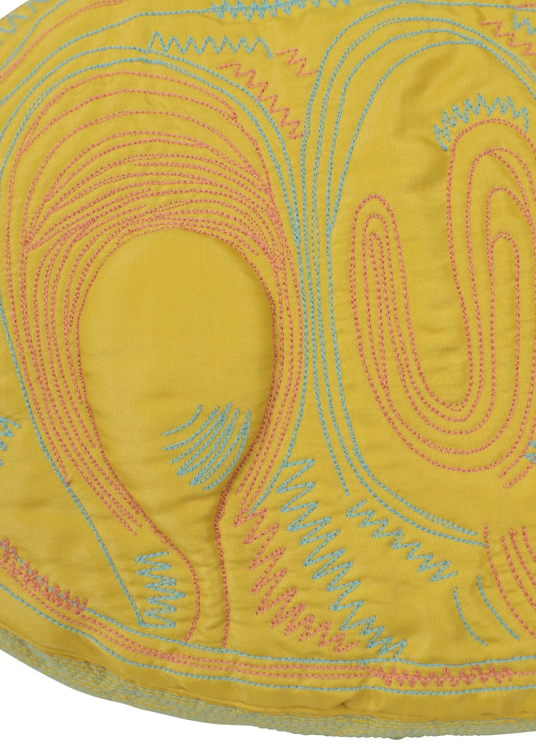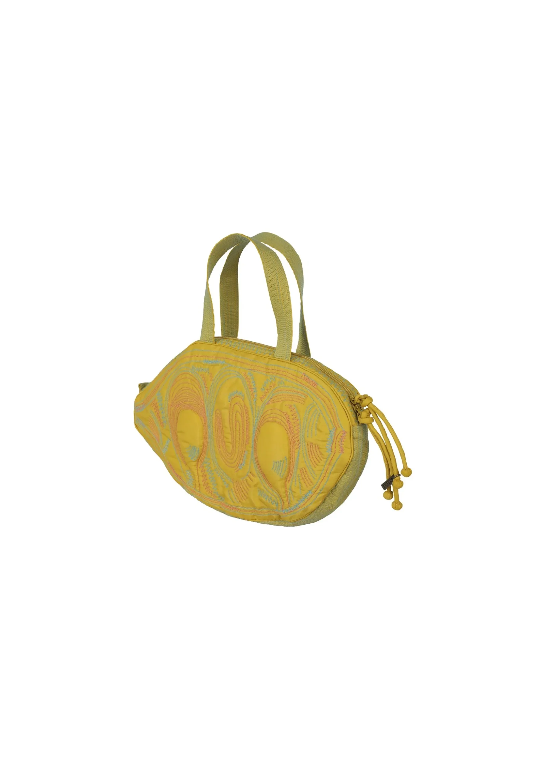 A handbag with BHILL embroidery (*) with motifs of acacia, hickory nuts, eucalyptus, pagoda tree, and akebia fruit and seeds. The design is partially filled with cotton, giving it a fun three-dimensional feel that makes the seeds stand out.