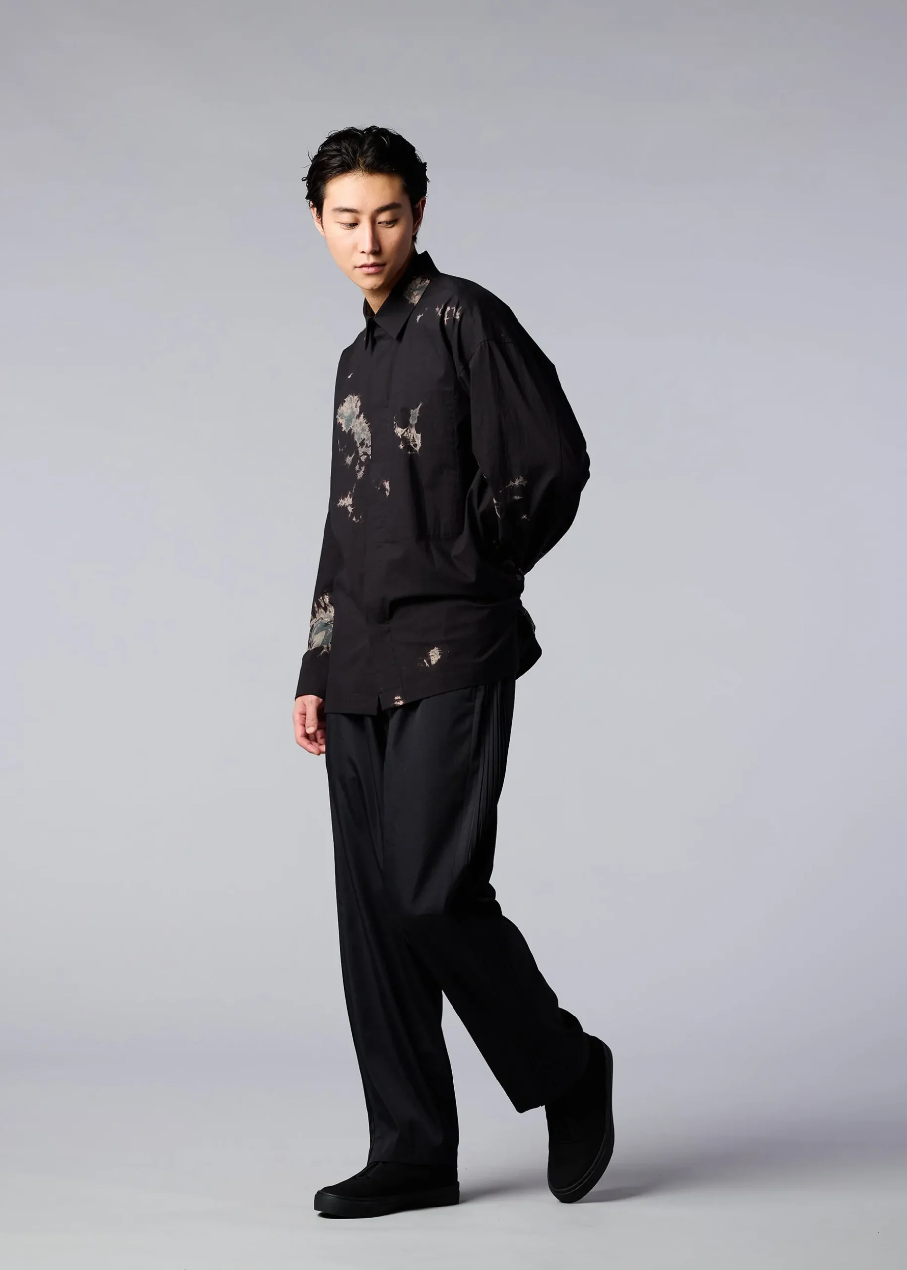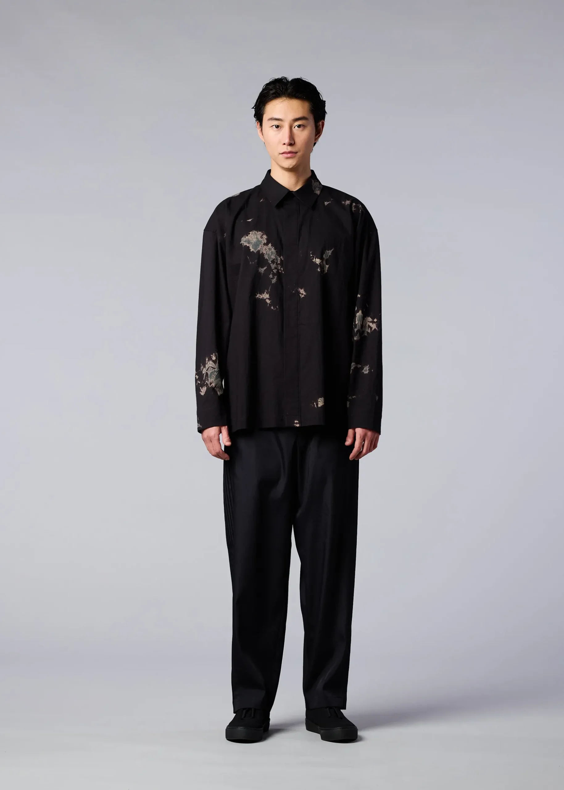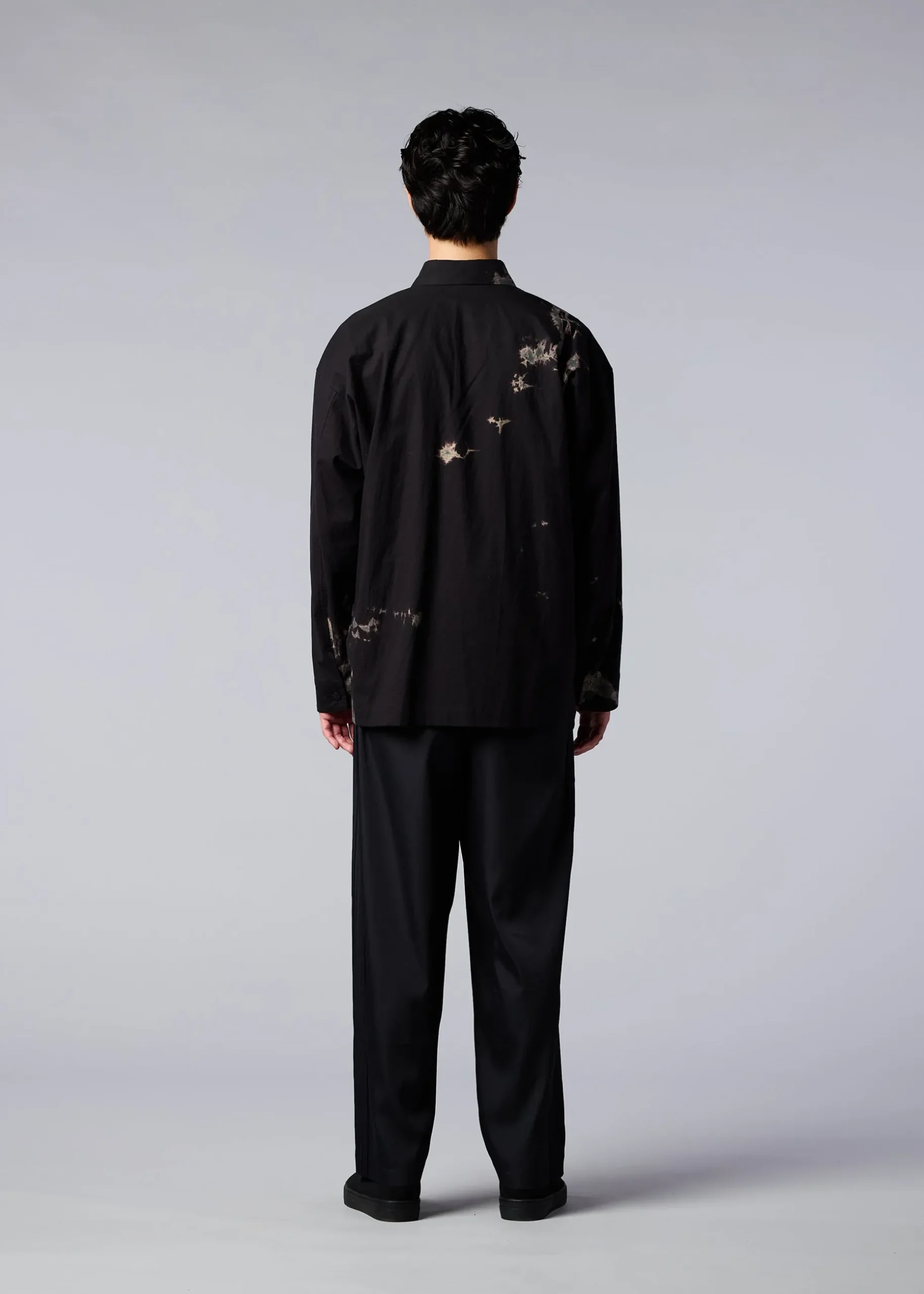 A stand-up collar shirt featuring textiles made using discharge printing and dyeing techniques. A unique pattern is created by layering fabrics of the base color in a dynamic and complex manner and performing discharge printing and dyeing in this state. The body has been designed as a continuous piece for ease of movement and relaxed comfort. The pattern of this product is different one by one. Thank you for your understanding in advance.