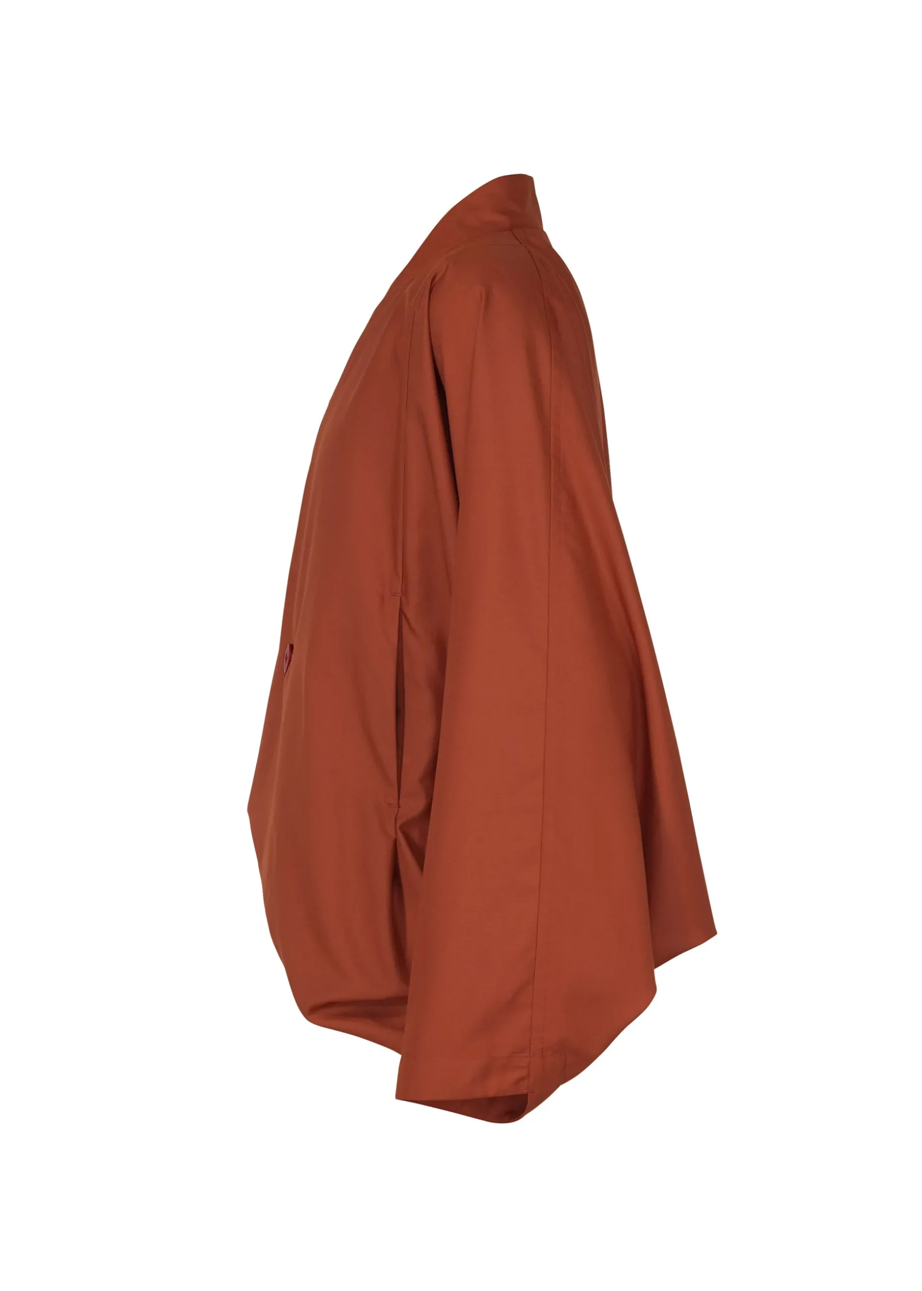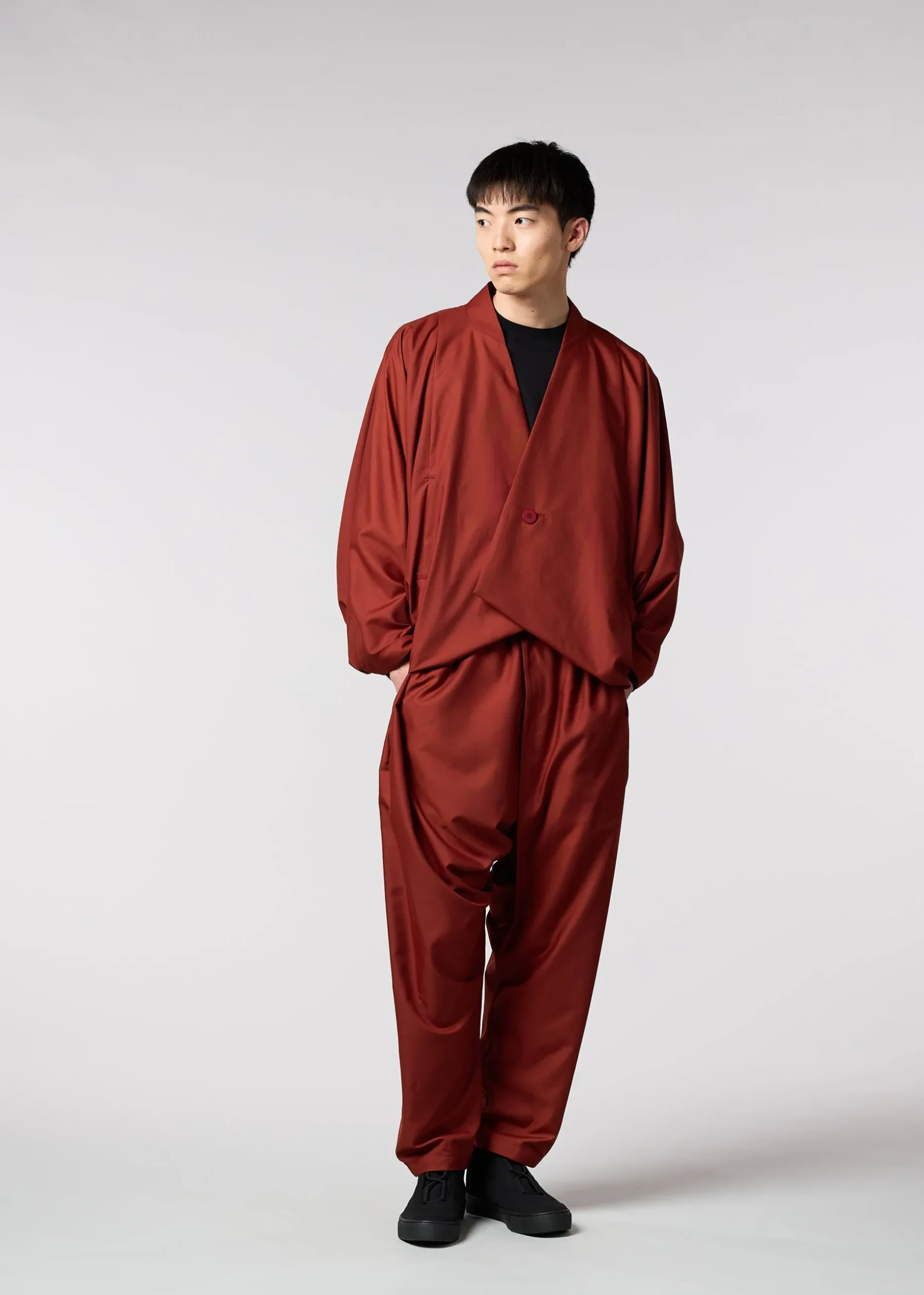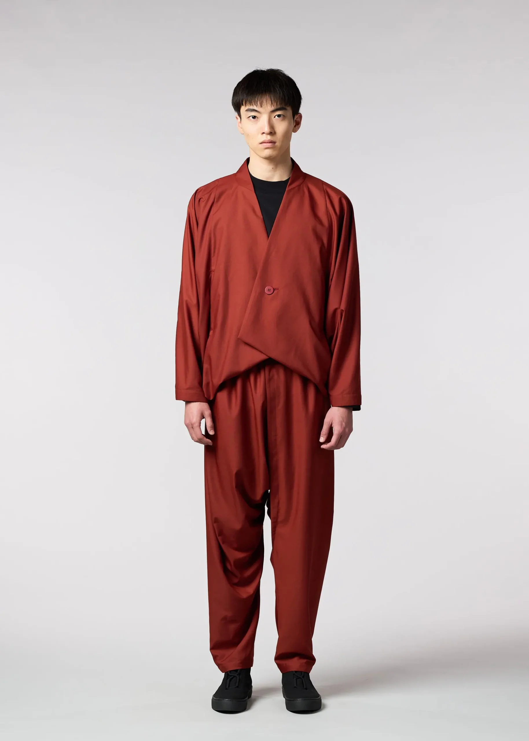 A collarless jacket that offers a light experience of wearing a piece of cloth around your body. It features a loose silhouette and a large range of motion when worn, created by the unique structure of the garment, which consists of one part. We use textiles that are wrinkle resistant and easy to care for, and are designed to be easy to incorporate into your daily life.