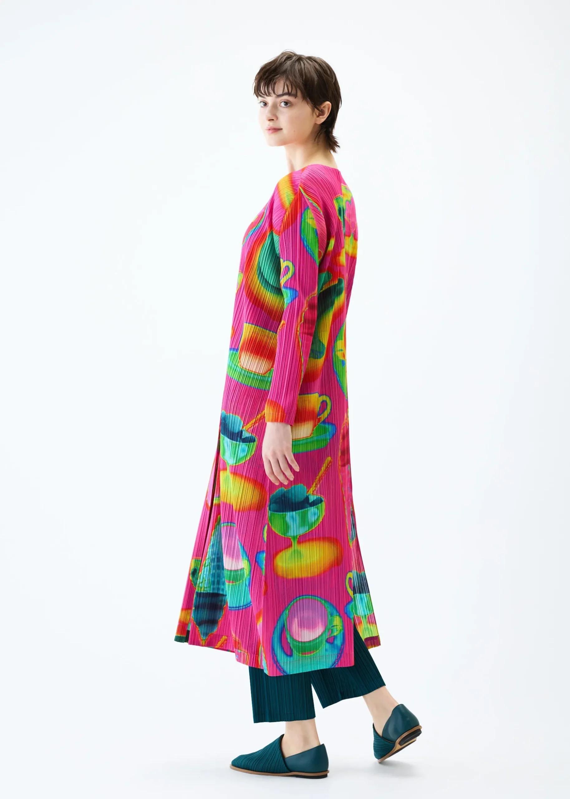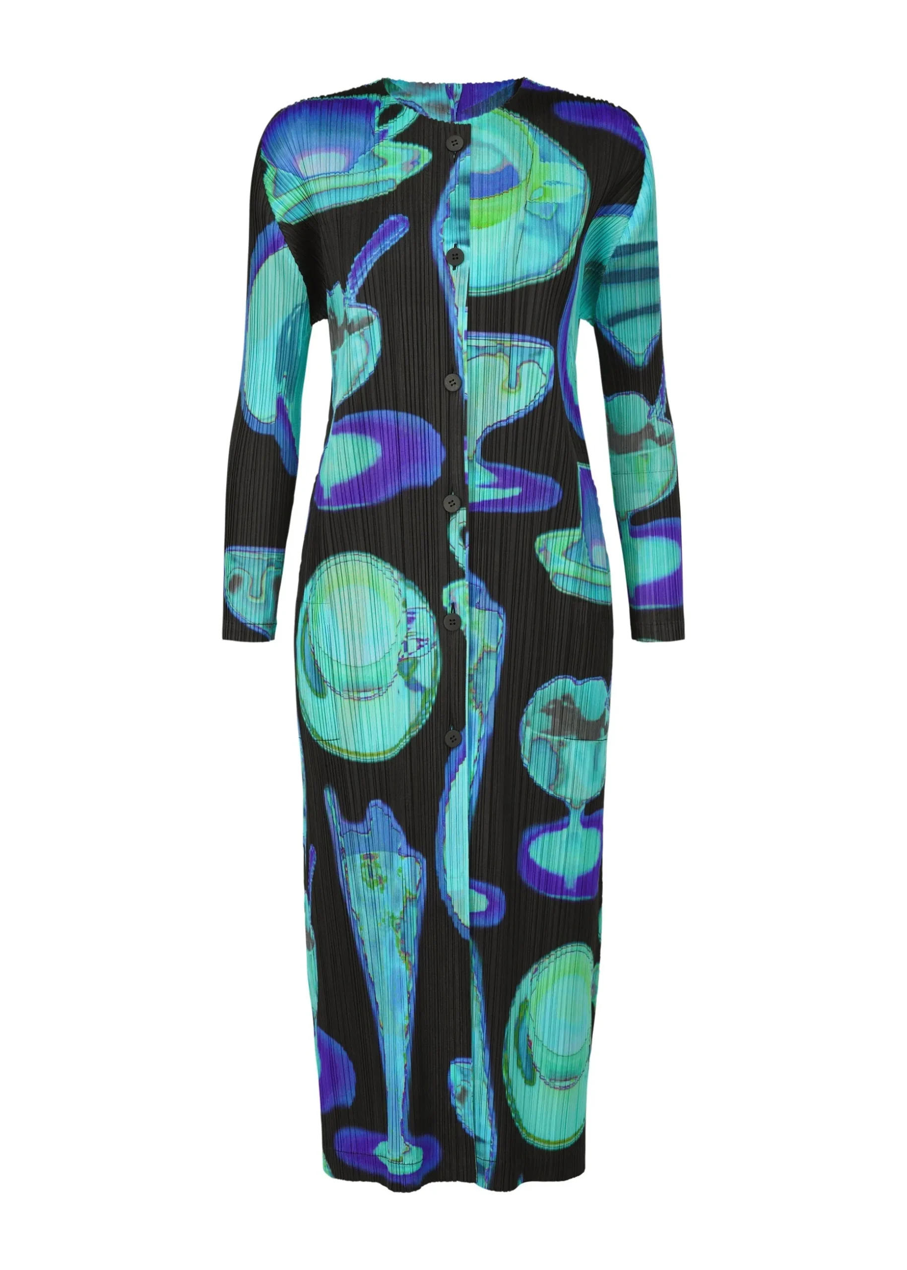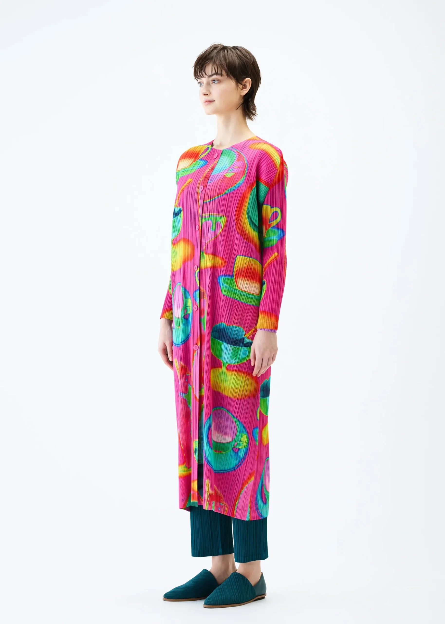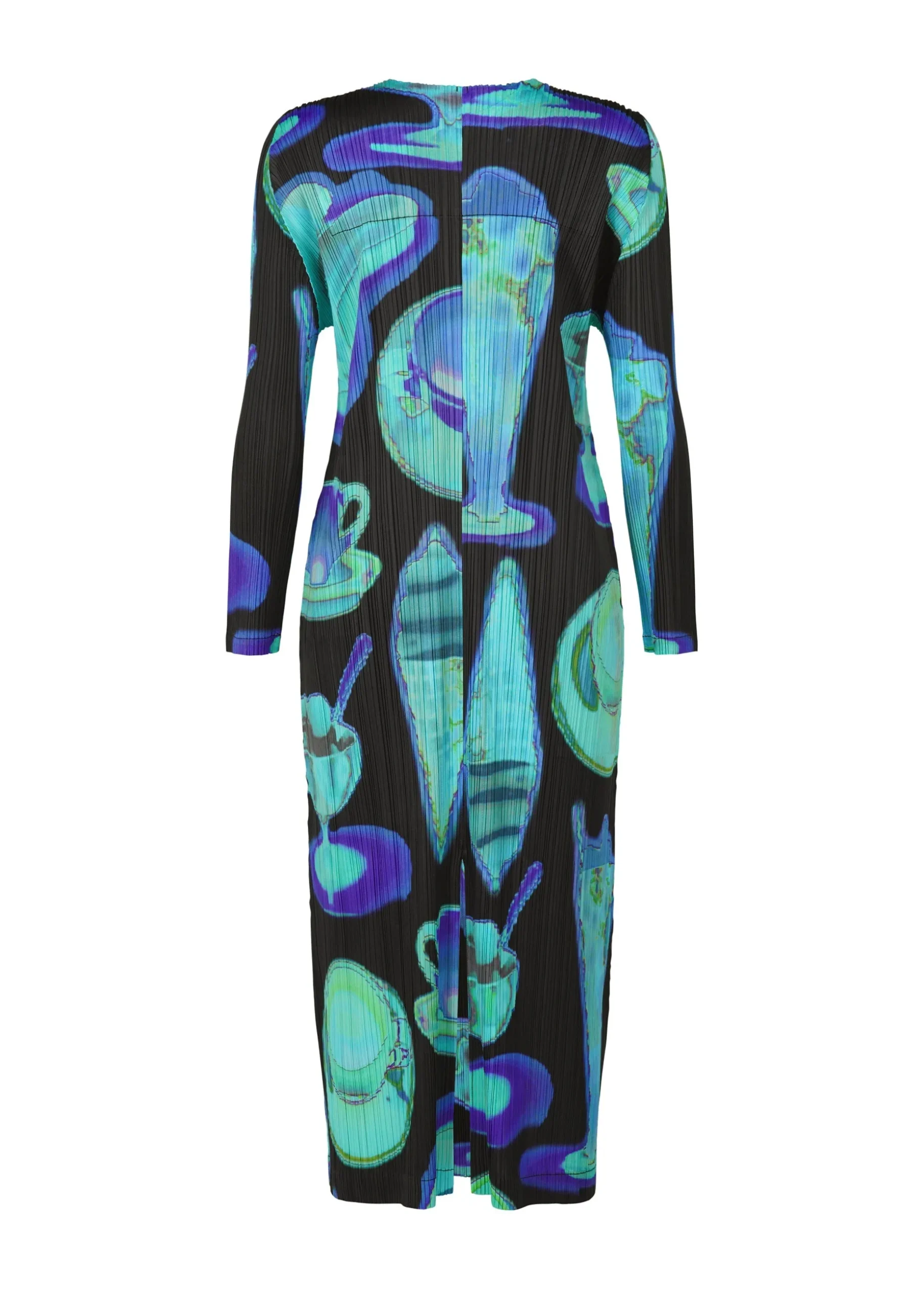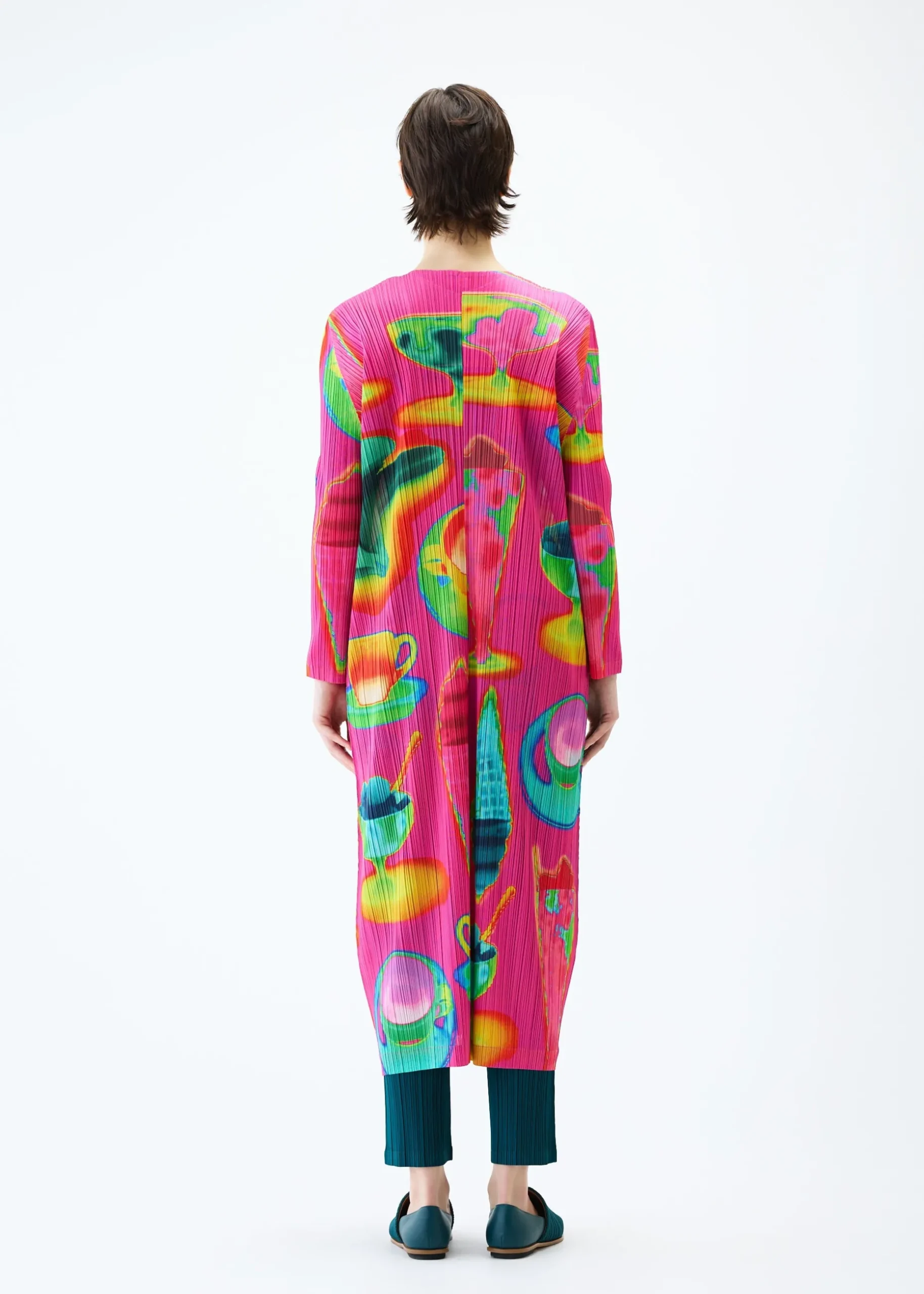 This long cardigan has a print featuring the temperature differences of various items captured with an infrared thermographic camera, including soft serve ice cream, bananas, and hot coffee. It is available in two color options: Pink which looks as if the motifs are heated, and Black which looks as if they are cooled. It has a buttoned design, pockets on both sides, and a slit at the center back.