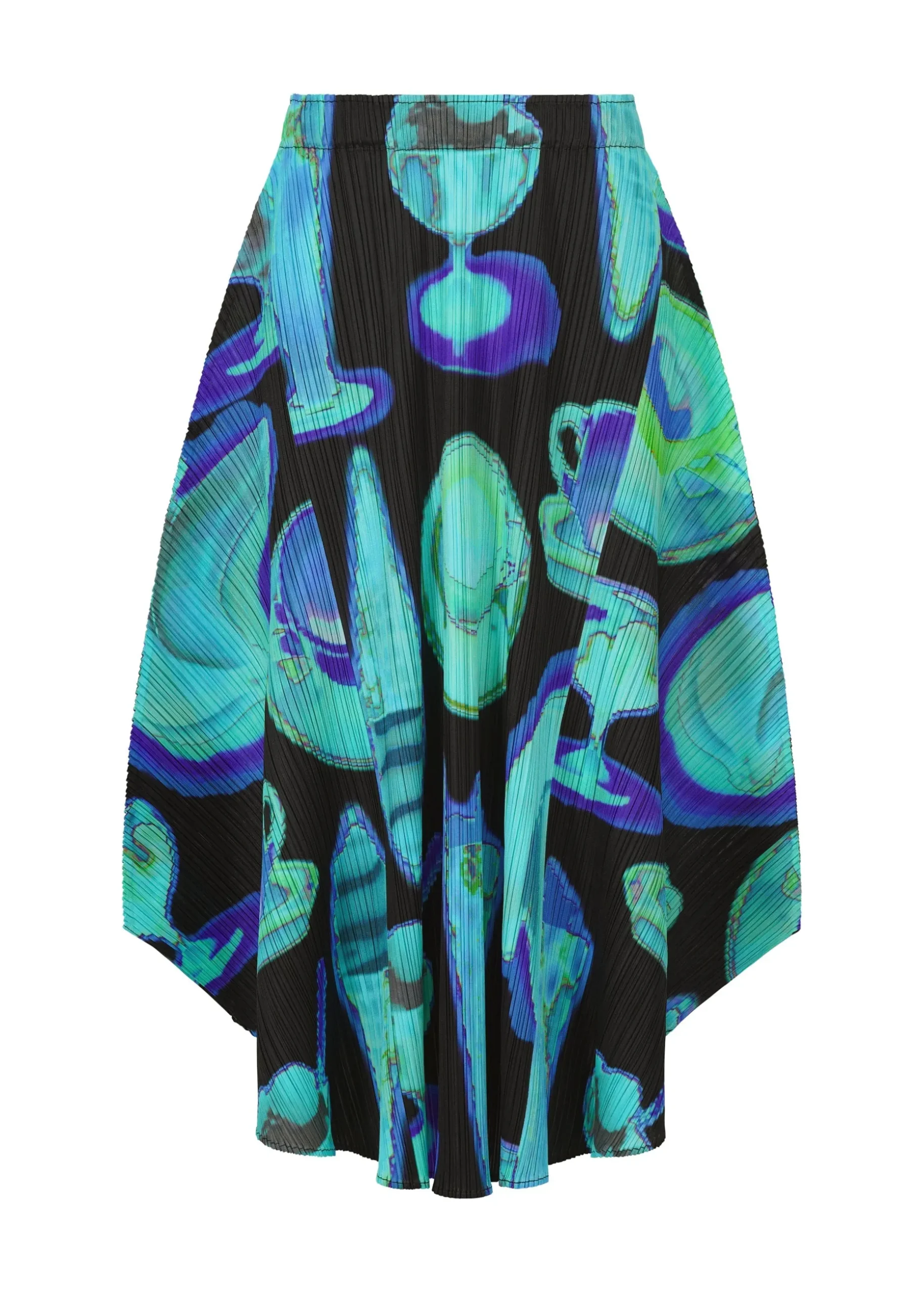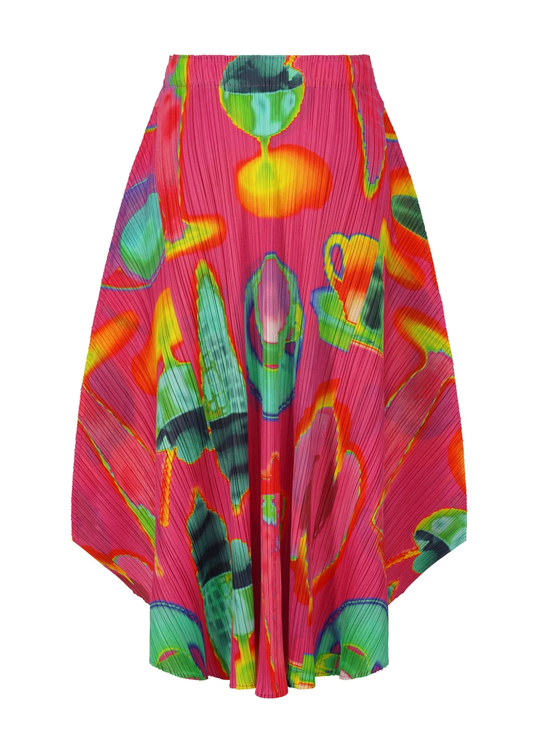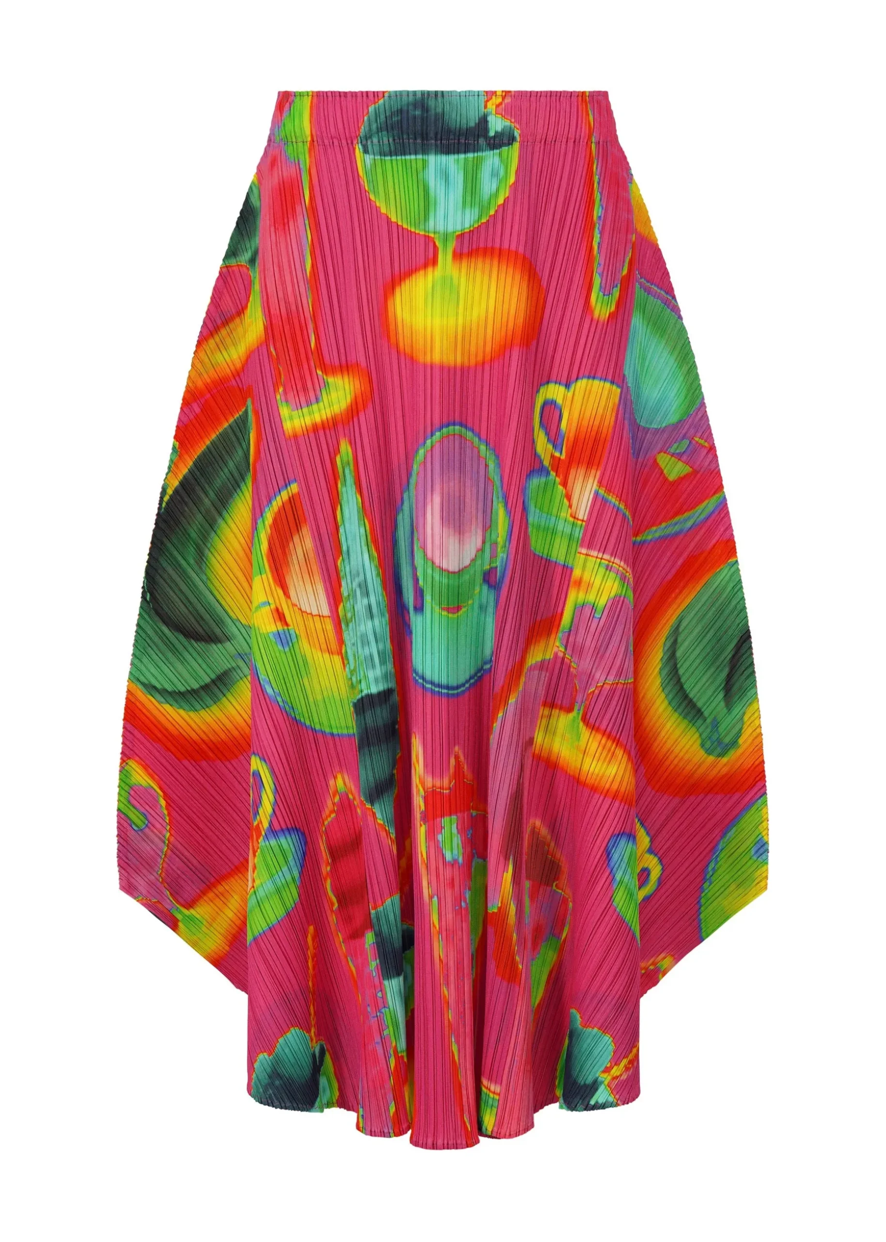 This flared skirt has a print featuring the temperature differences of various items captured with an infrared thermographic camera, including soft serve ice cream, bananas, and hot coffee. It is available in two color options: Pink which looks as if the motifs are heated, and Black which looks as if they are cooled.