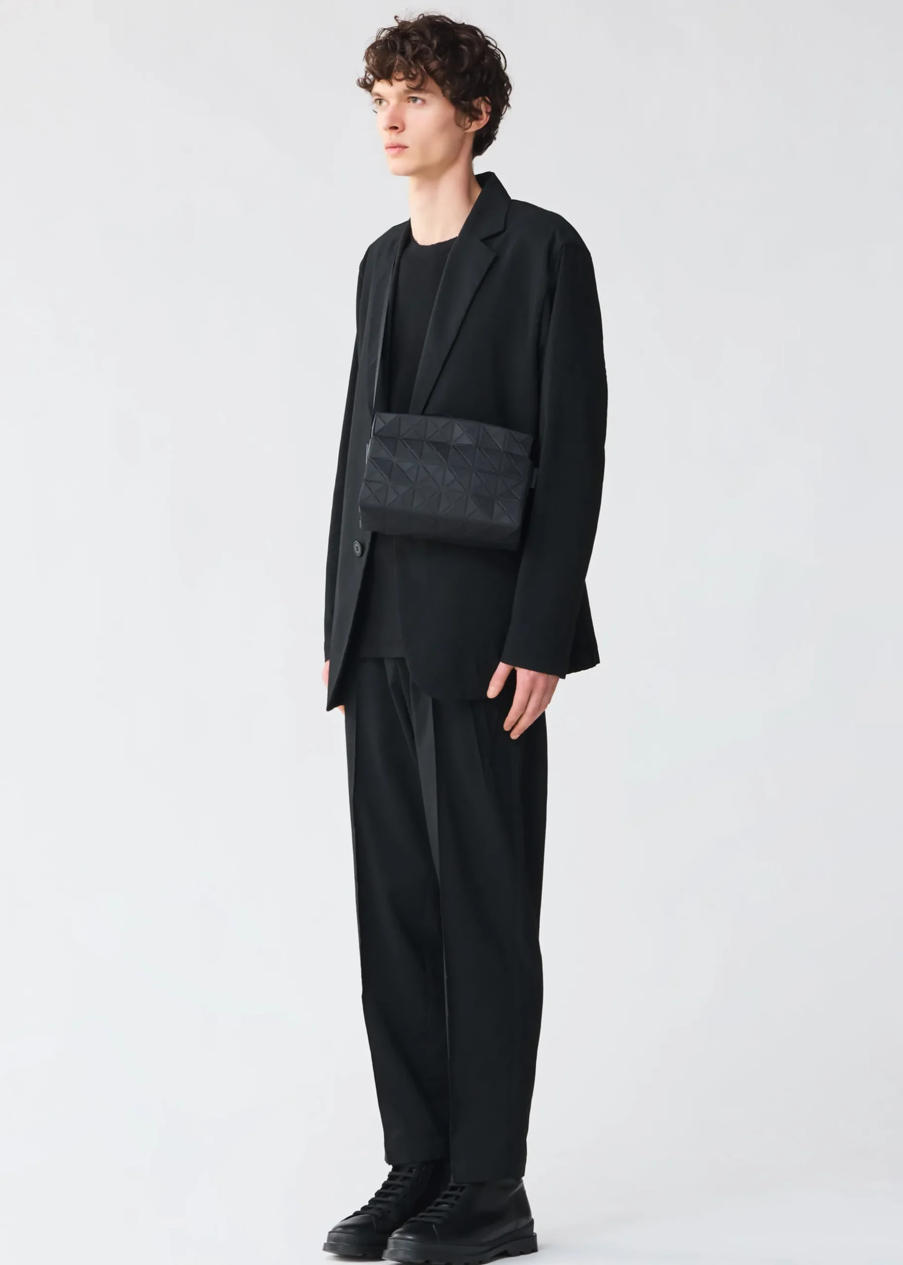 This TRACK series shoulder bag further embodies the charm of the triangular units that symbolize the brand and Issey Miyake’s fundamental “a piece of cloth” concept. By encapsulating the brand’s characteristic isosceles triangle units in the fabric, the bag’s shape is created through structural movement, and you can enjoy its impressive look as it goes from flat to three-dimensional. The bag pursues functionality with its minimalist parts in one color tone and thick nylon handles. It combines low-key beauty with durability through its use of subtly glossy, flexible fabric and resin parts to prevent scratching at the corners.