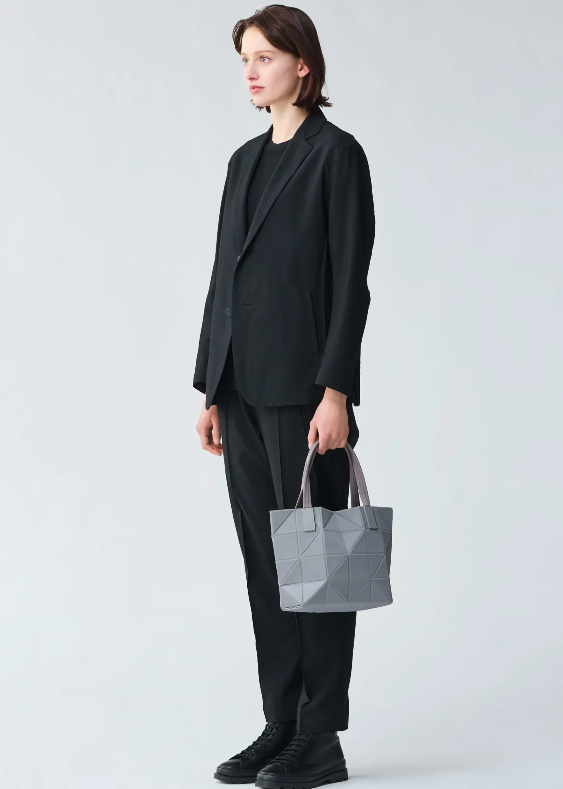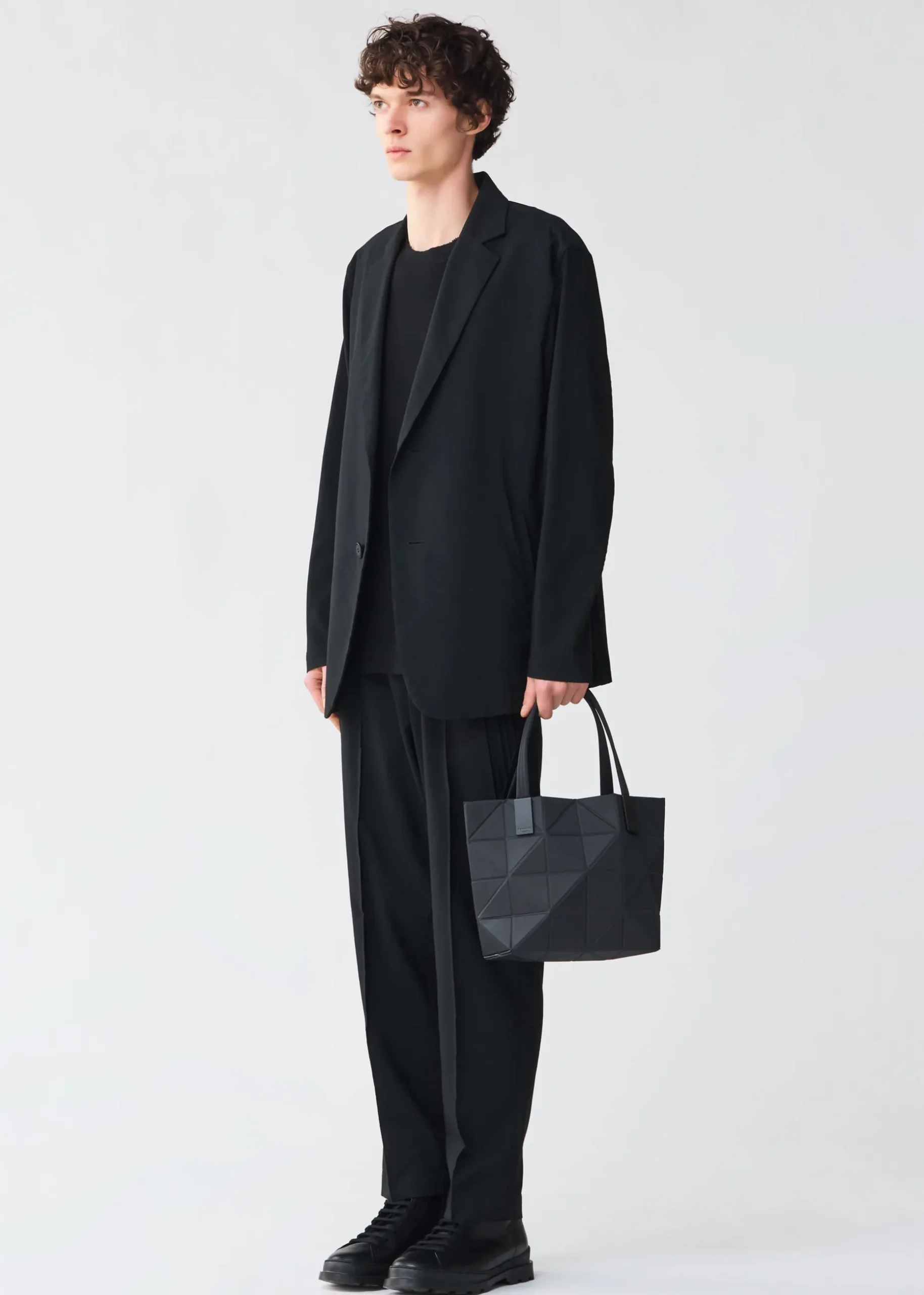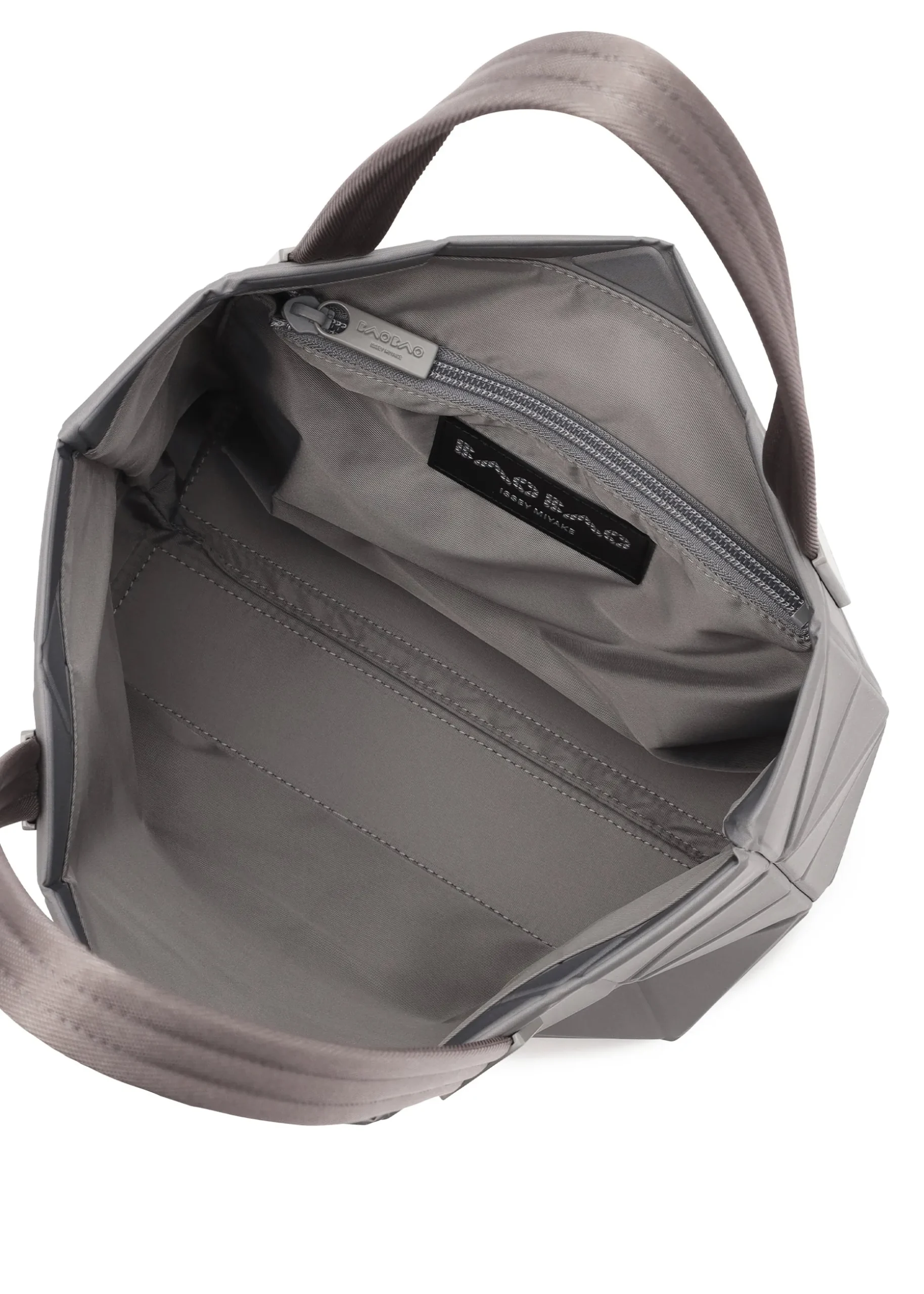 This TRACK series tote bag further embodies the charm of the triangular units that symbolize the brand and Issey Miyake’s fundamental “a piece of cloth” concept. By encapsulating the brand’s characteristic isosceles triangle units in the fabric, the bag’s shape is created through structural movement, and you can enjoy its impressive look as it goes from flat to three-dimensional. The bag pursues functionality with its minimalist parts in one color tone and thick nylon handles. It combines low-key beauty with durability through its use of subtly glossy, flexible fabric and resin parts to prevent scratching at the corners. It is the perfect size to hold a small water bottle, folding umbrella, and other such items.