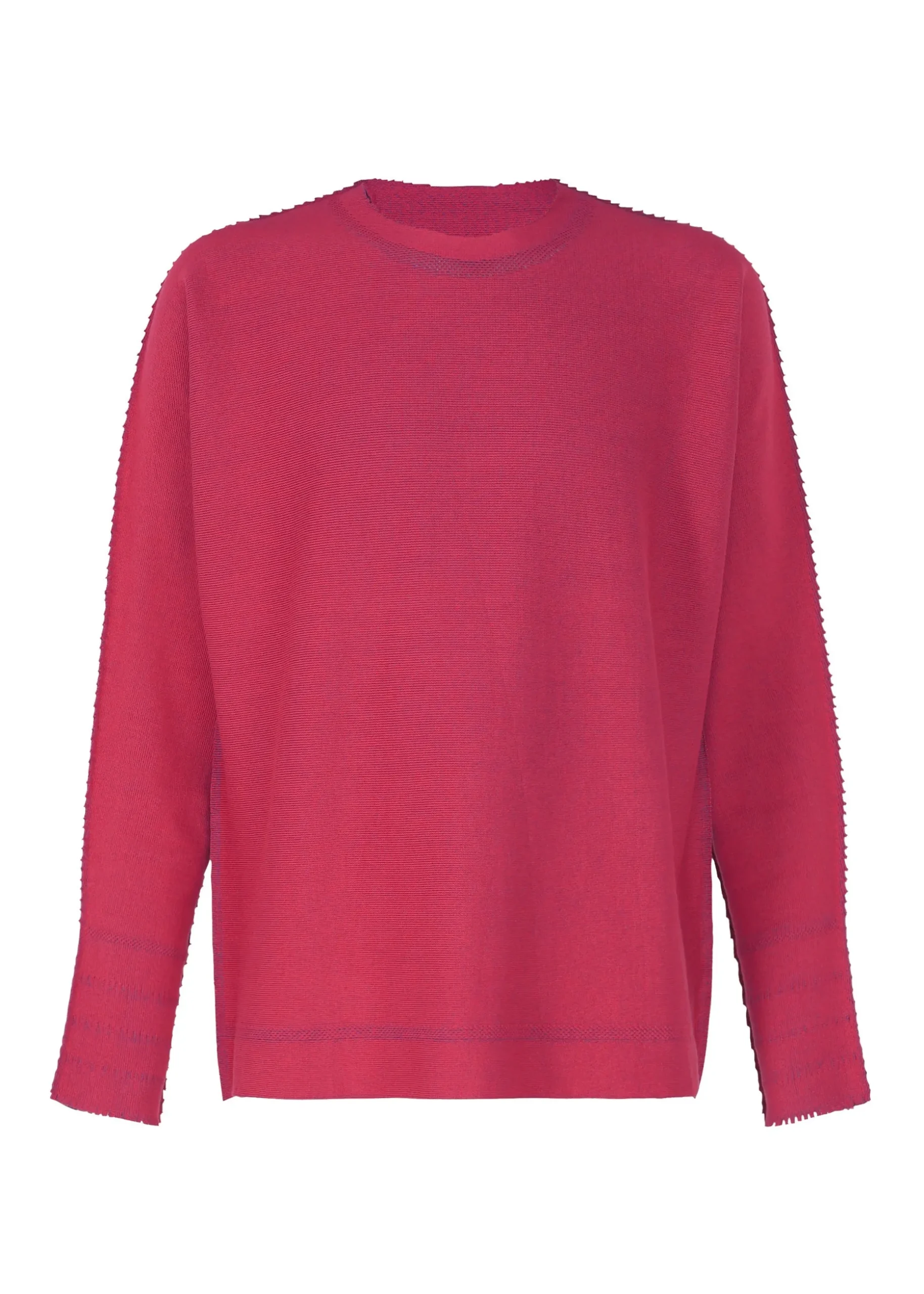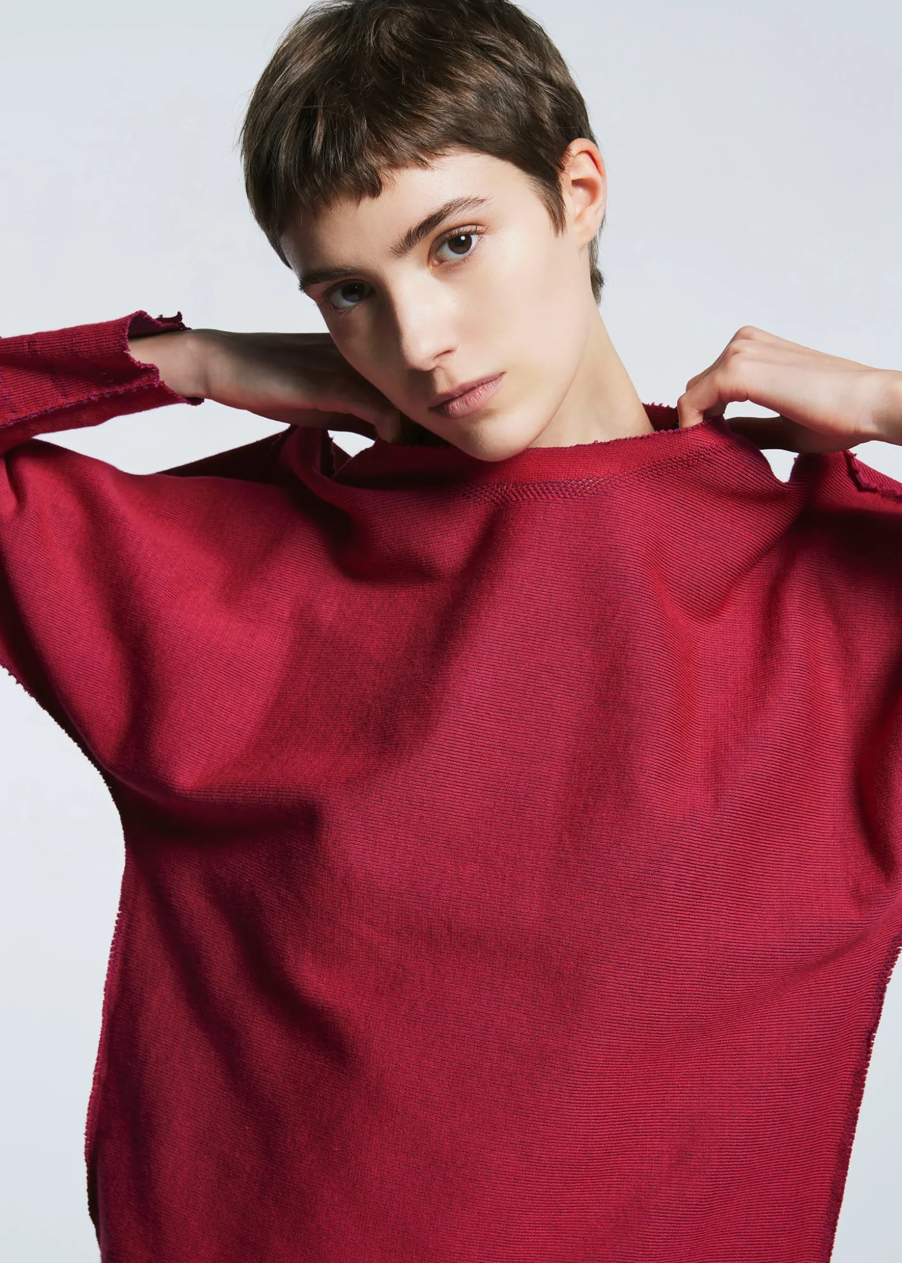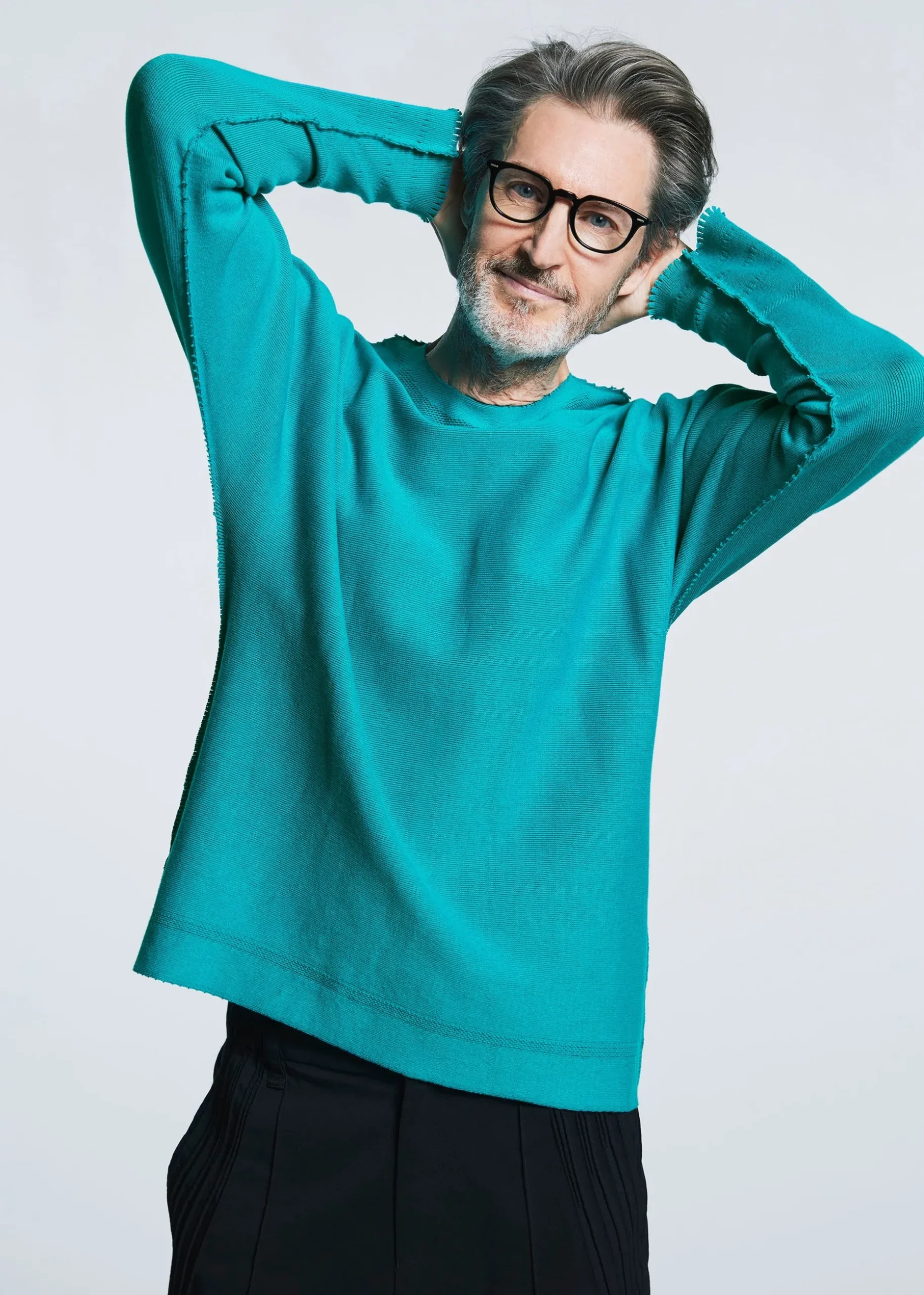 This round-neck, long-sleeved knit top is made using a technique of cutting garments from tube-shaped fabric, which has been continuously evolving since the creation of A-POC. By dyeing the front and back sides of the fabric separately, rich colors with depth were created. The top is made from material that feels comfortable year-round.