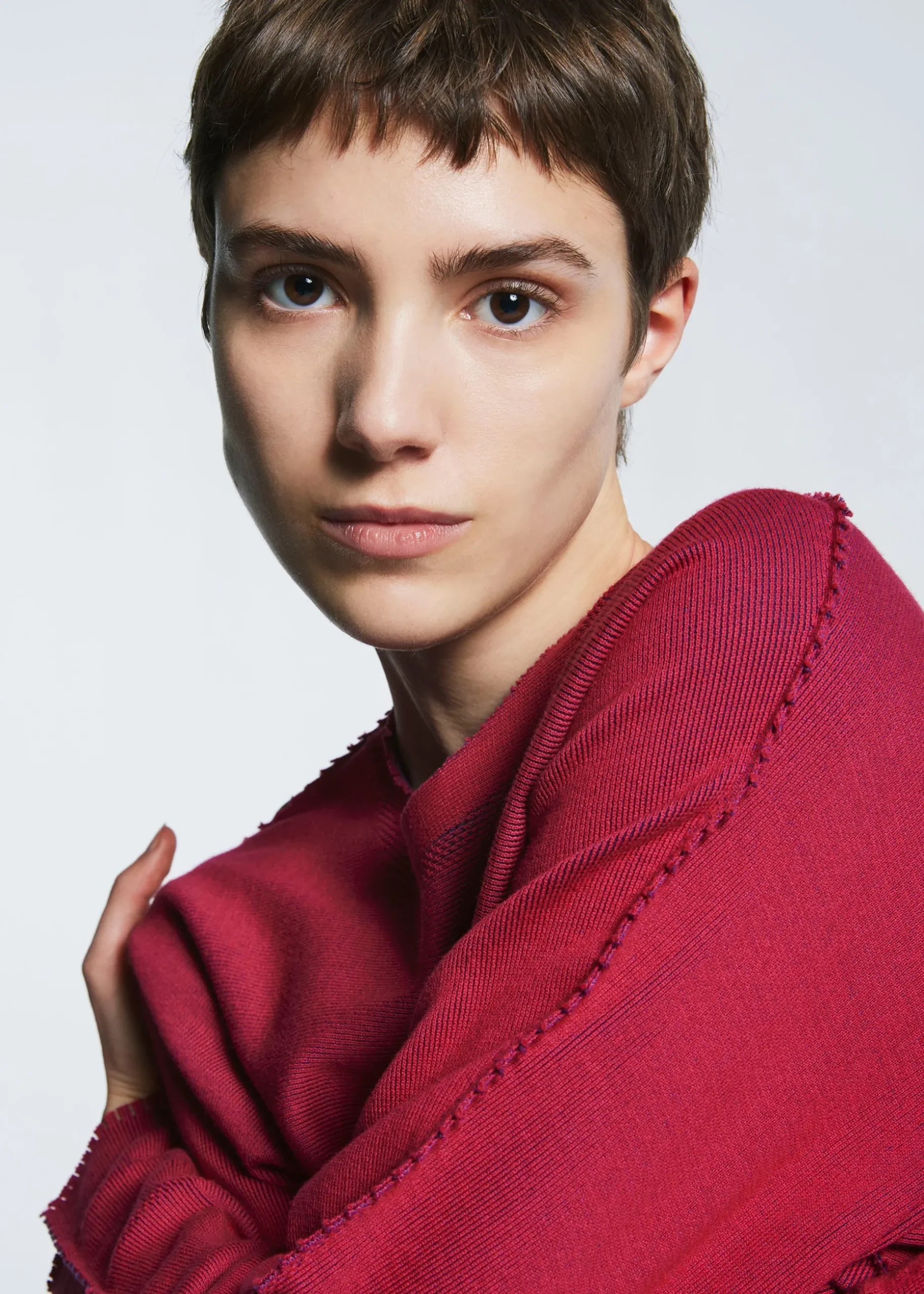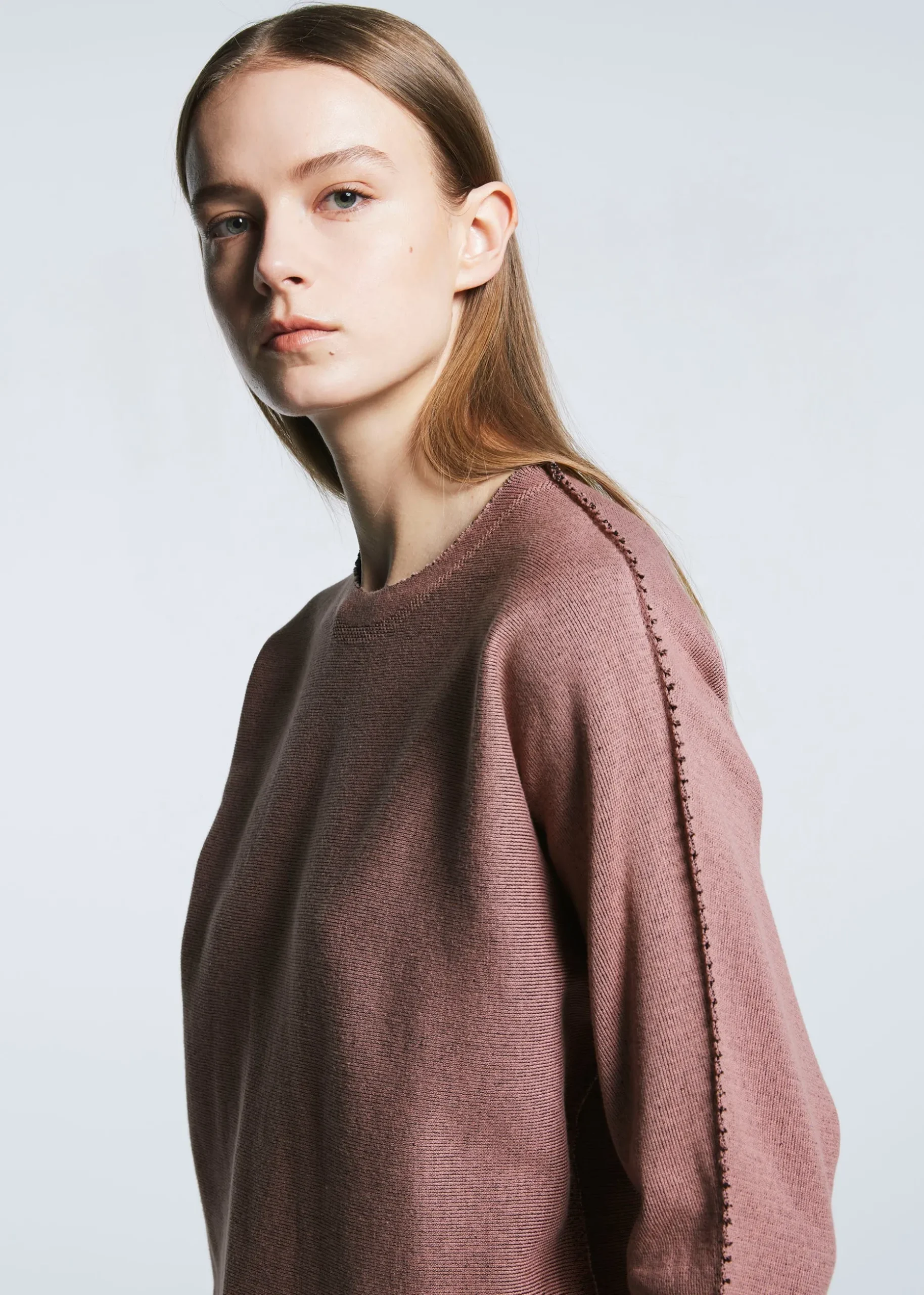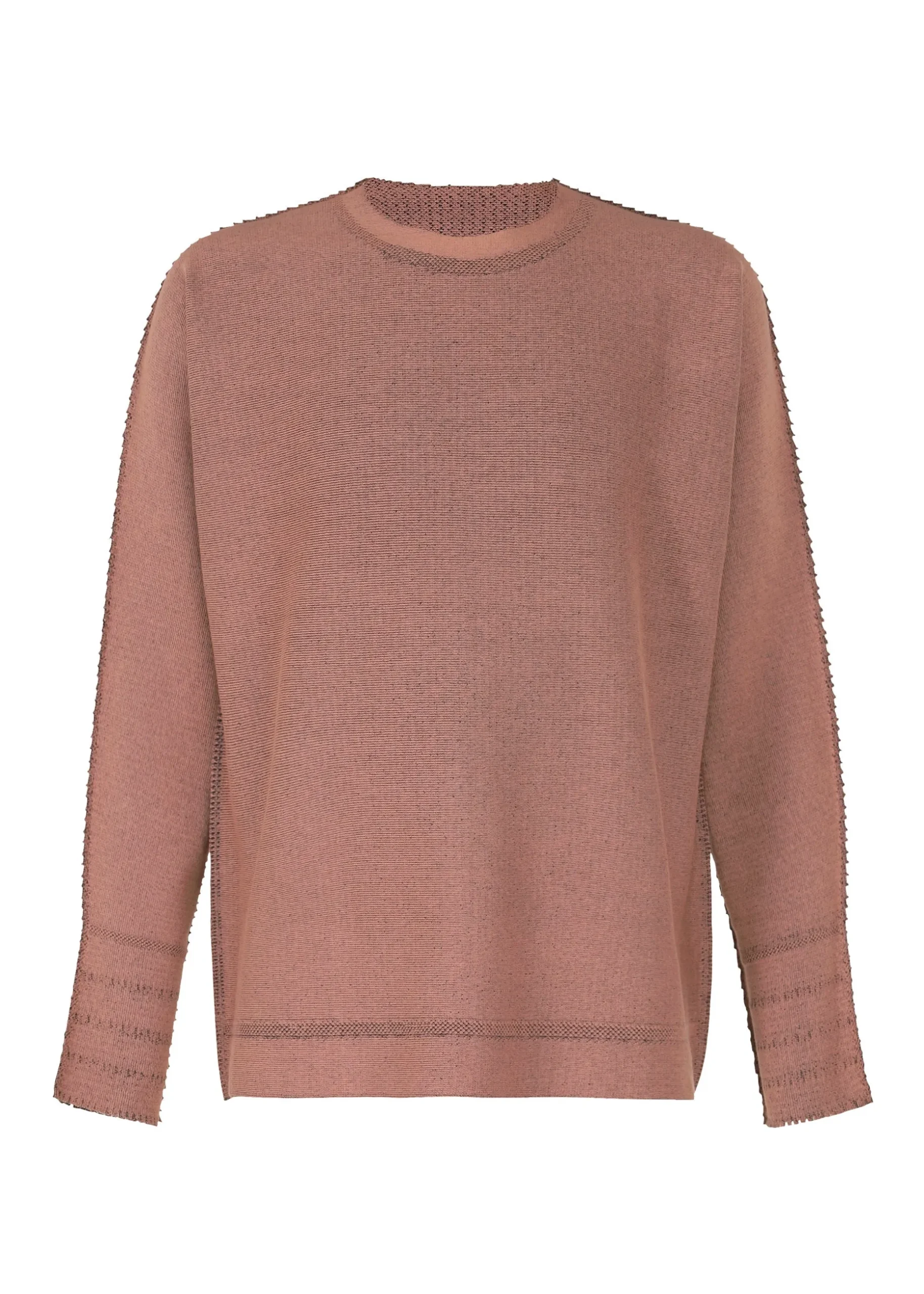 This round-neck, long-sleeved knit top is made using a technique of cutting garments from tube-shaped fabric, which has been continuously evolving since the creation of A-POC. By dyeing the front and back sides of the fabric separately, rich colors with depth were created. The top is made from material that feels comfortable year-round.