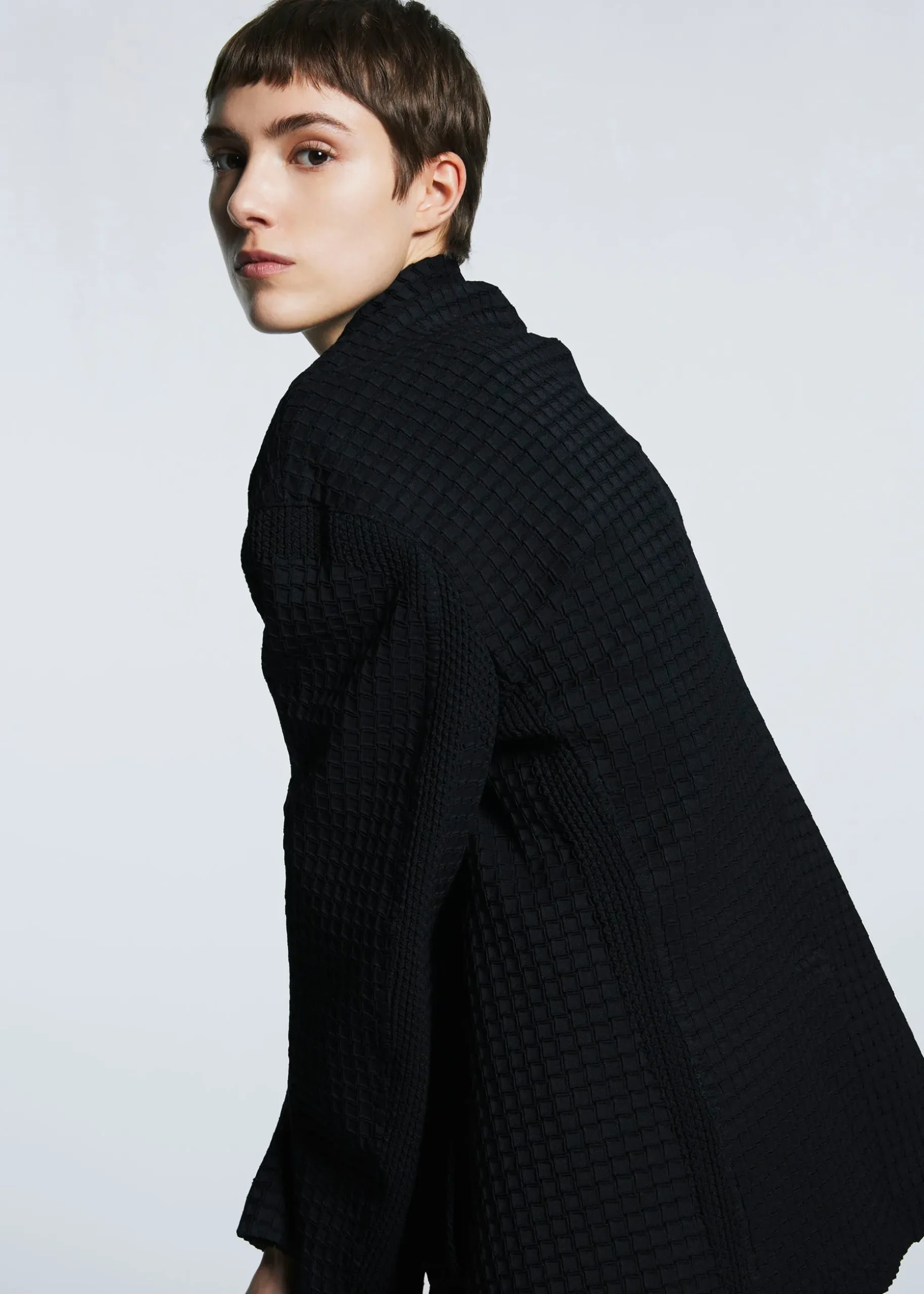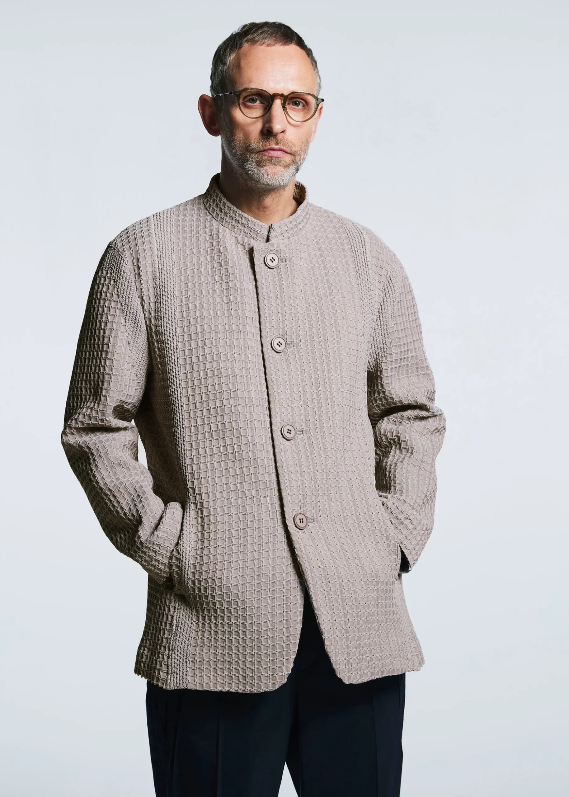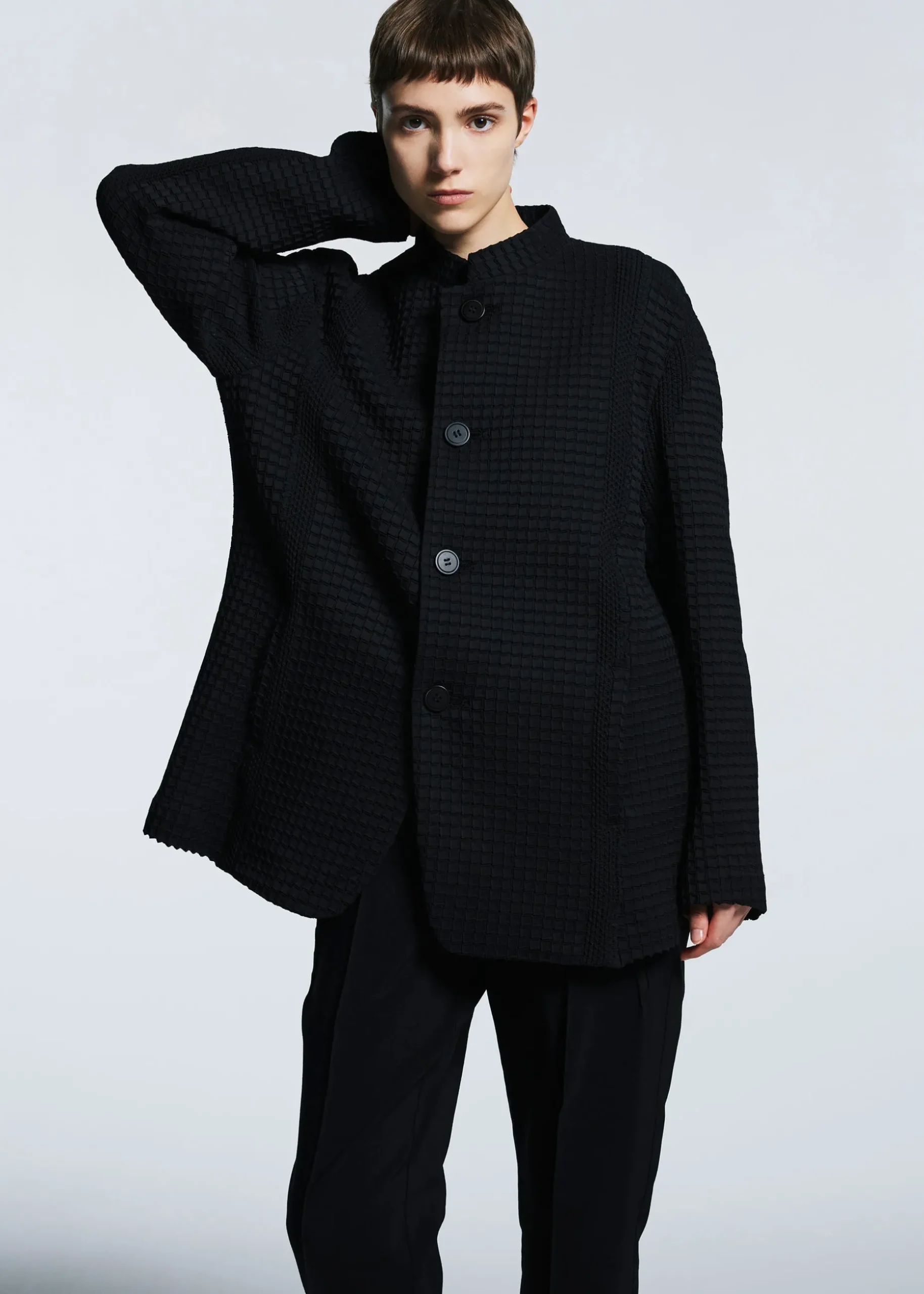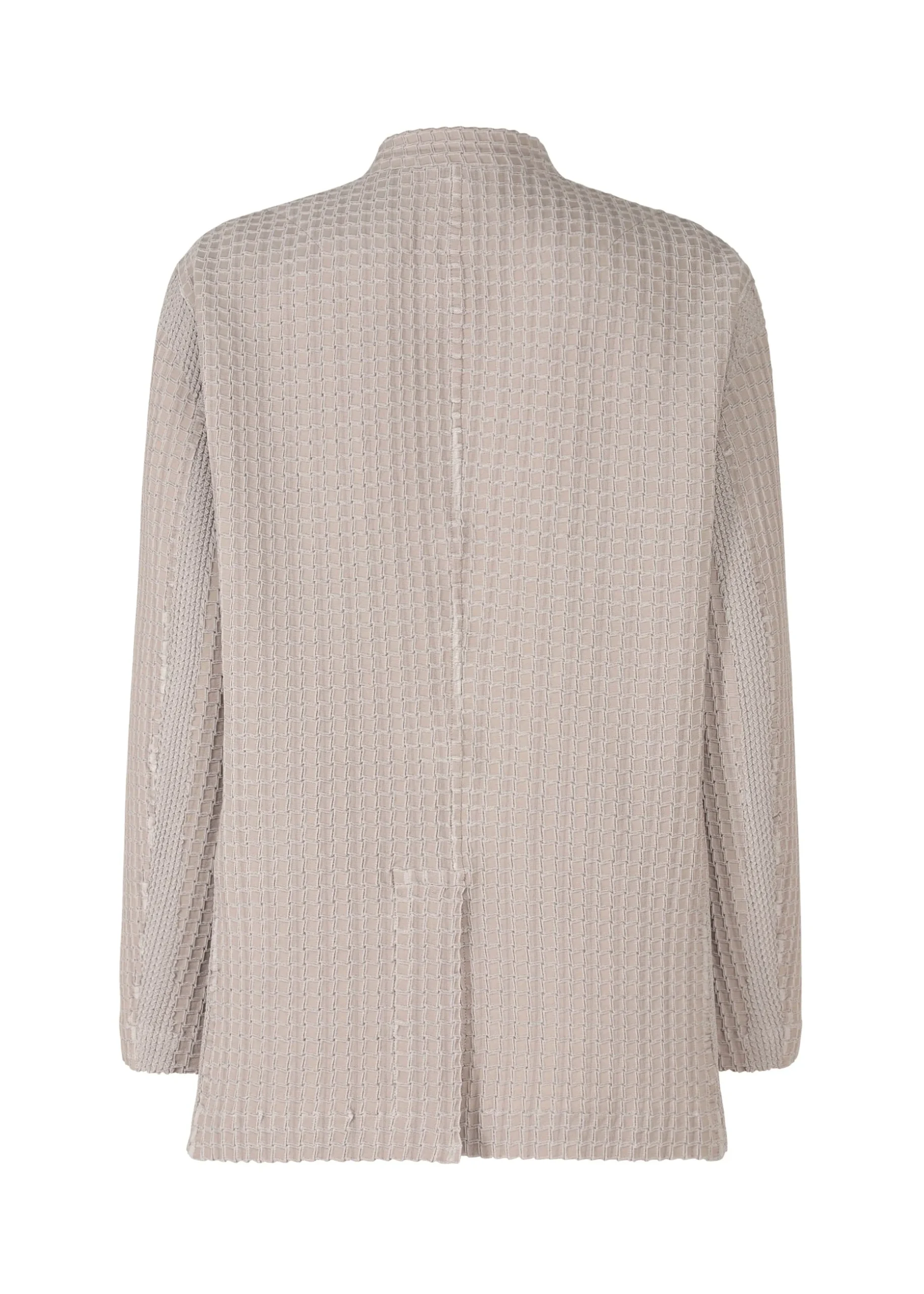 This jacket with a standing collar is characterized by its grid-shaped pleats created using the Steam Stretch* technique. It has excellent stretchiness, and can be used in a wide range of situations, from formal to casual.