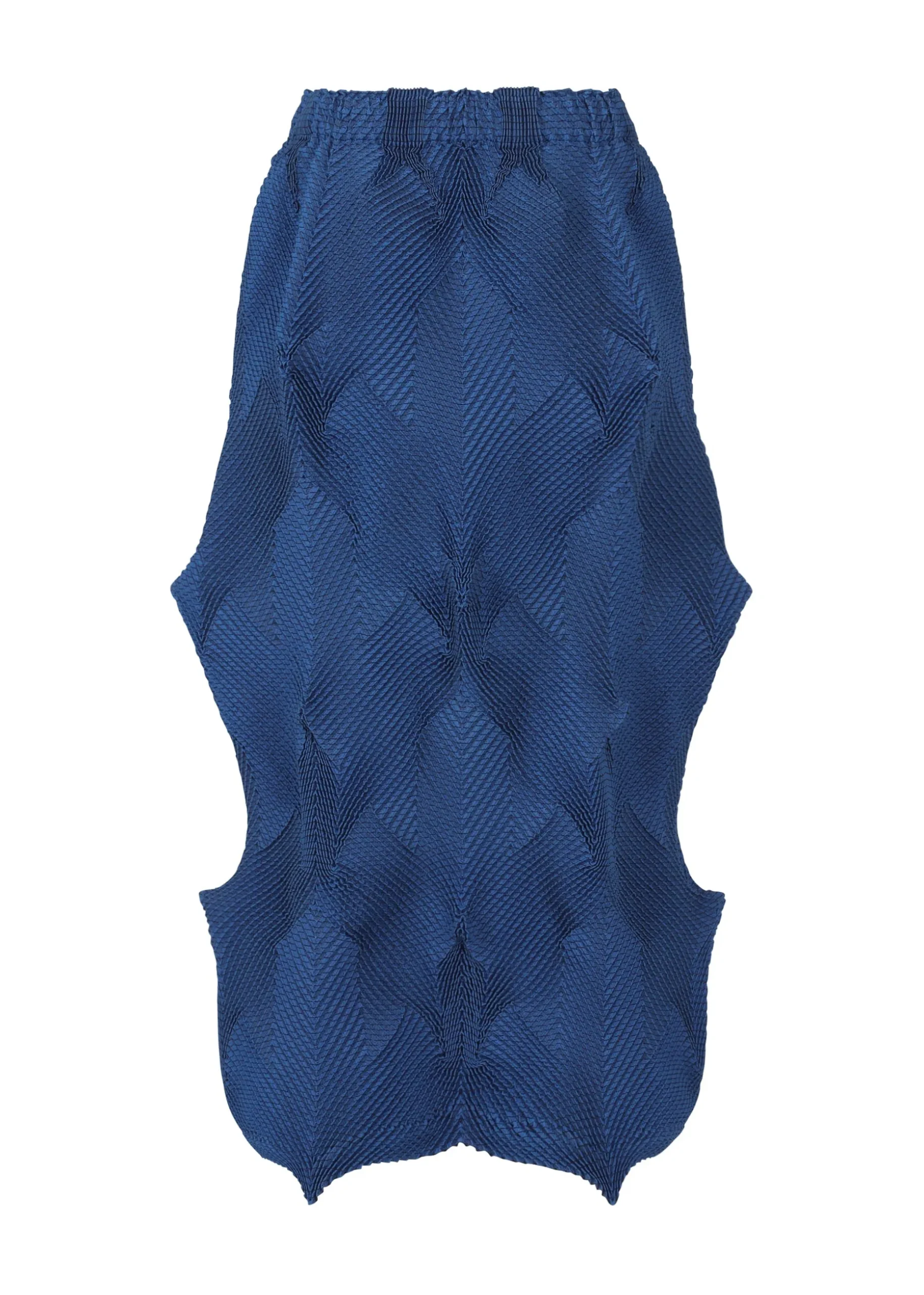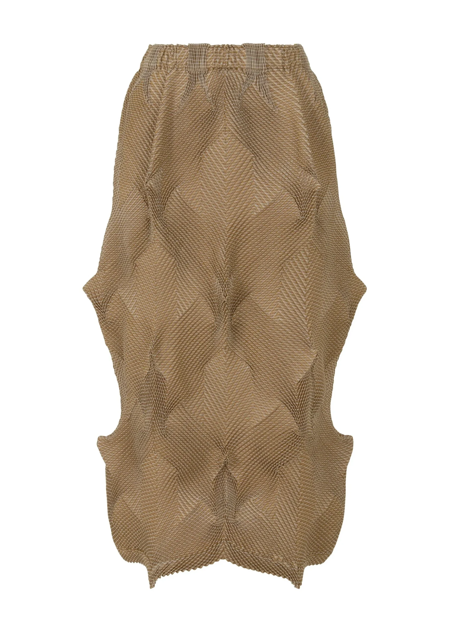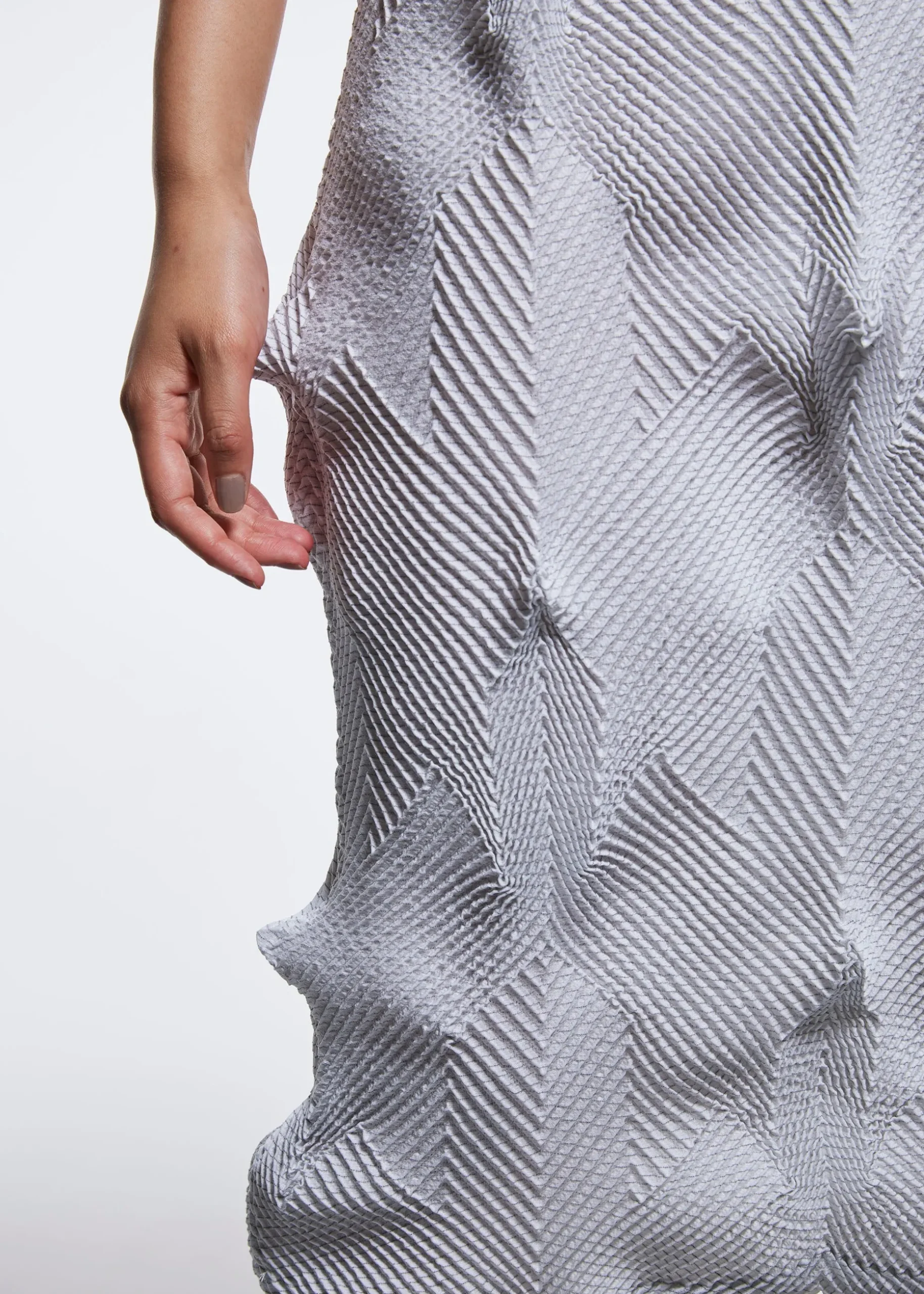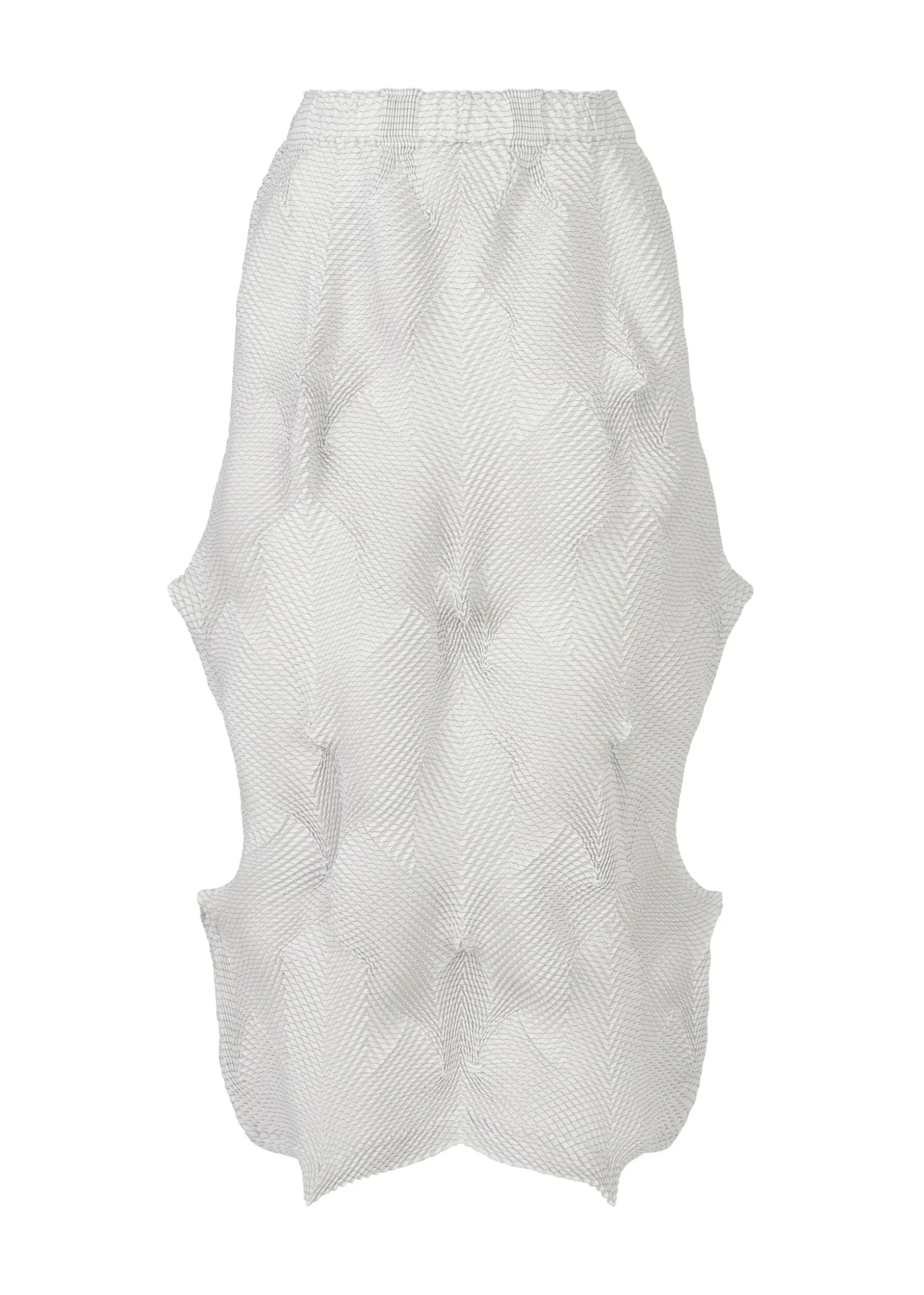 This skirt is characterized by its pleated shape created using the Steam Stretch* technique arranged in a houndstooth pattern. It is soft like knitwear and has a loose fit that is moderately separated from the body. It is made from partially plant-derived polyester and recycled polyester thread.