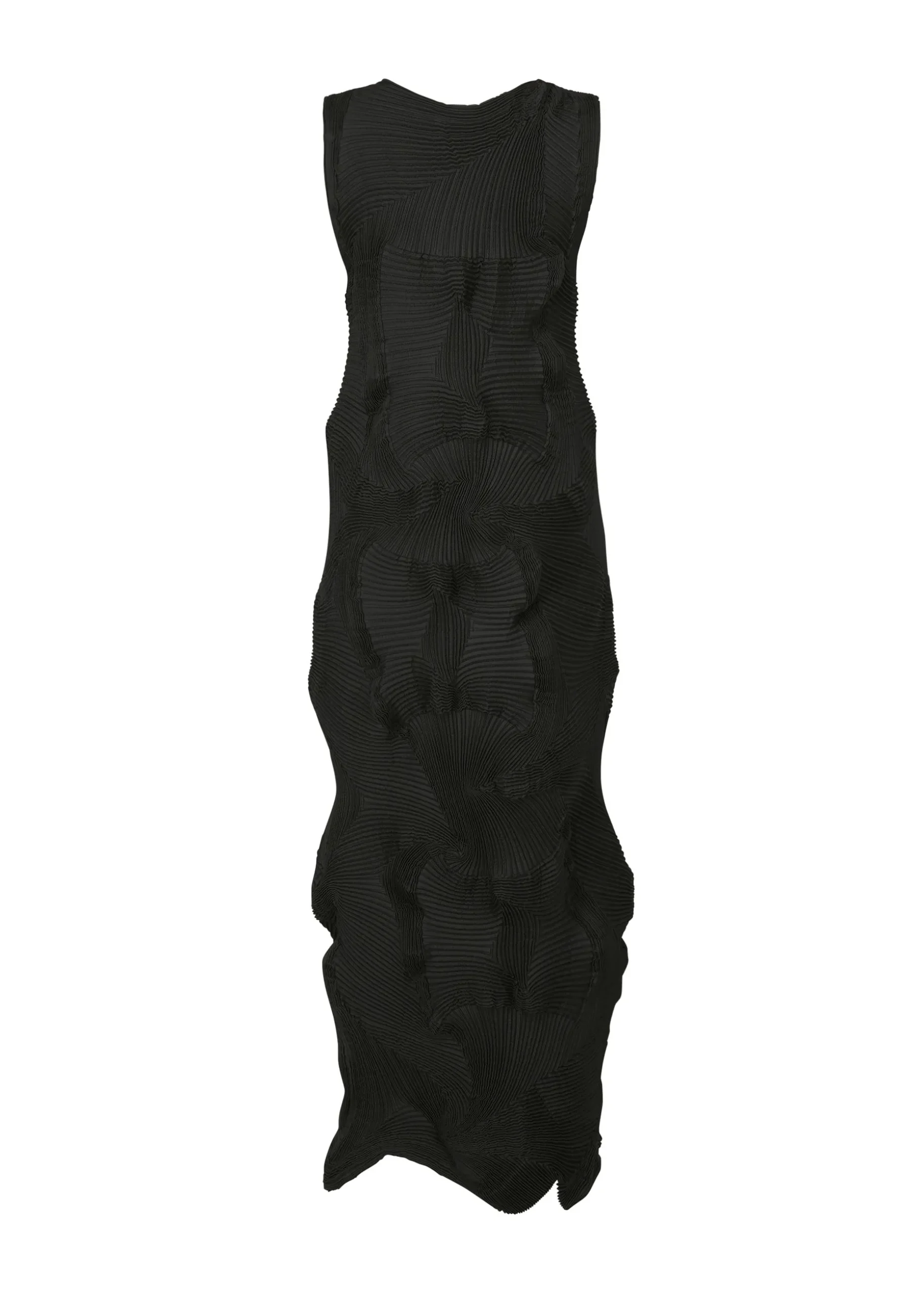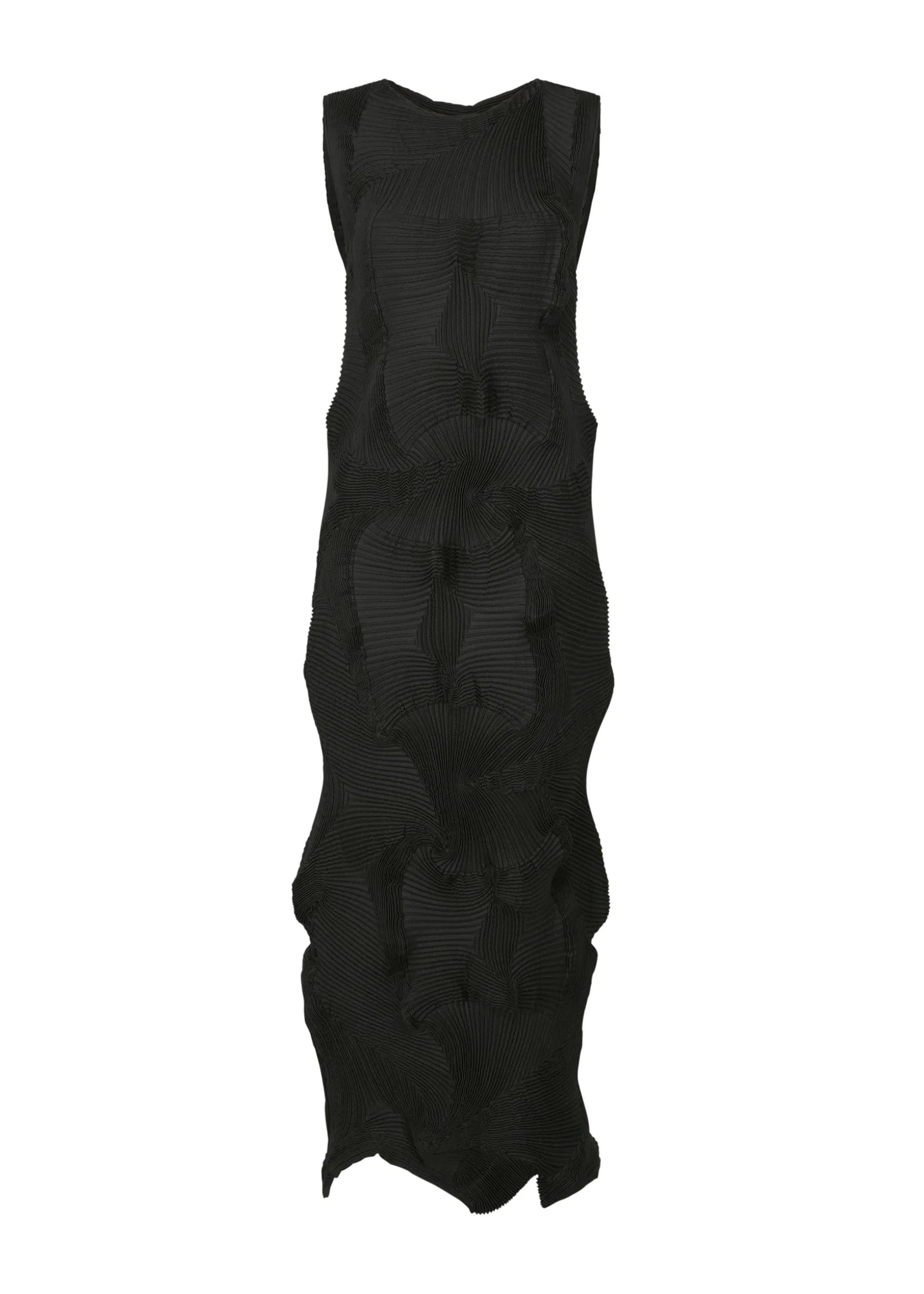 This sleeveless pleated dress has a slim shape and subtle v-neck.