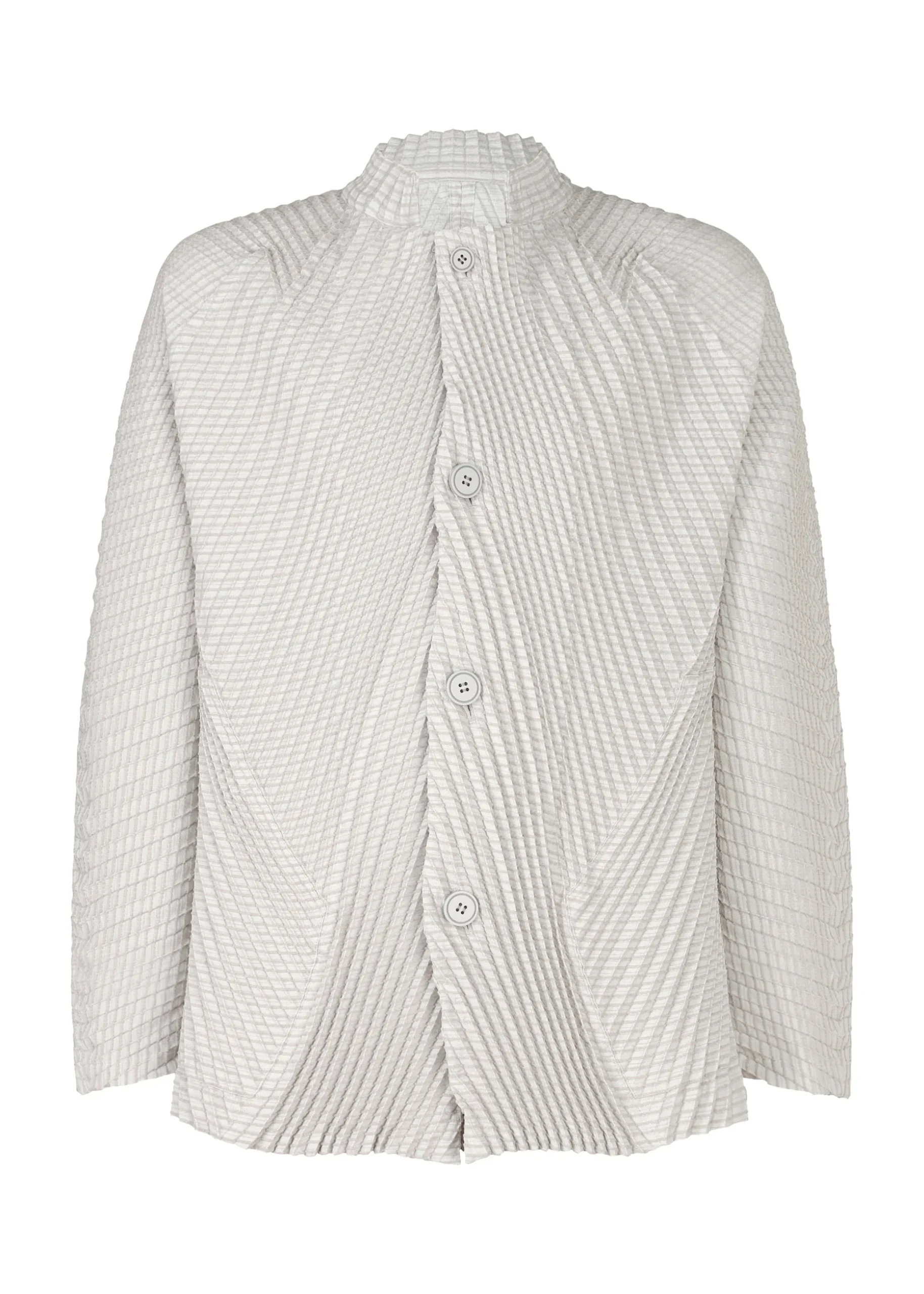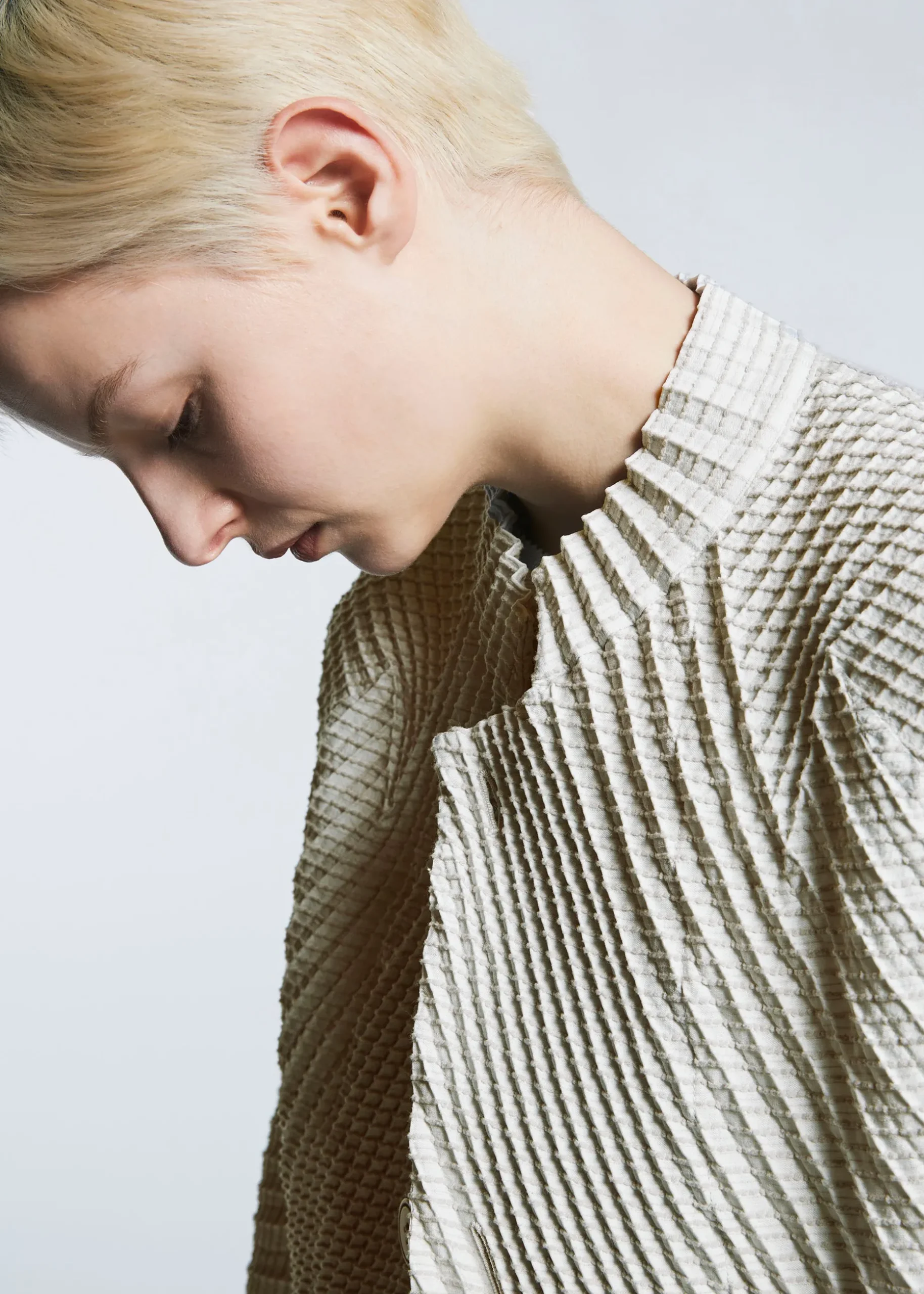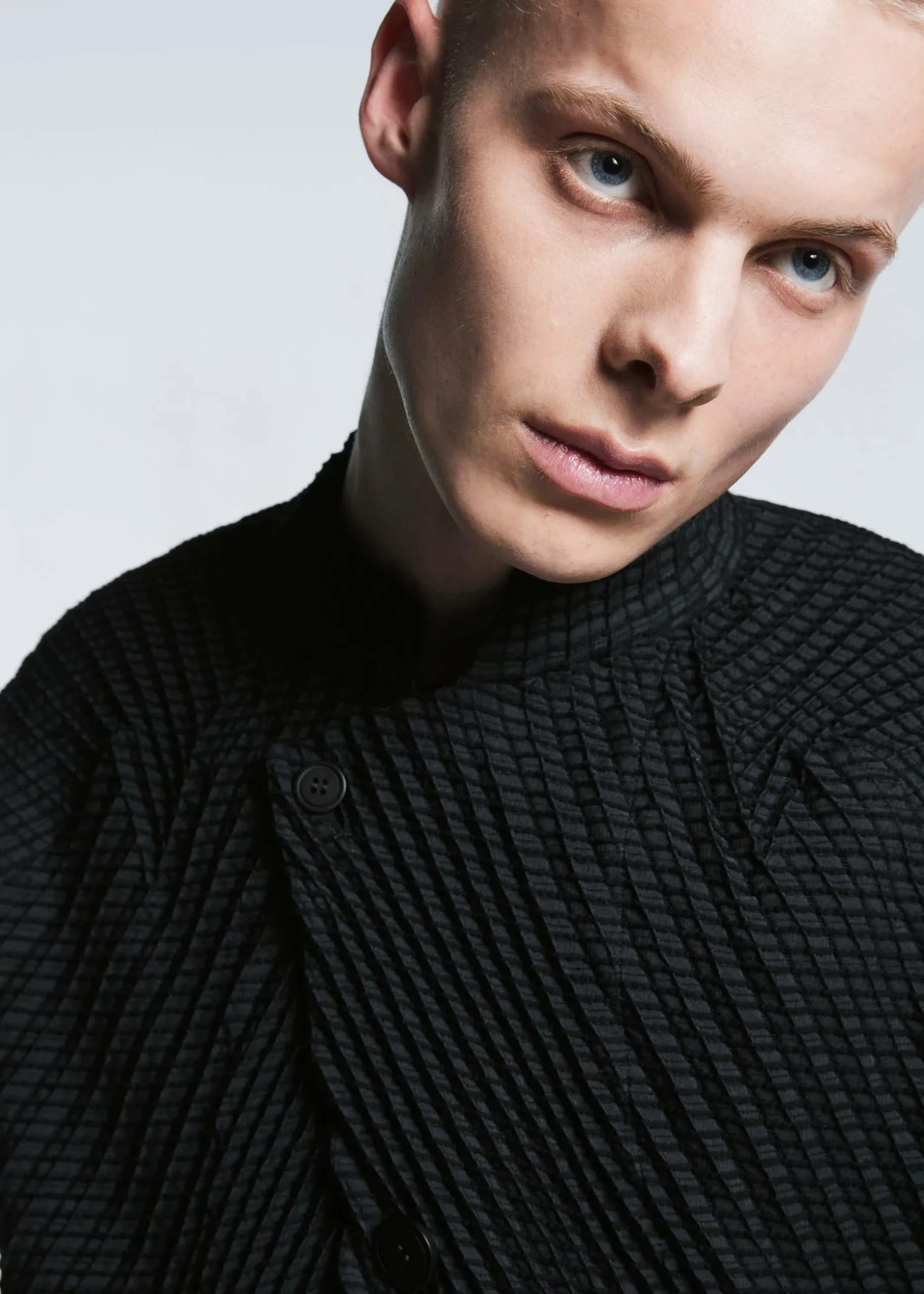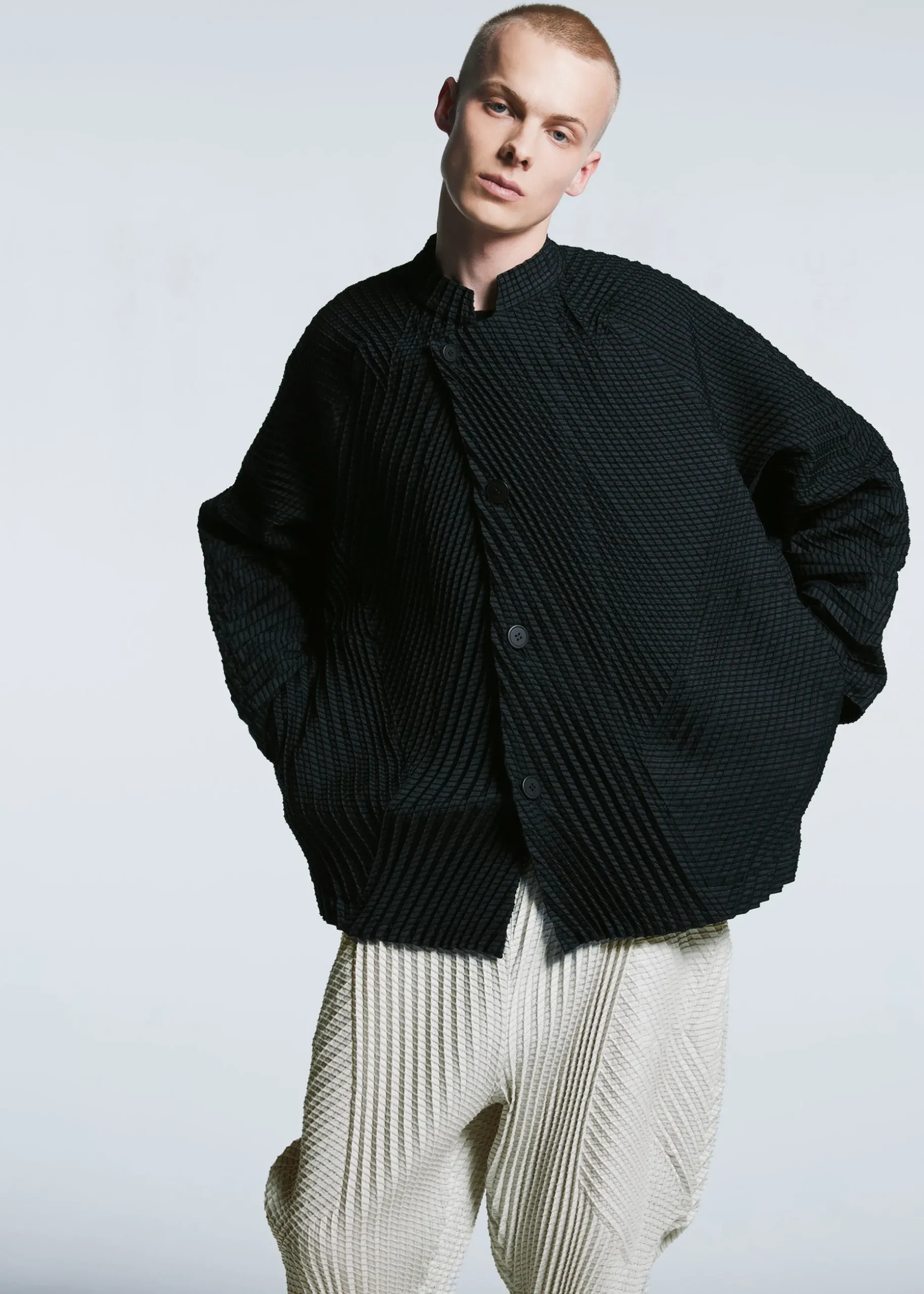 Featuring dynamic diagonal pleating, TYPE-O 013 offers silhouettes that create soft volume and flow across the body. This series utilizes the highly advanced “Steam Stretch” technique, which uses special threads that shrink in specific places when steam is applied. This method creates three-dimensional pleated shapes and durable garments that are machine washable and maintain their shape over time.