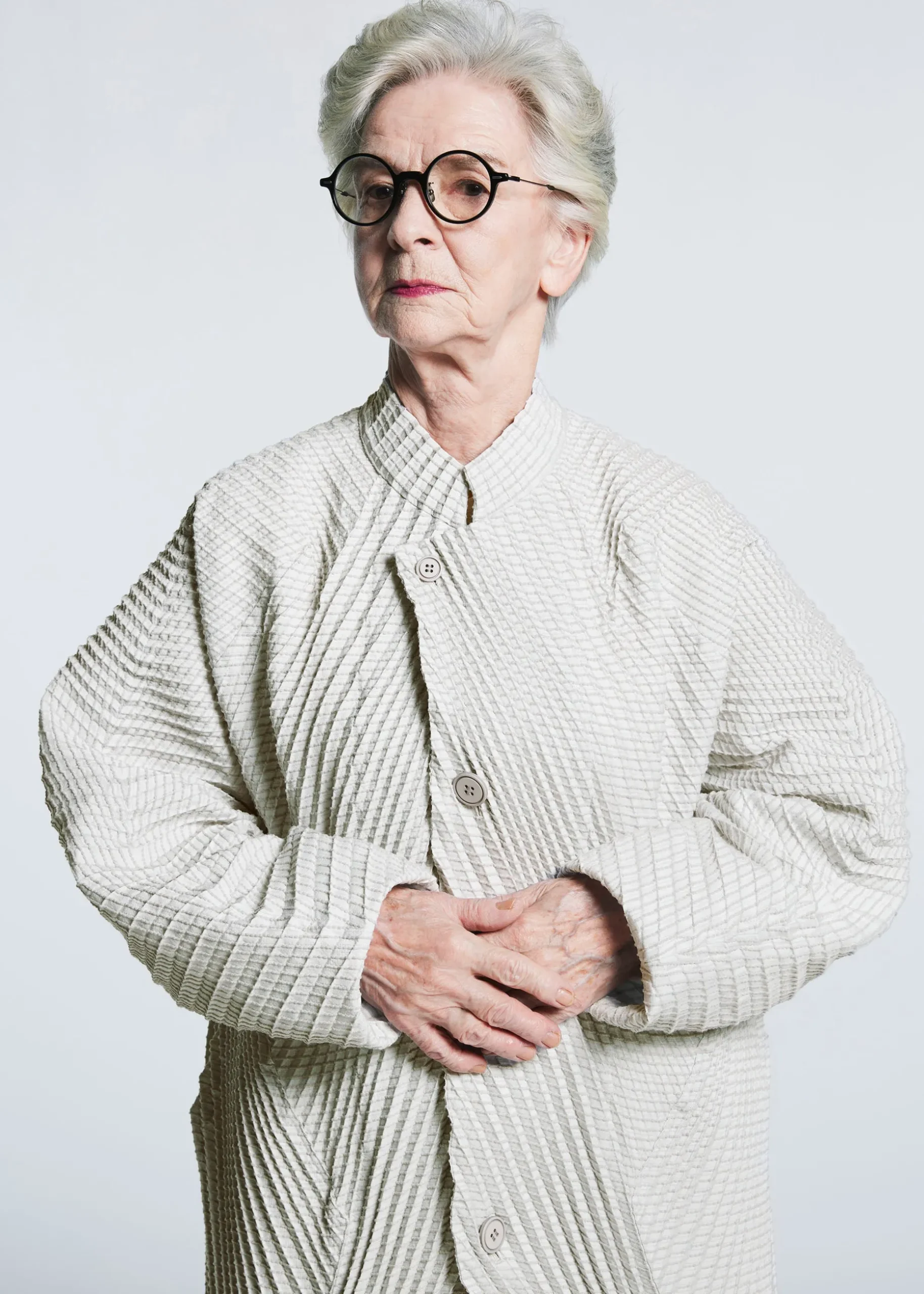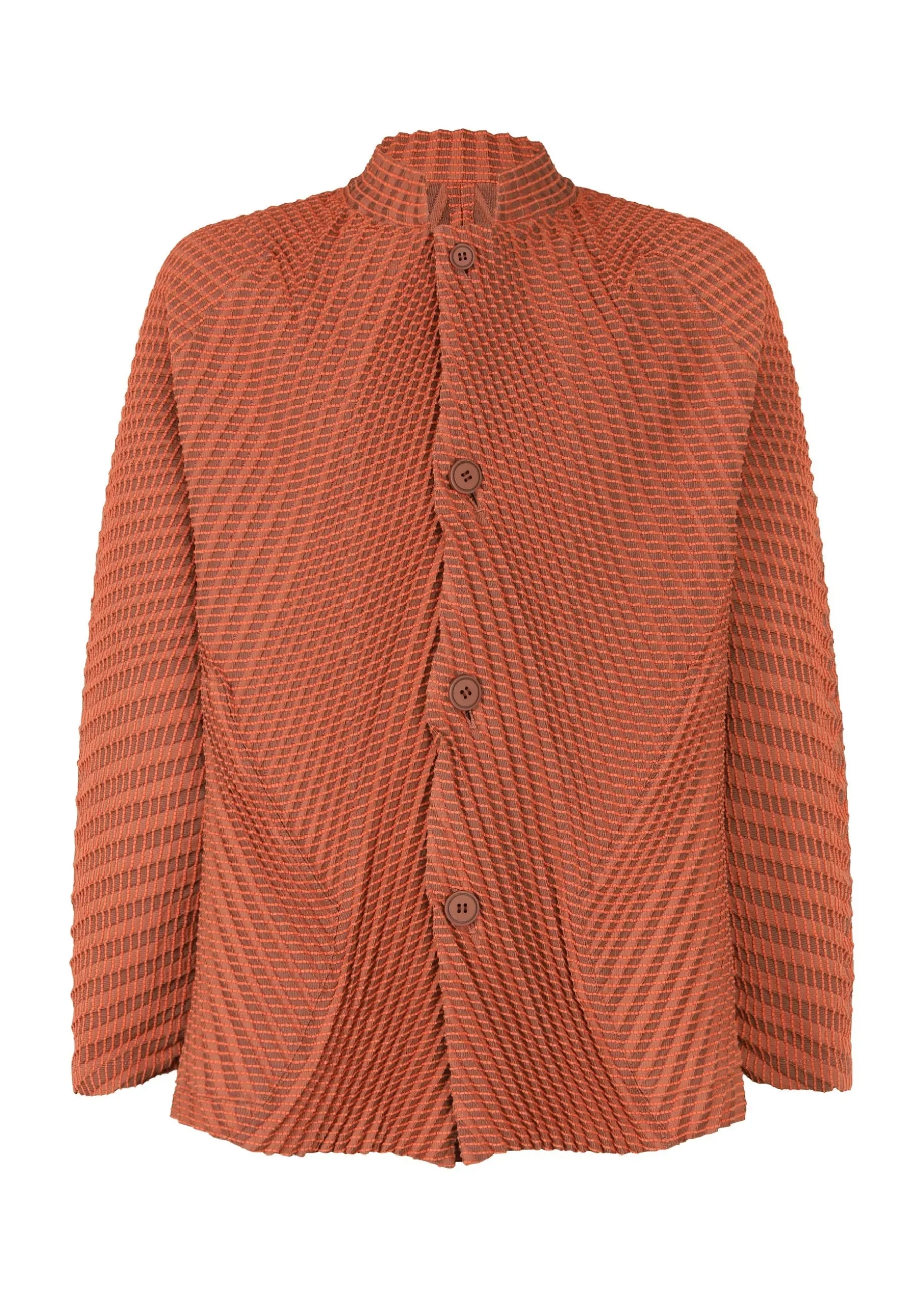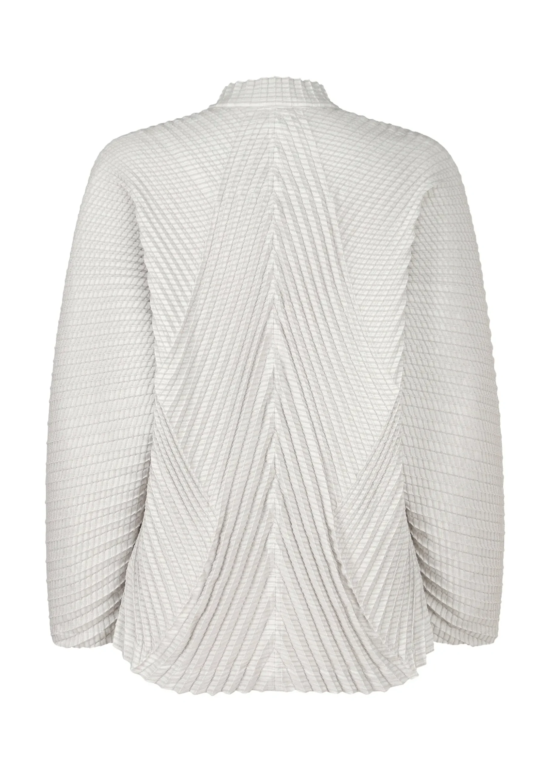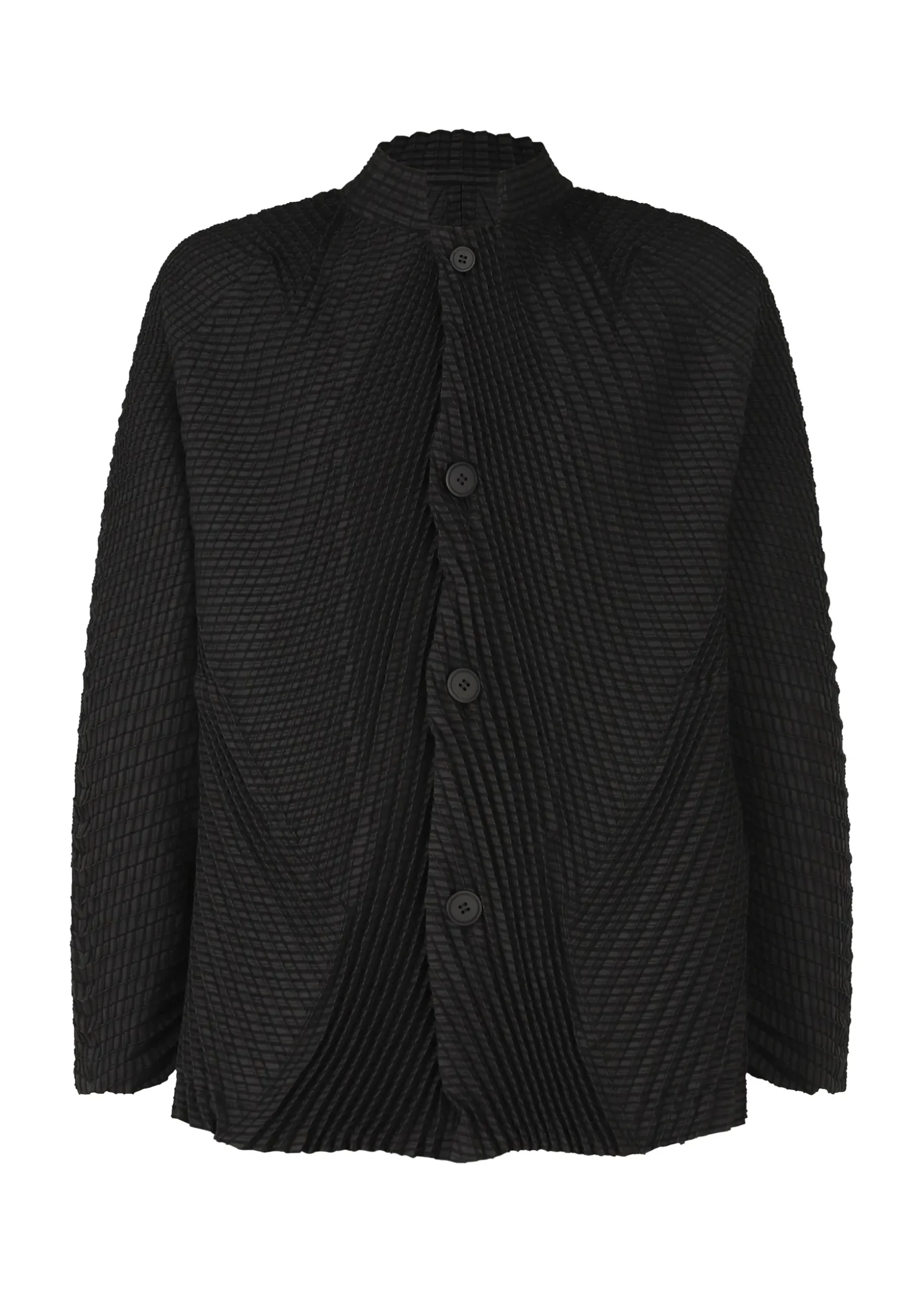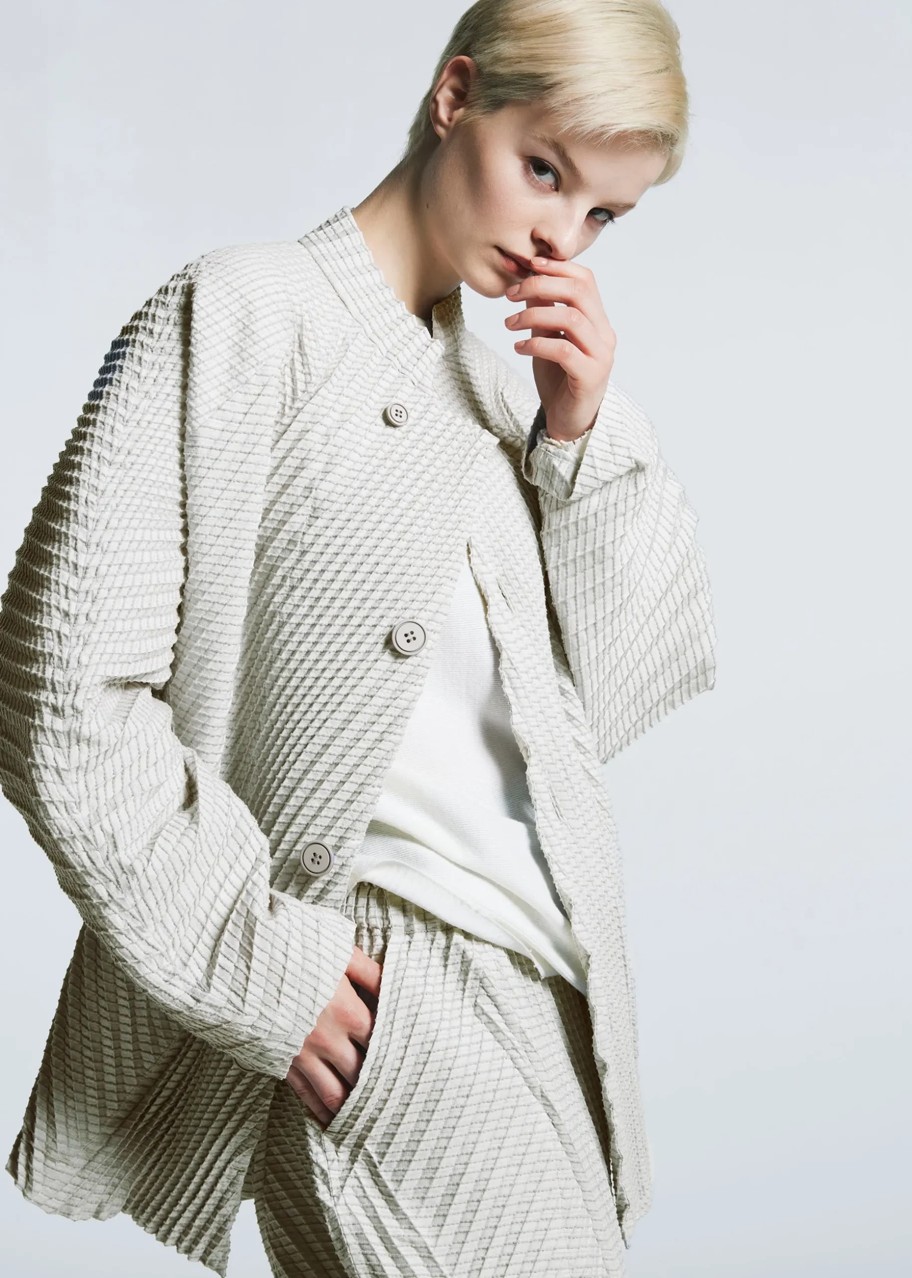 Featuring dynamic diagonal pleating, TYPE-O 013 offers silhouettes that create soft volume and flow across the body. This series utilizes the highly advanced “Steam Stretch” technique, which uses special threads that shrink in specific places when steam is applied. This method creates three-dimensional pleated shapes and durable garments that are machine washable and maintain their shape over time.