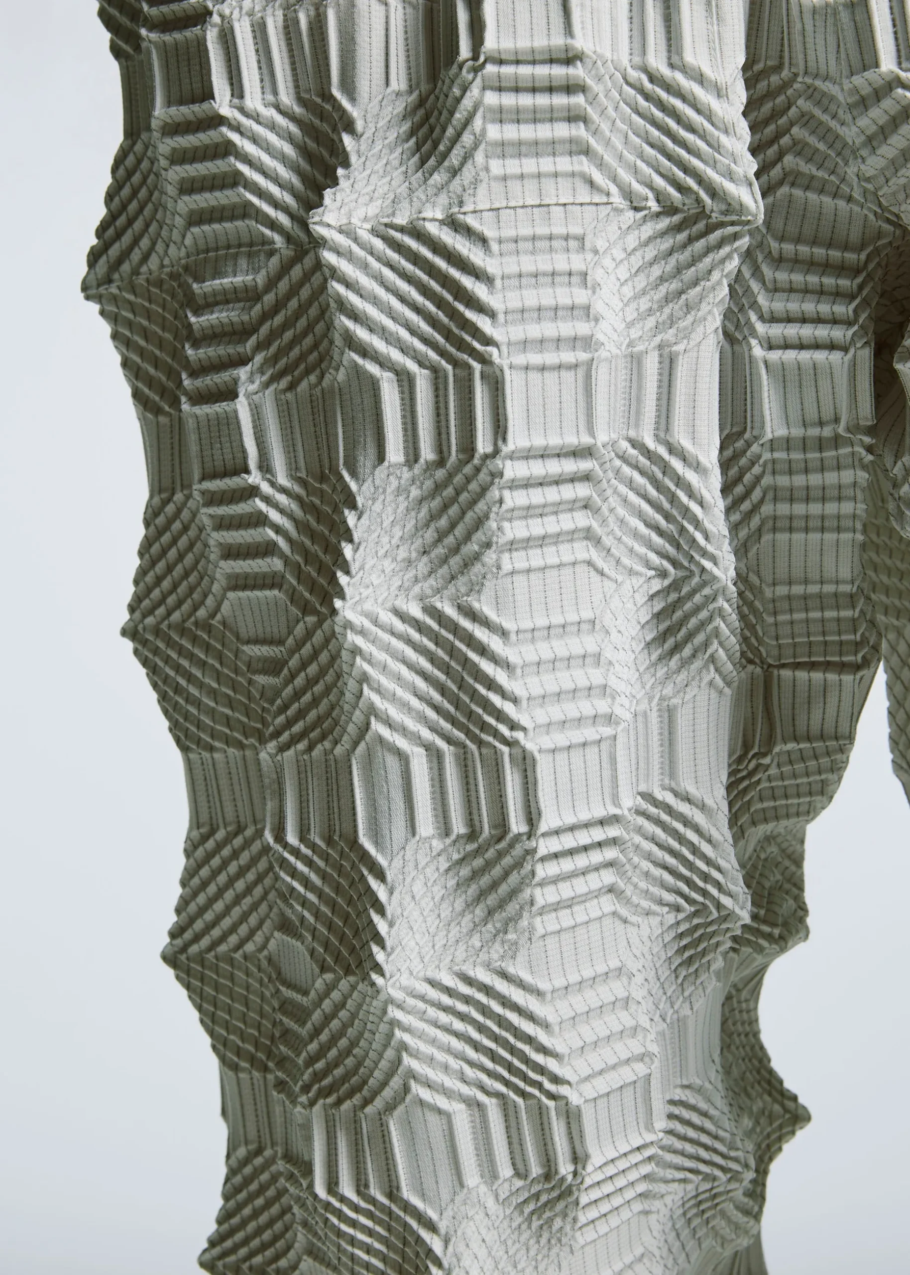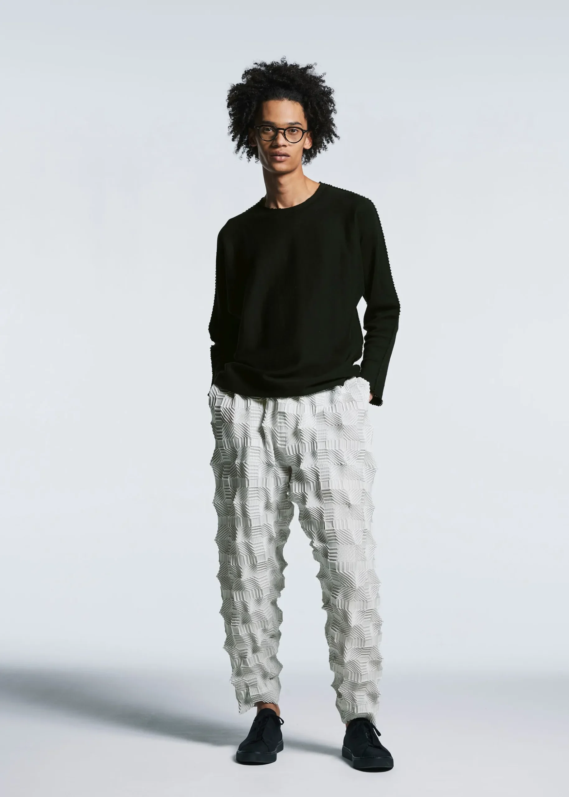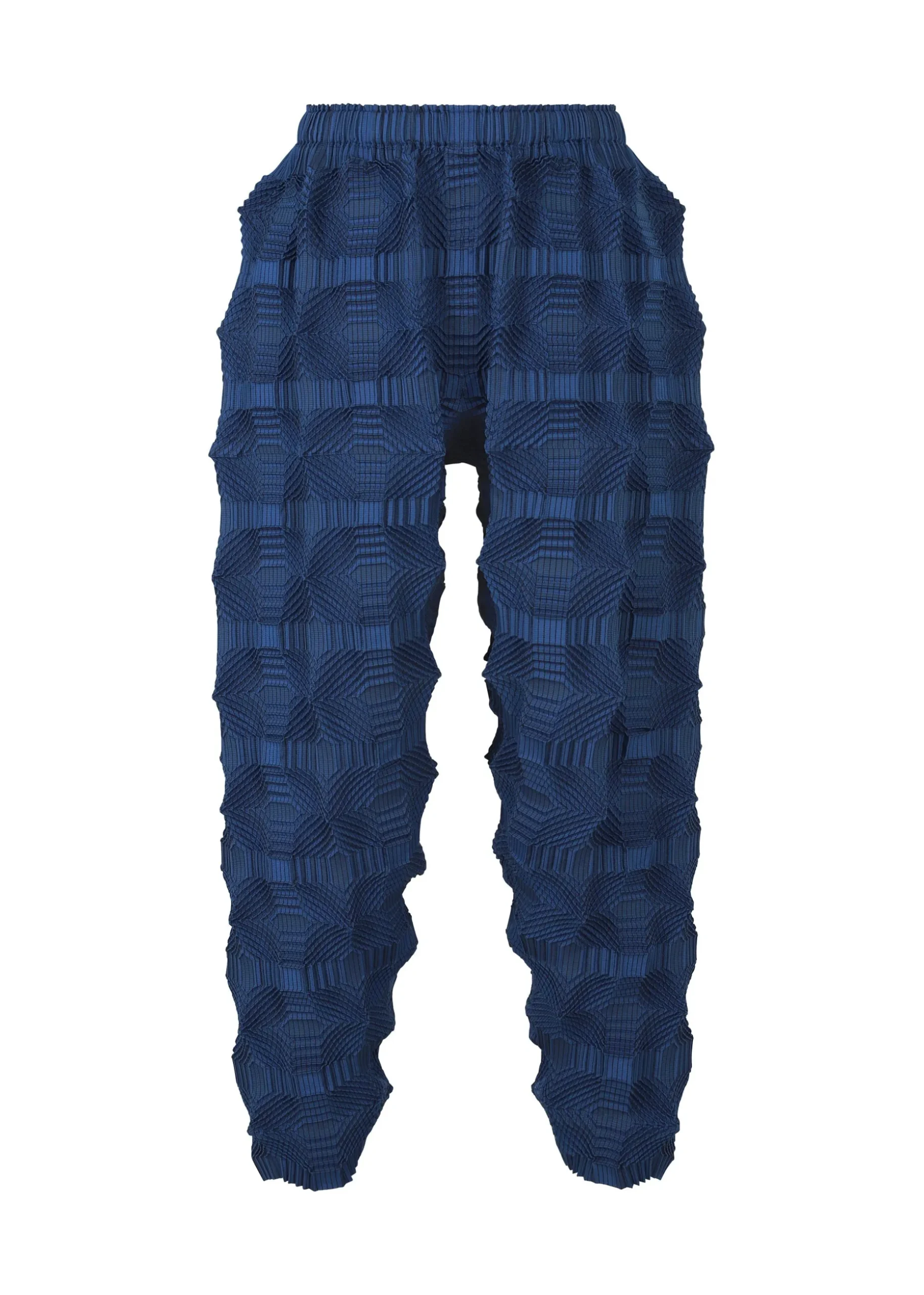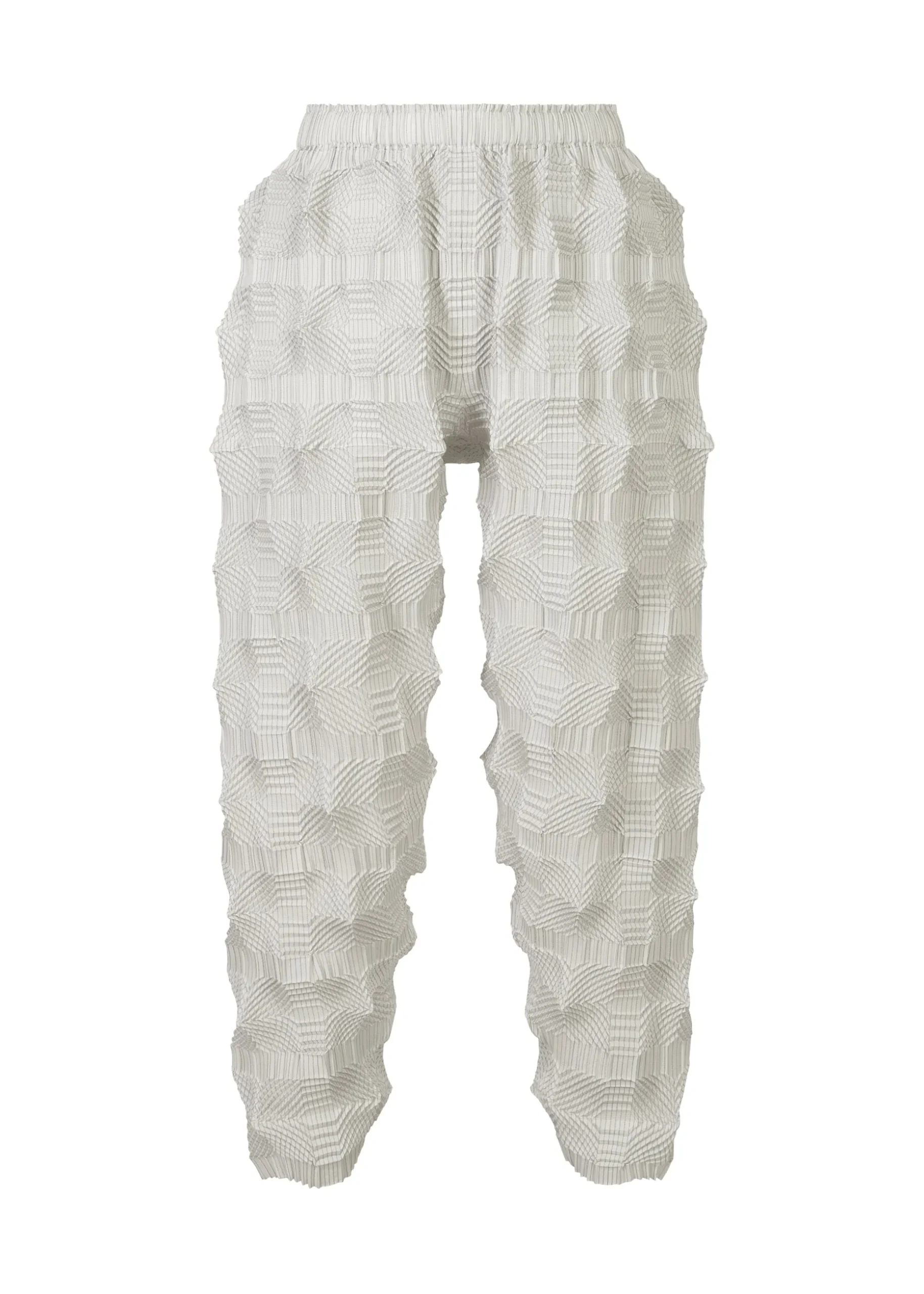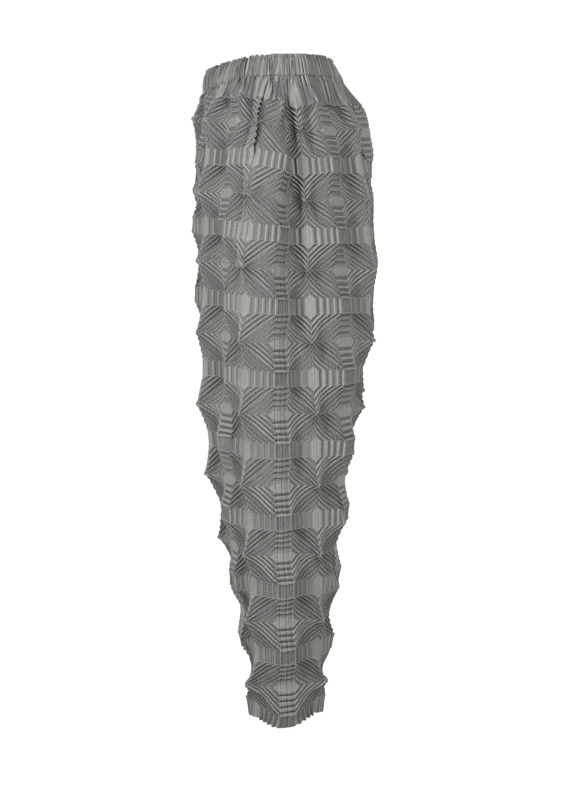 These pants have a pattern of regularly arranged squares designed using the Steam Stretch* technique. They are characterized by its unevenness created by the shrinkage of the lines within the square pattern, as well as the voluminous feel with knit-like comfort.