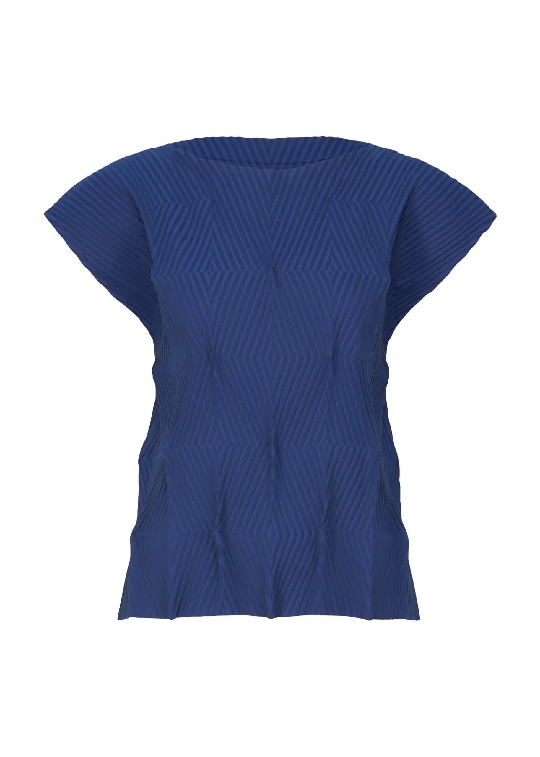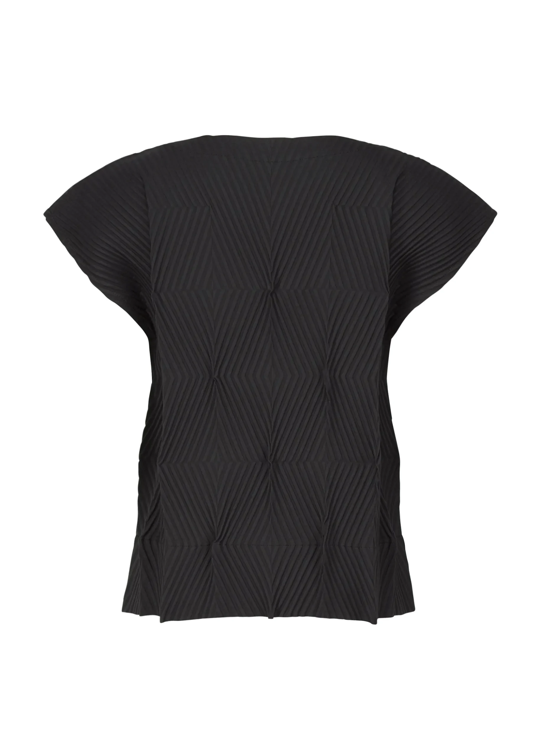 This pleated shirt has a straight fit, short cap sleeves, and a crew neck.