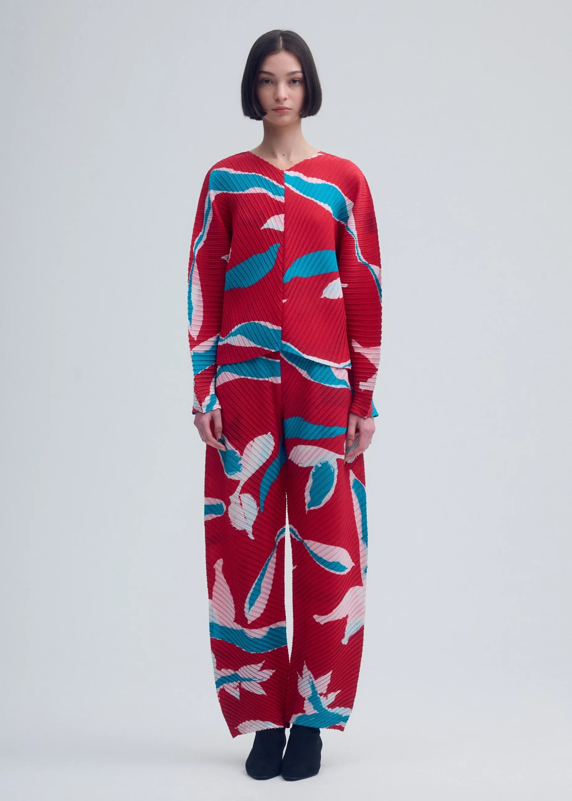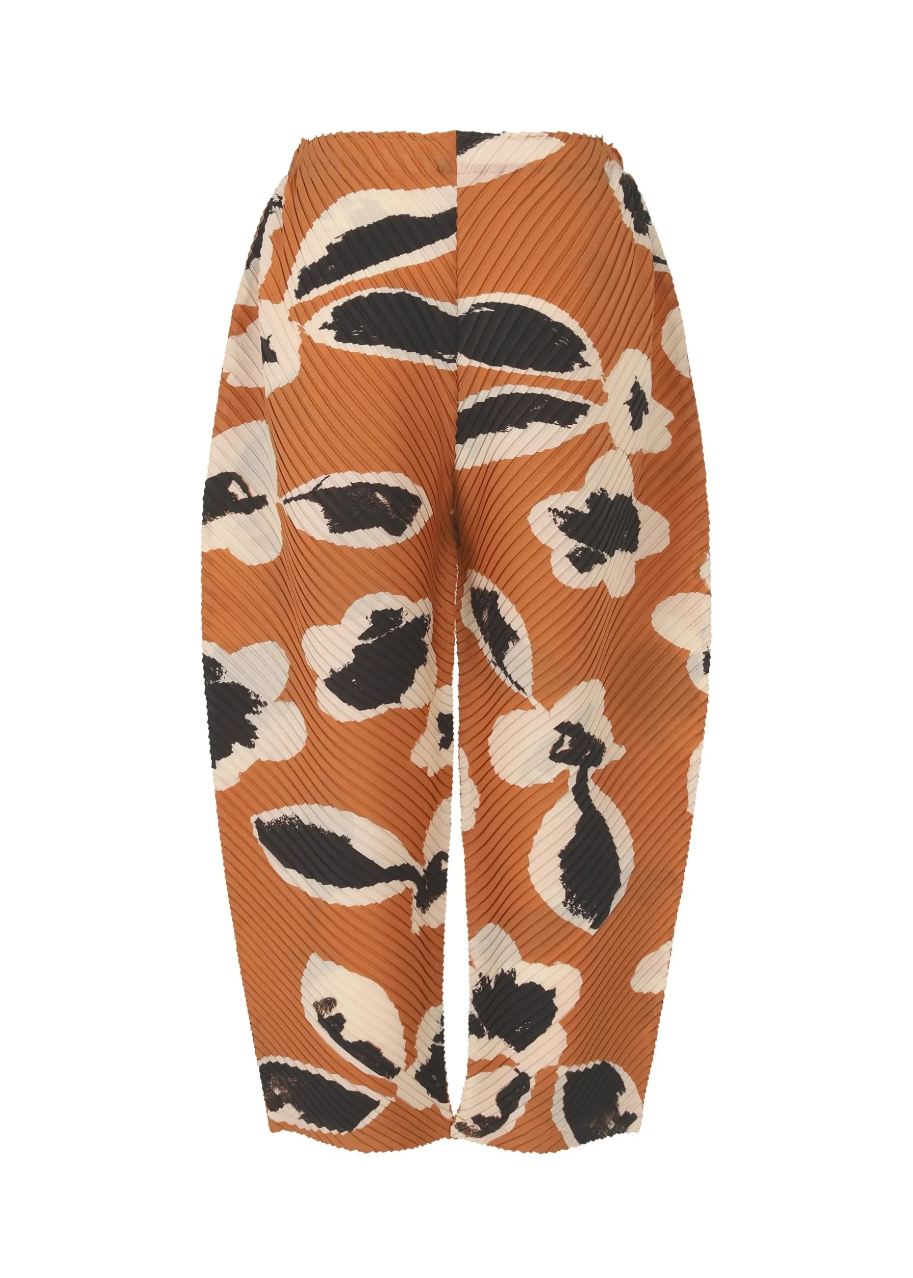 These pleated pants express the vitality and strength of plants through their pattern that combines flowers with drawings. The base pattern was created by applying paint directly to dozens of different plants to make a print, and by layering a silk screen over foliage to apply pigments. Freehand drawings were then added to create a pattern with movement. The pants are made from recycled polyester fabric with an inkjet print that is pleated.