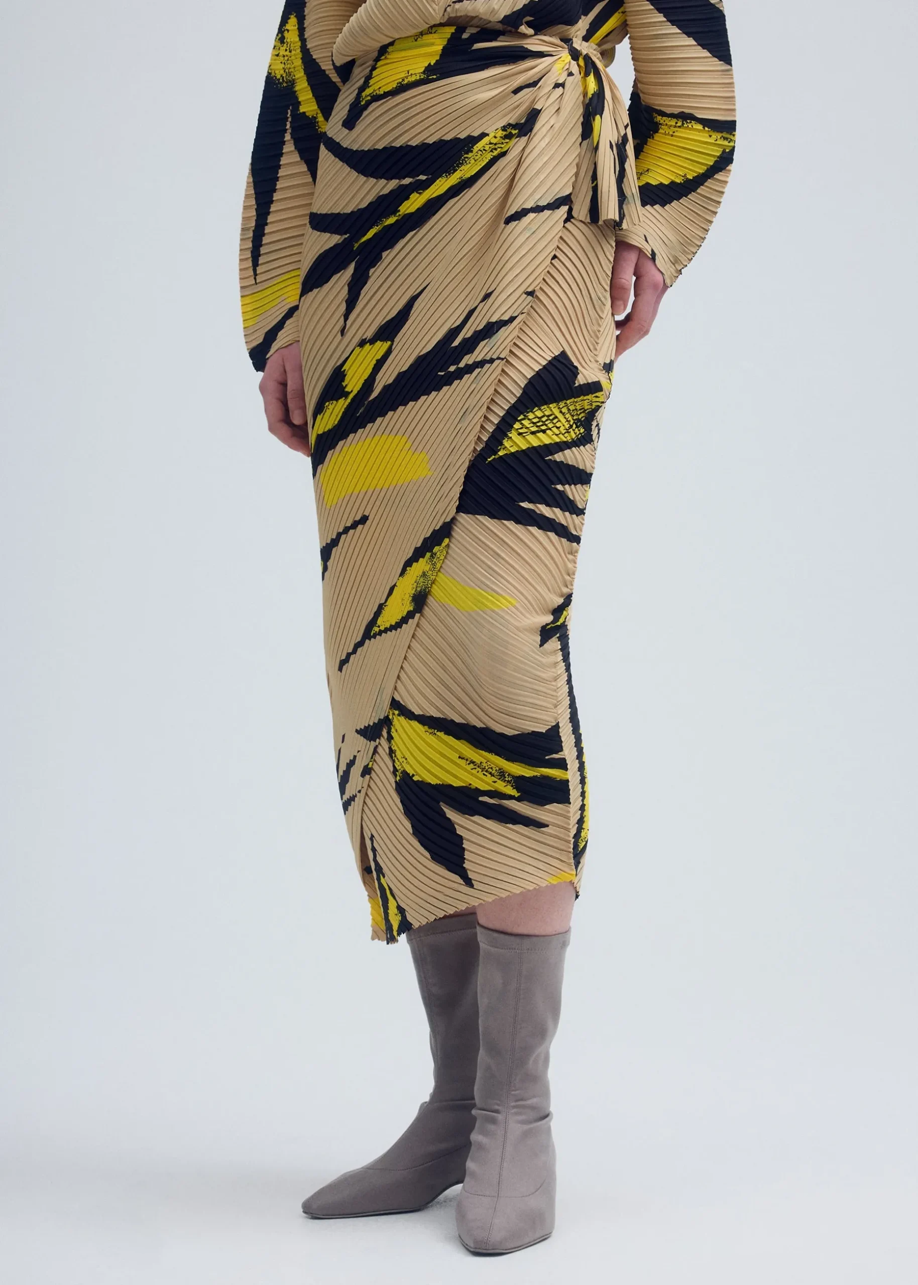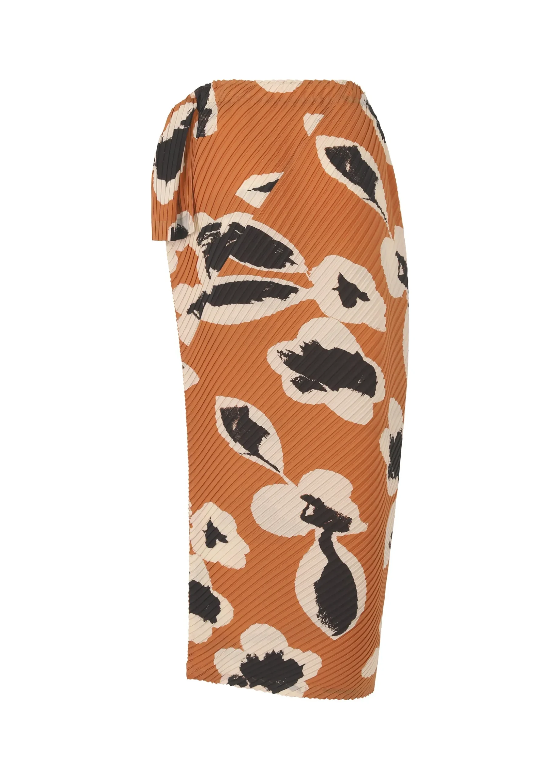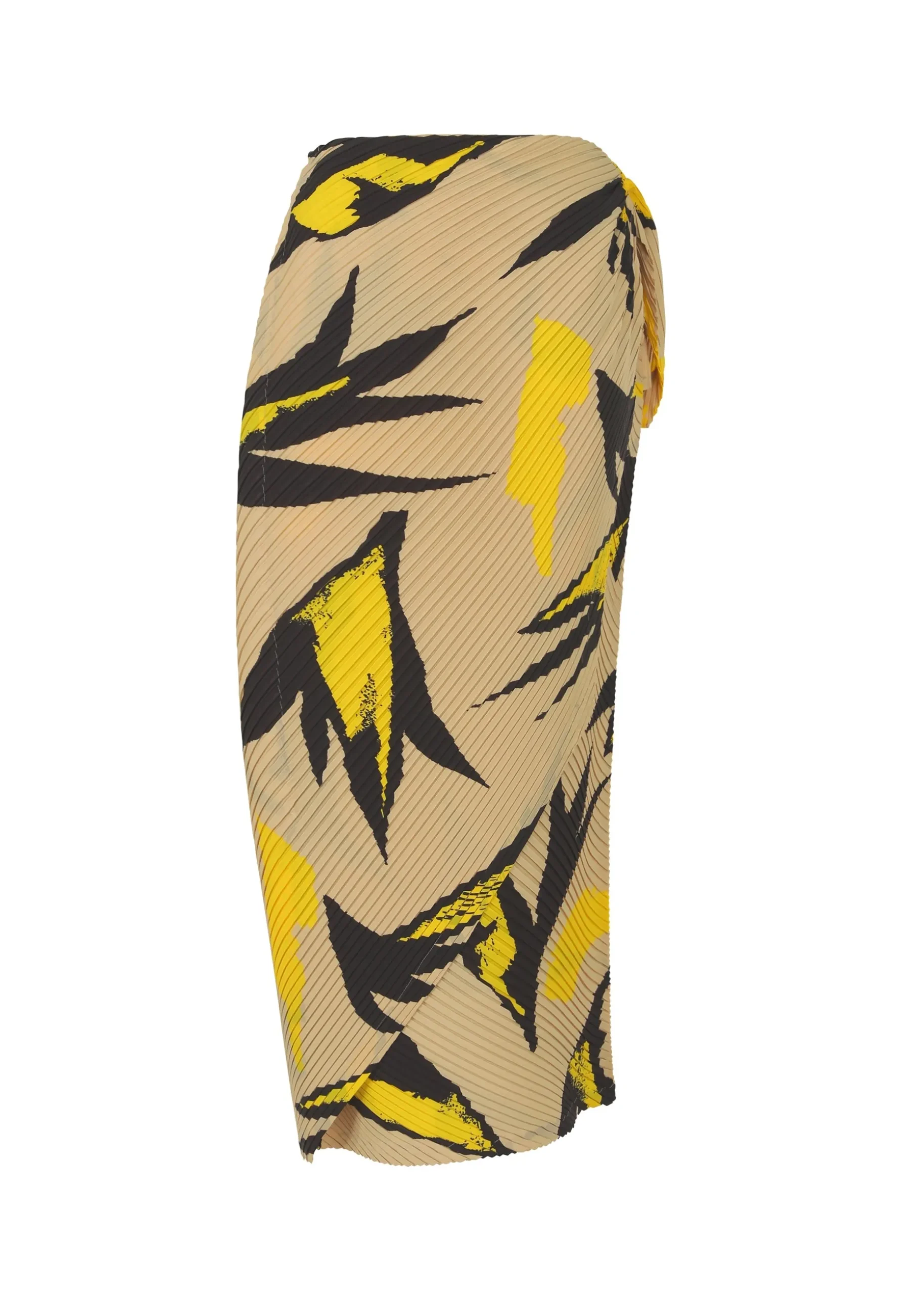 This pleated skirt expresses the vitality and strength of plants through its pattern that combines flowers with drawings. The base pattern was created by applying paint directly to dozens of different plants to make a print, and by layering a silk screen over foliage to apply pigments. Freehand drawings were then added to create a pattern with movement. The skirt is made from recycled polyester fabric with an inkjet print and features a design that seems to wrap the body based on the concept of “enclothe.”