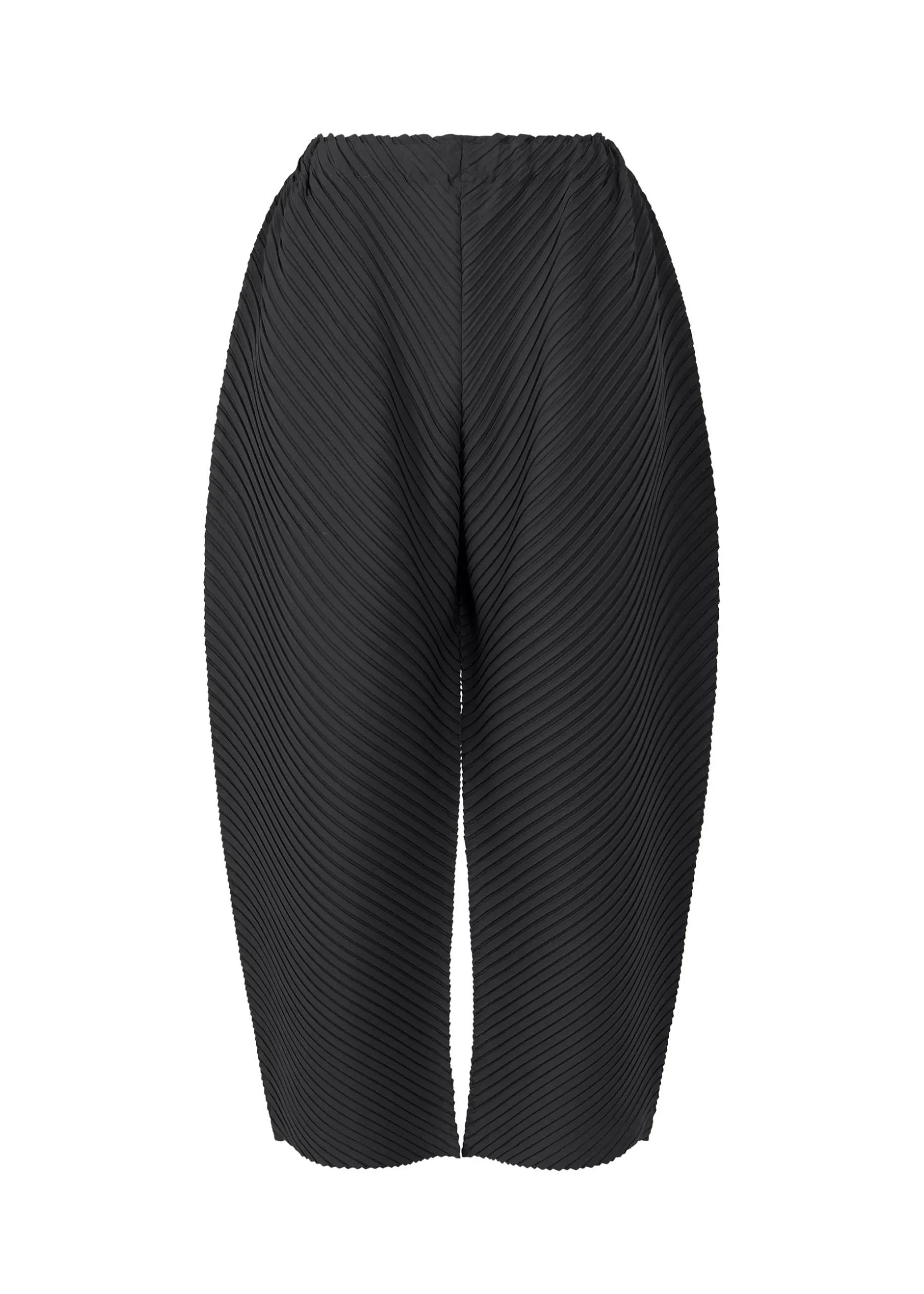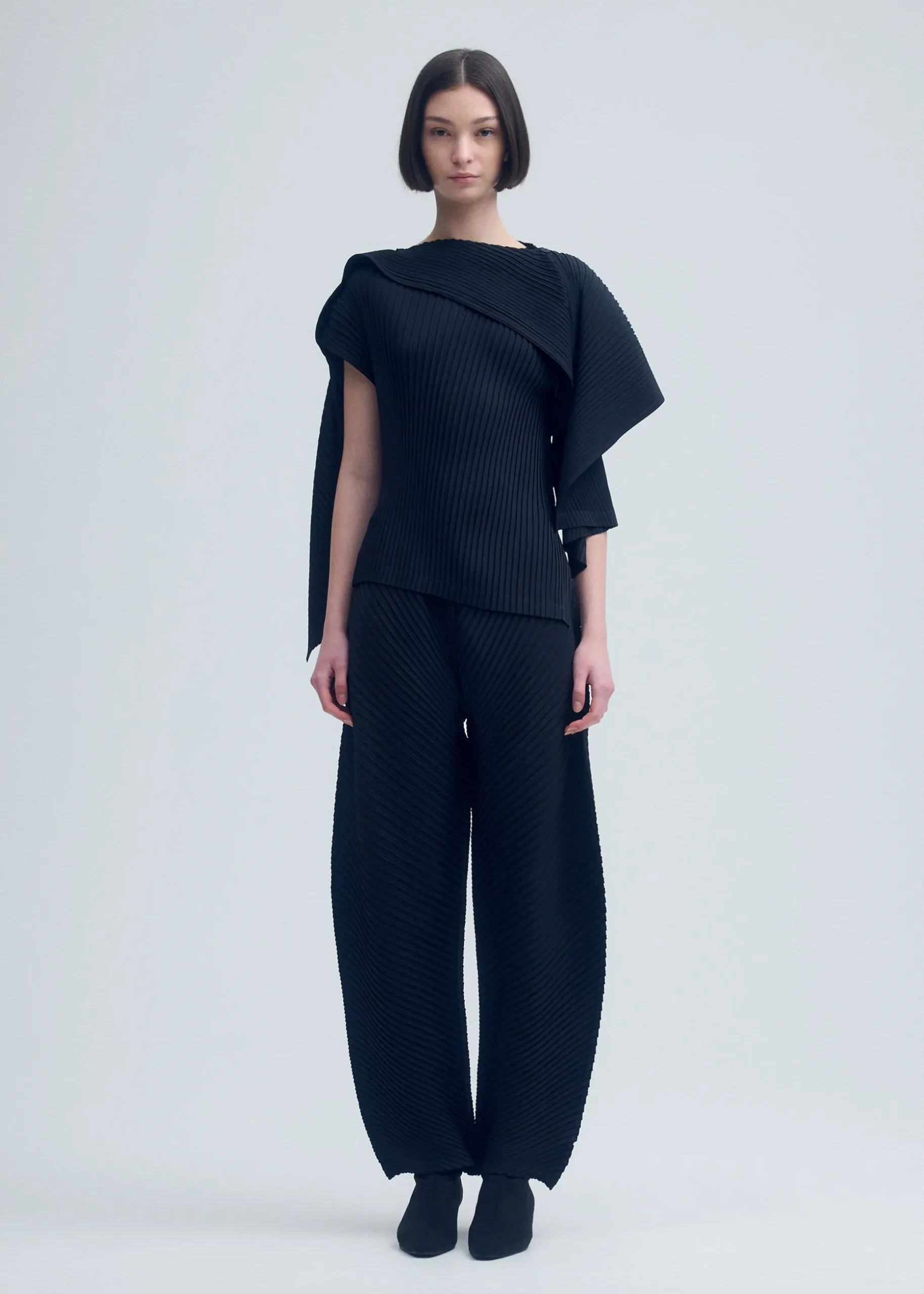 These pleated pants are characterized by their design that seems to wrap the body, inspired by the concept of “enclothe.” Made from recycled polyester, they combine the unique versatility of solid colors with a flowing pleated design.