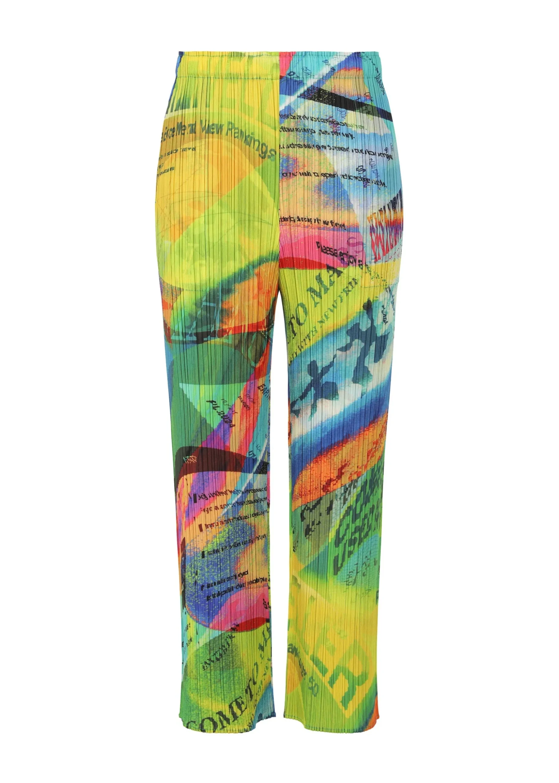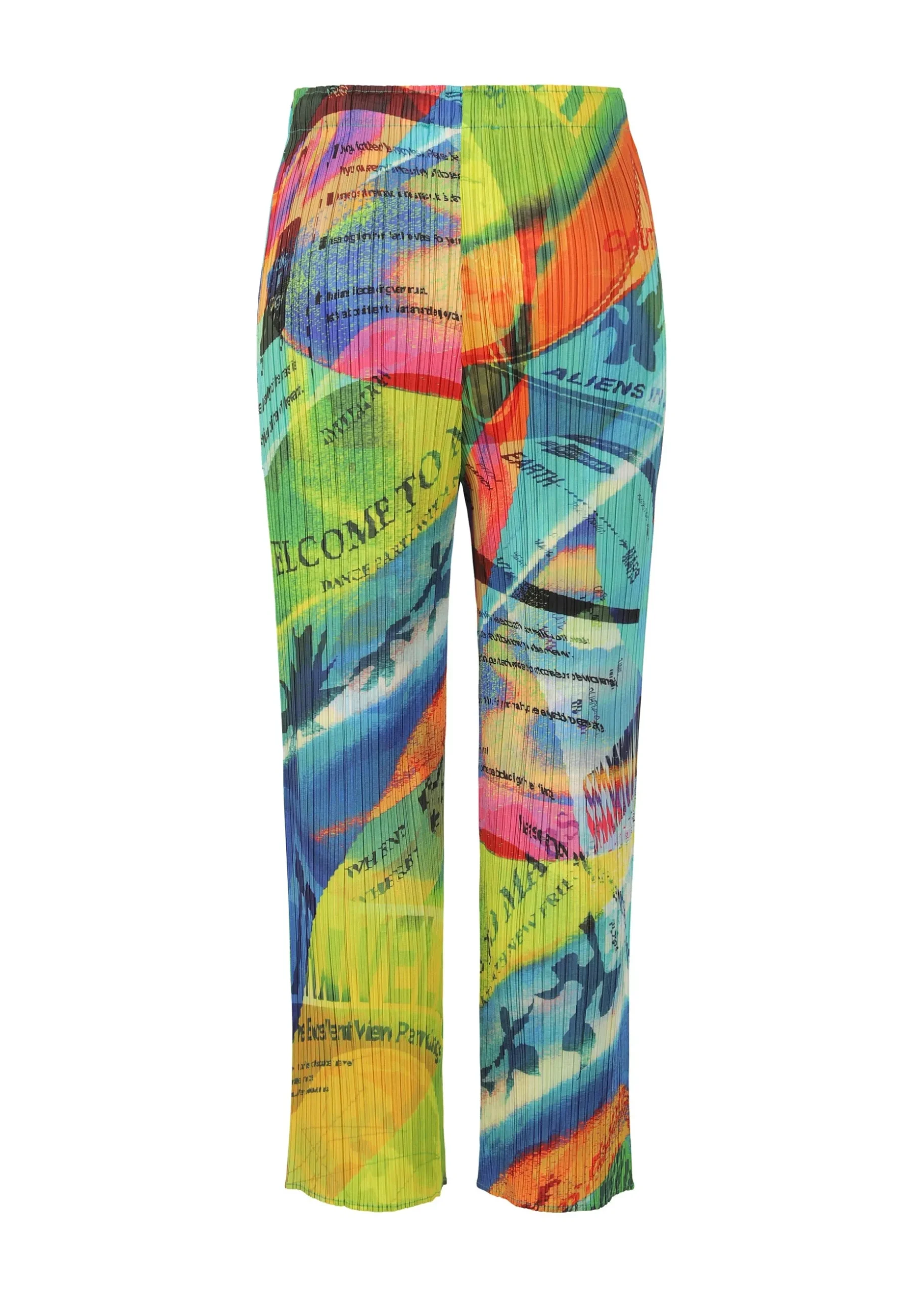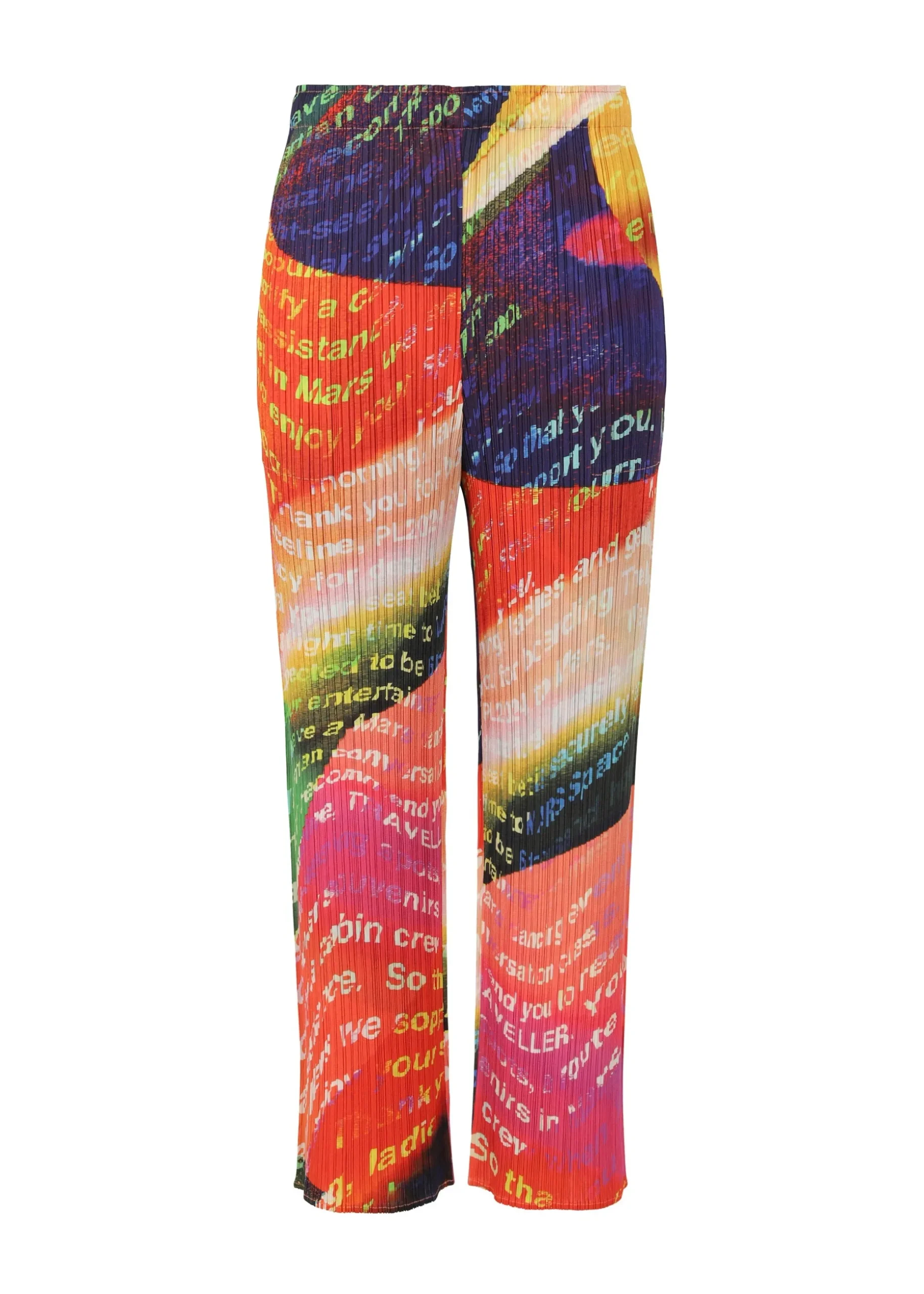 These medium-weight pants have a print that depicts the beginning of a journey into an unknown universe. The print features motifs of an exciting journey, such as a boarding pass for a space shuttle, an in-flight magazine, and an invitation to a dance party on Mars. They have pockets on both sides.
