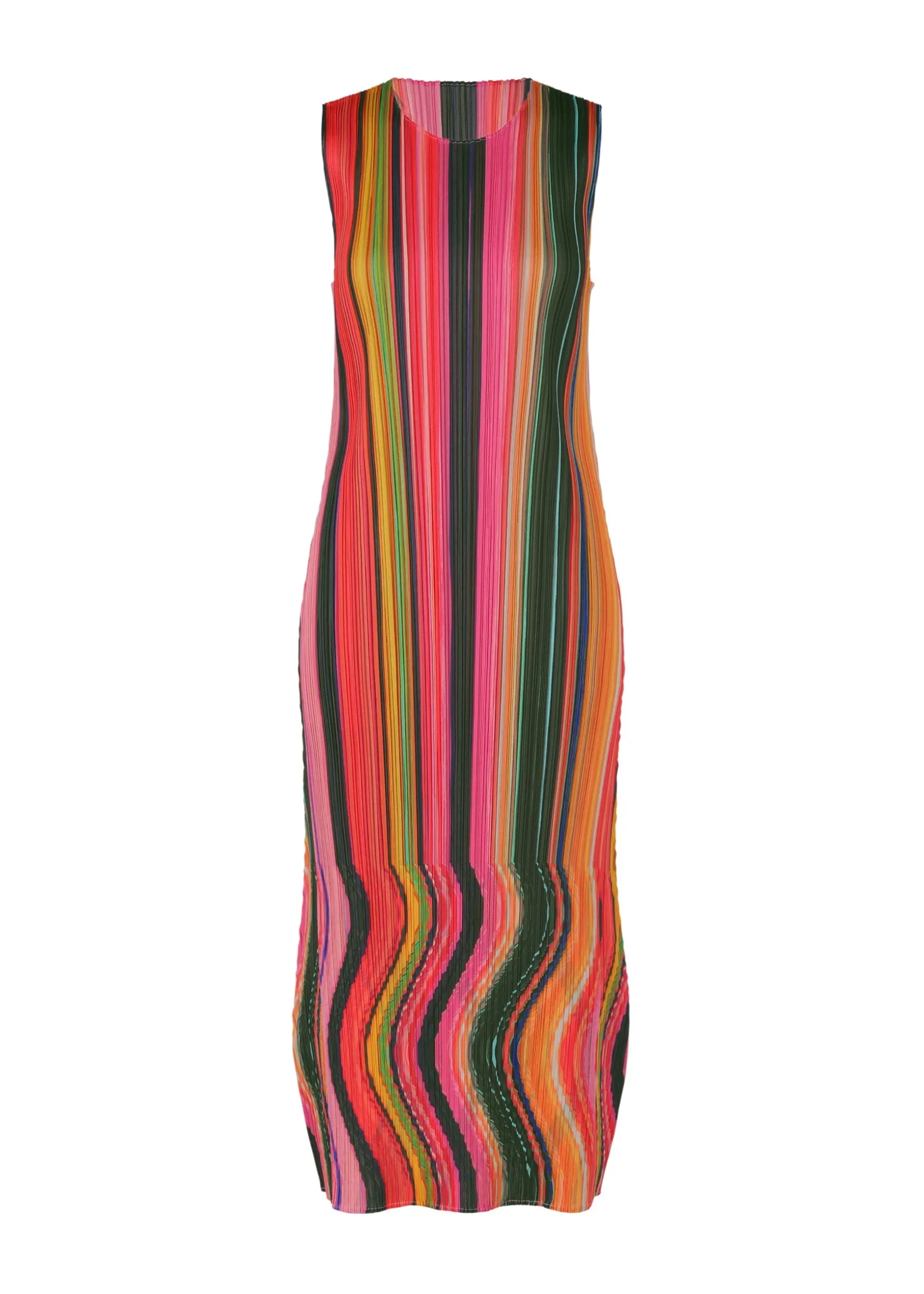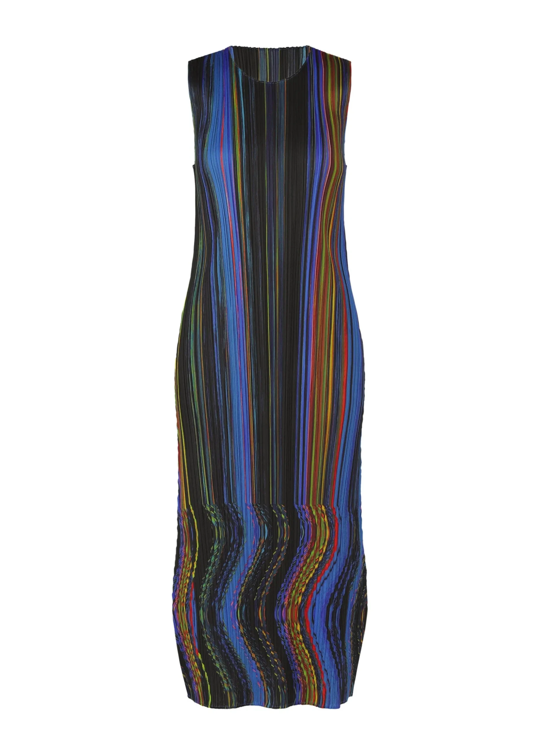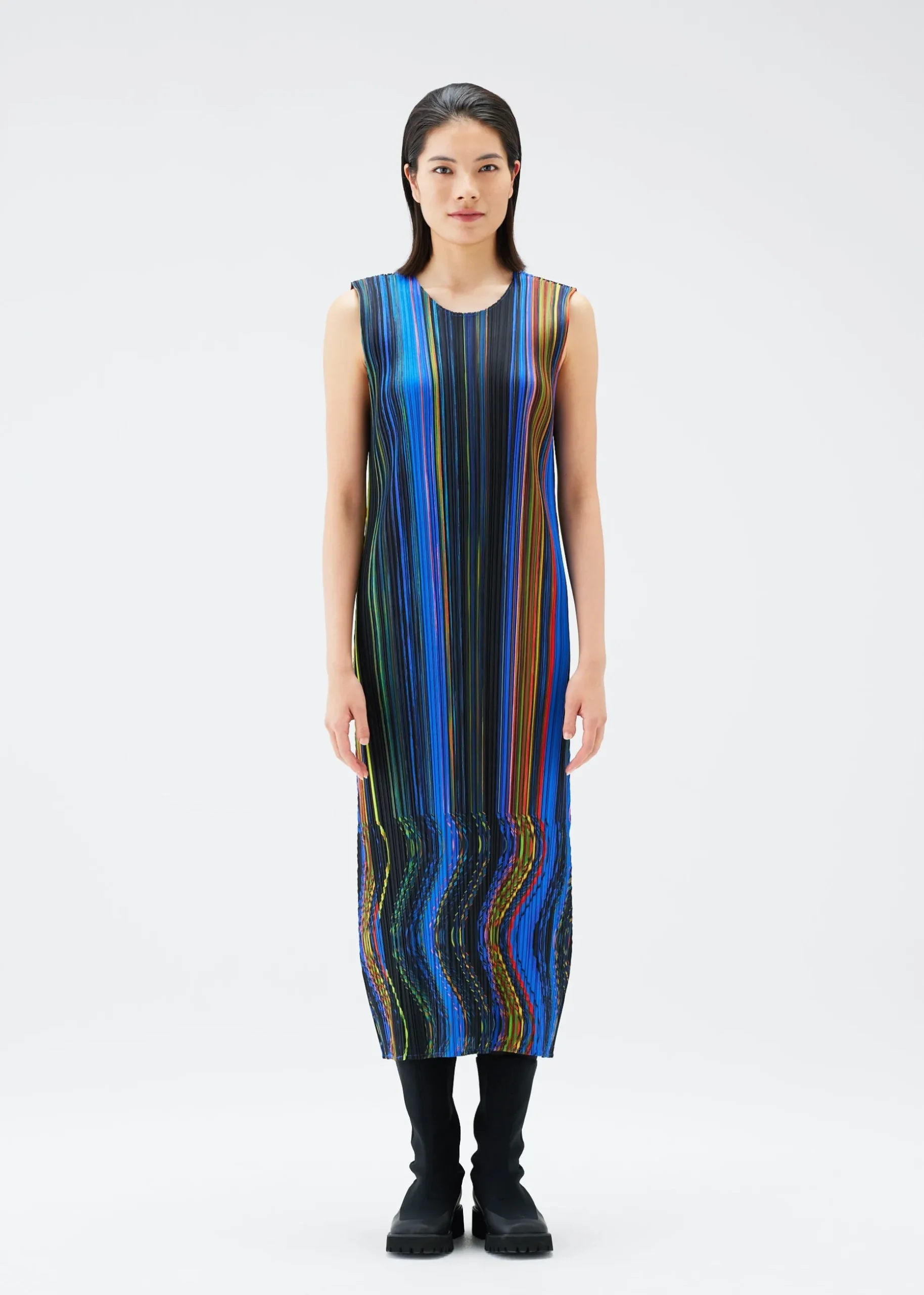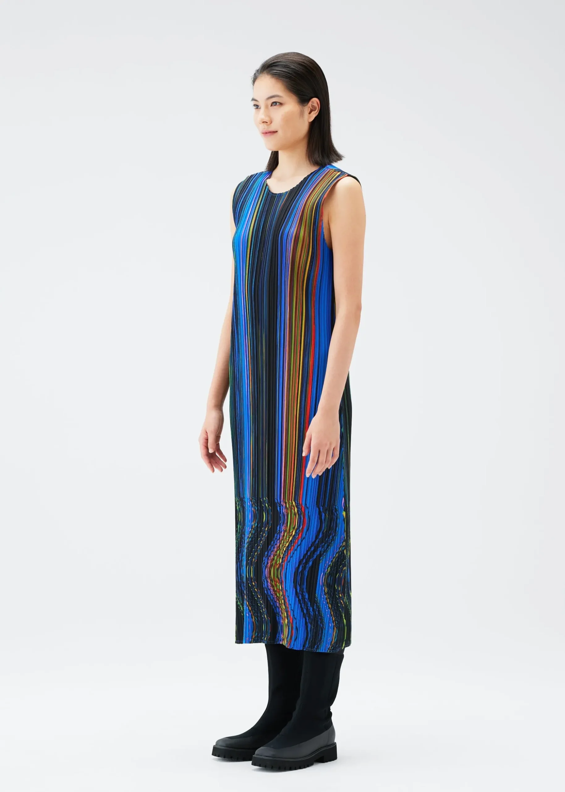 This round-neck, sleeveless dress has a print that depicts the mysterious space-time continuum passed through when warping. The pattern was created by curving film during photography and then enlarging the photograph.