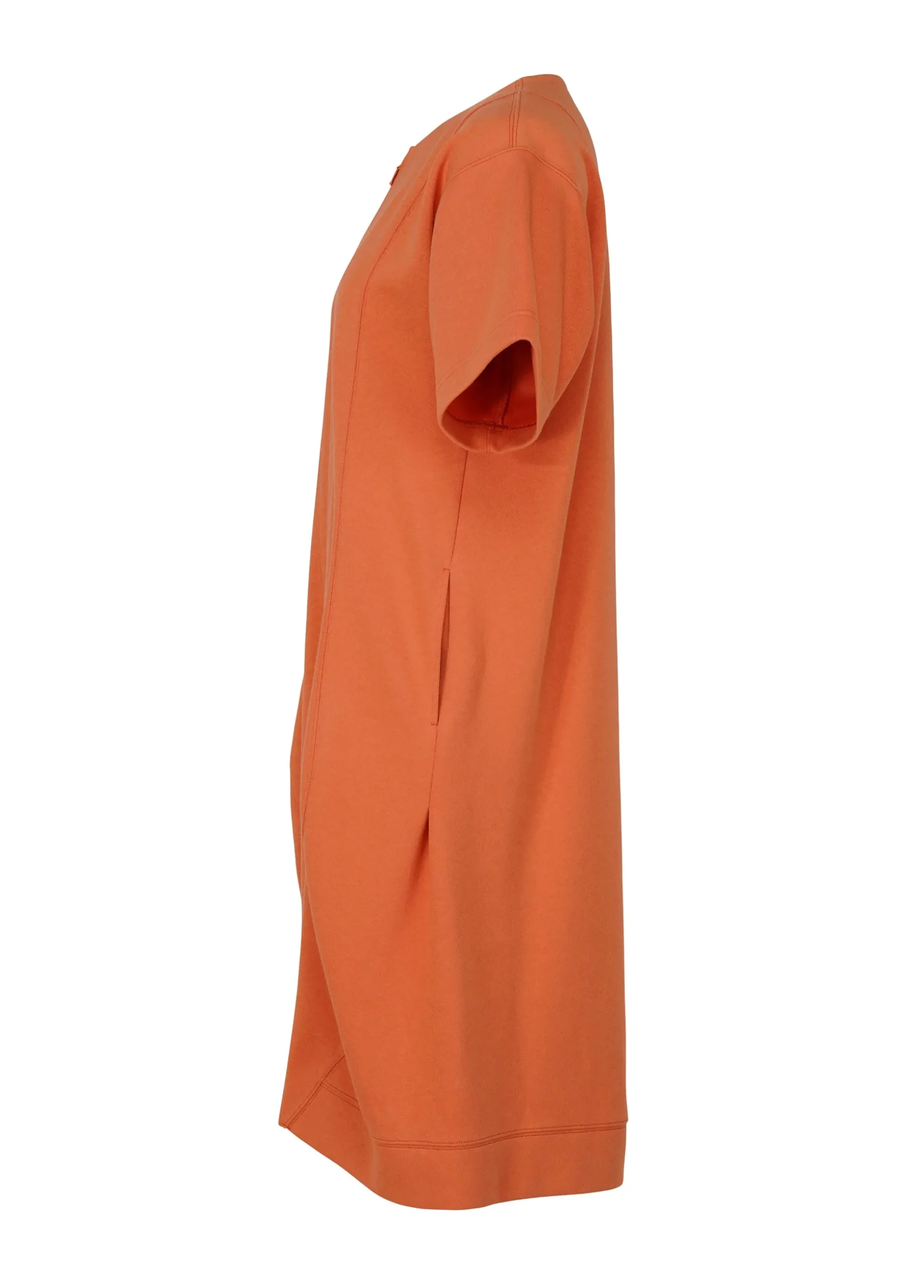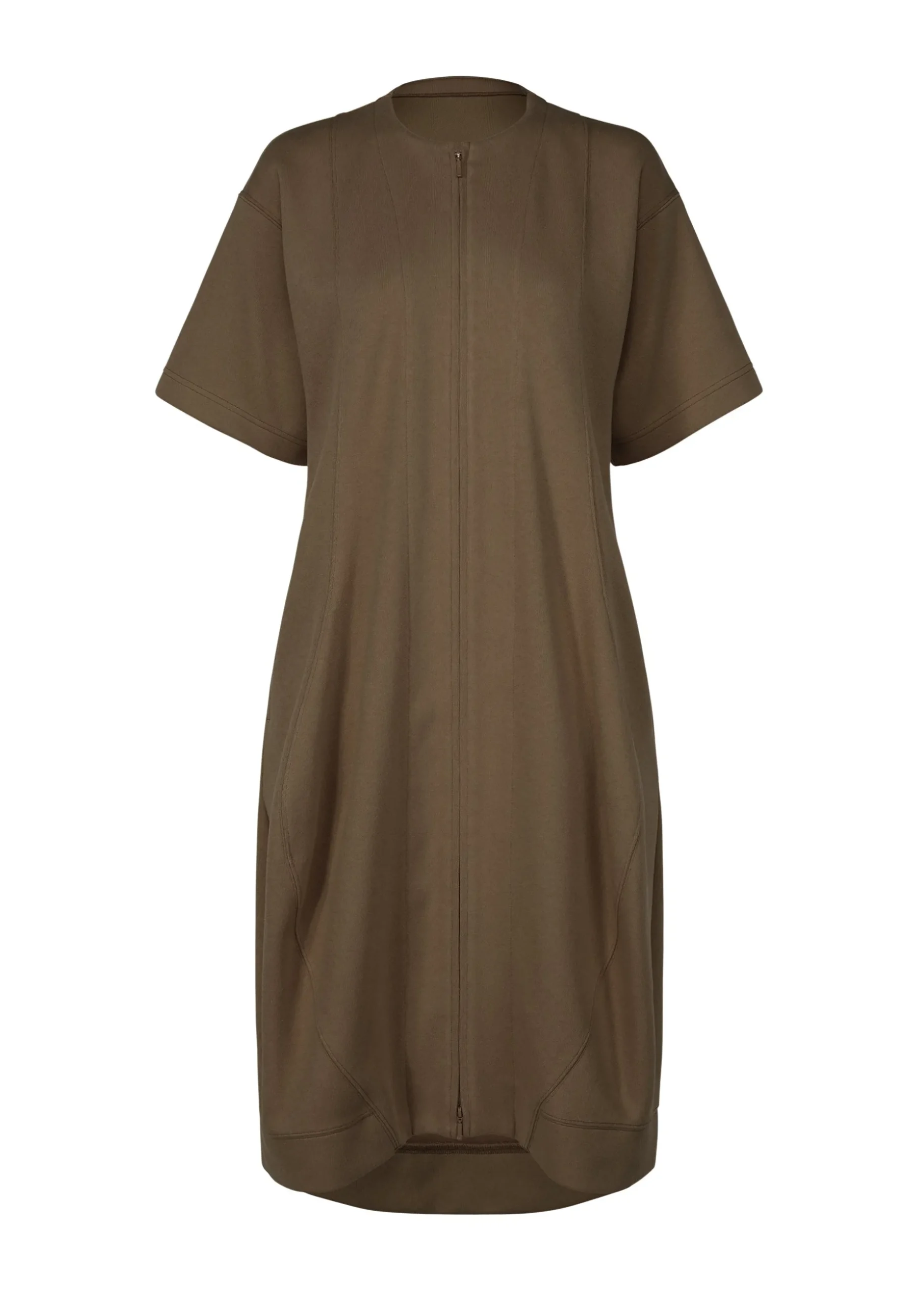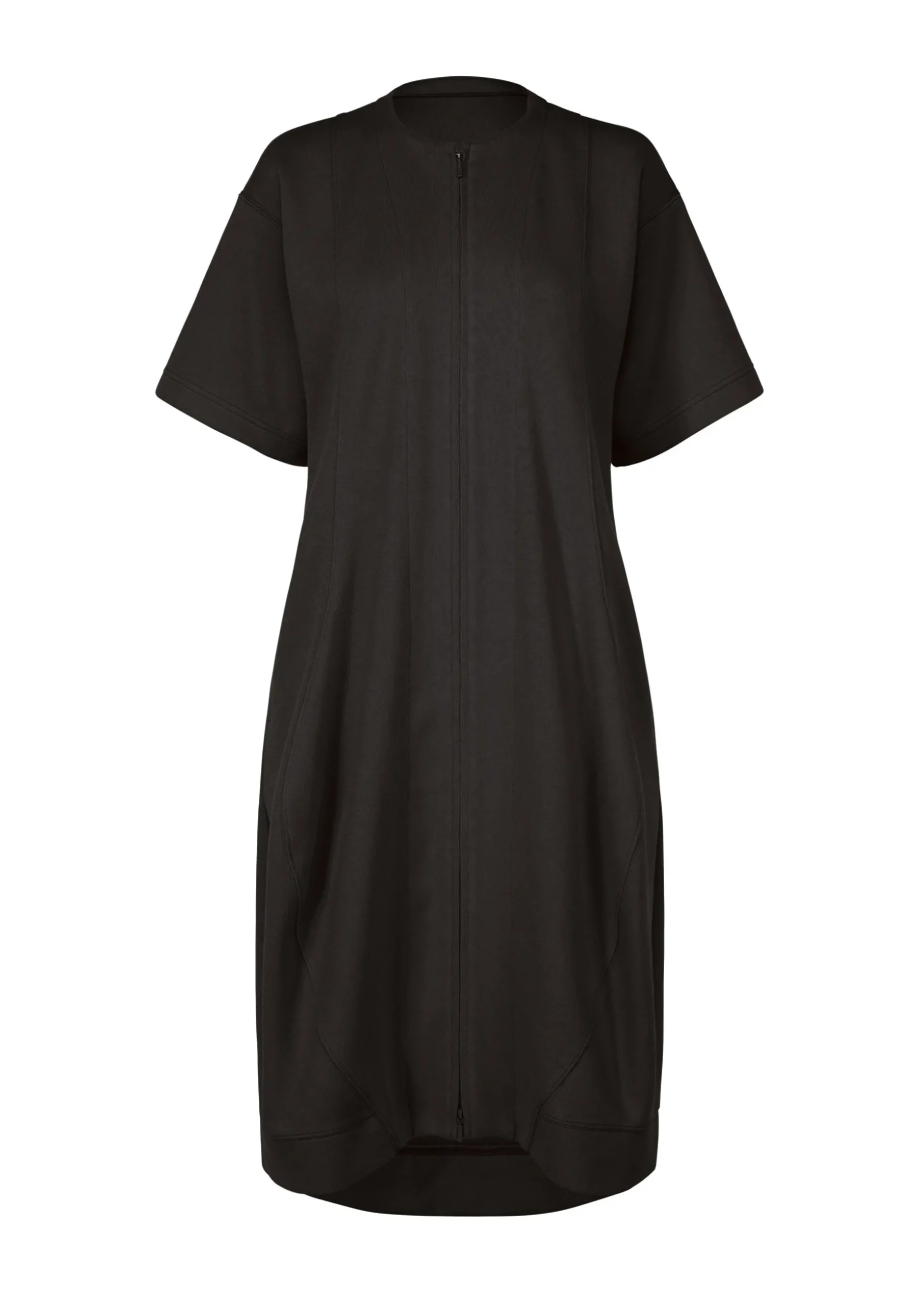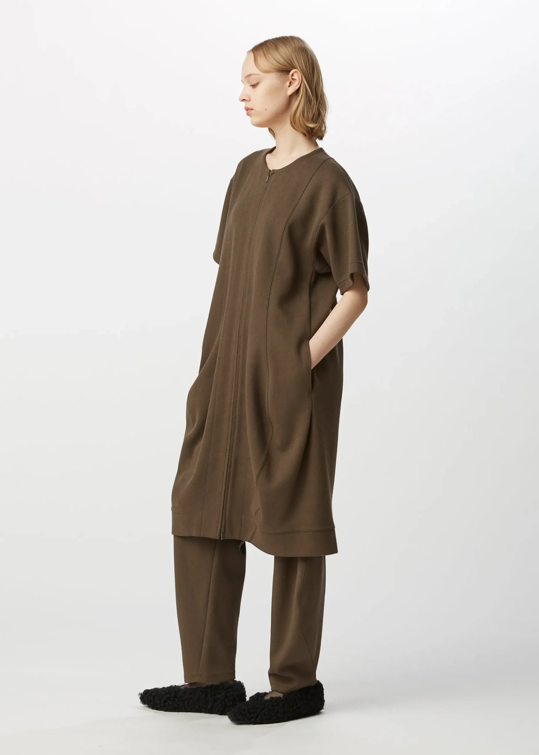 This long cardigan is made from supple jersey material that stretches in both the vertical and horizontal directions. Organic cotton is used for the front and recycled polyester for the lining. This cardigan is characterized by their curved cut lines that look like waves.