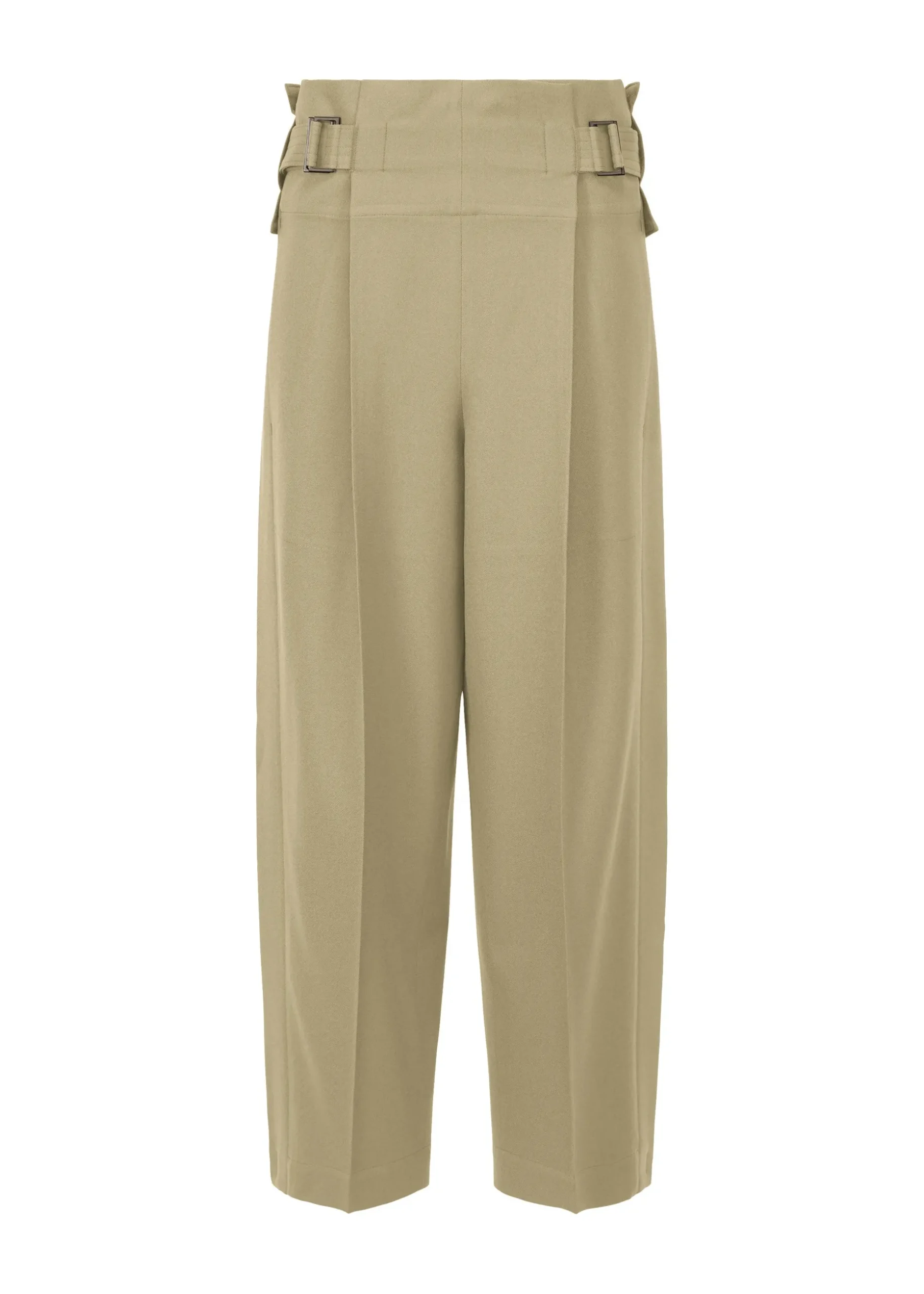These pants are made from wool-like recycled polyester fabric with tucks that folds flat.