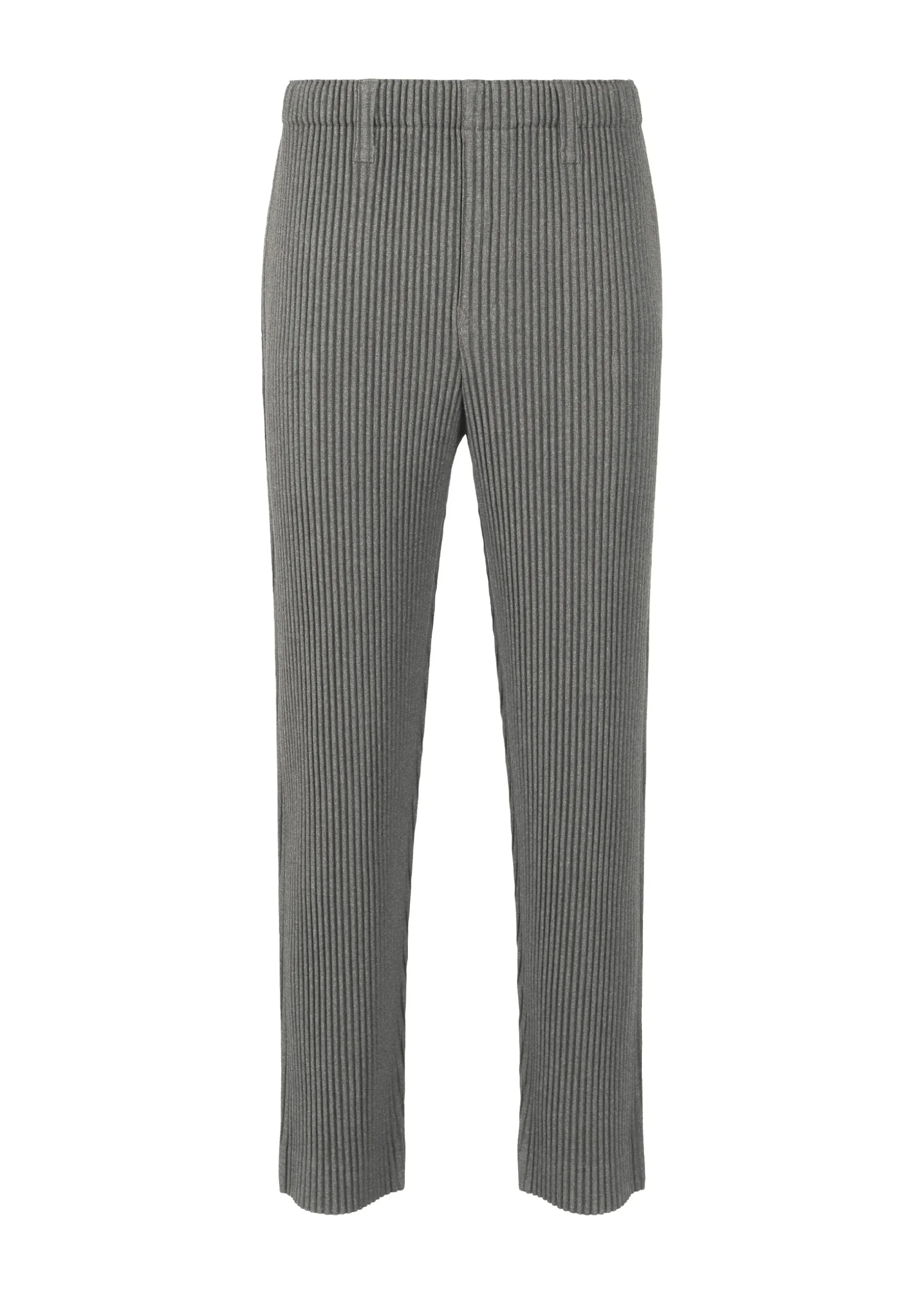 These straight pants are characterized by their soft, supple texture despite being made from polyester. They have pockets on both sides and belt loops at the waist. They have a button-fly design.