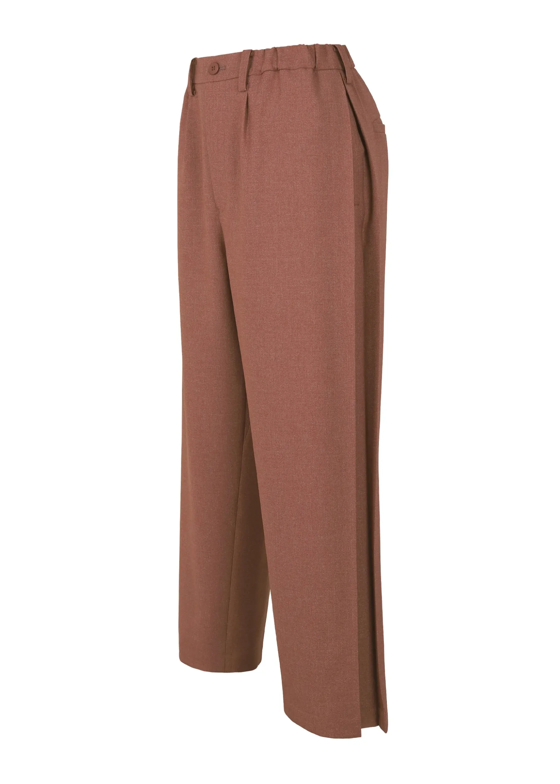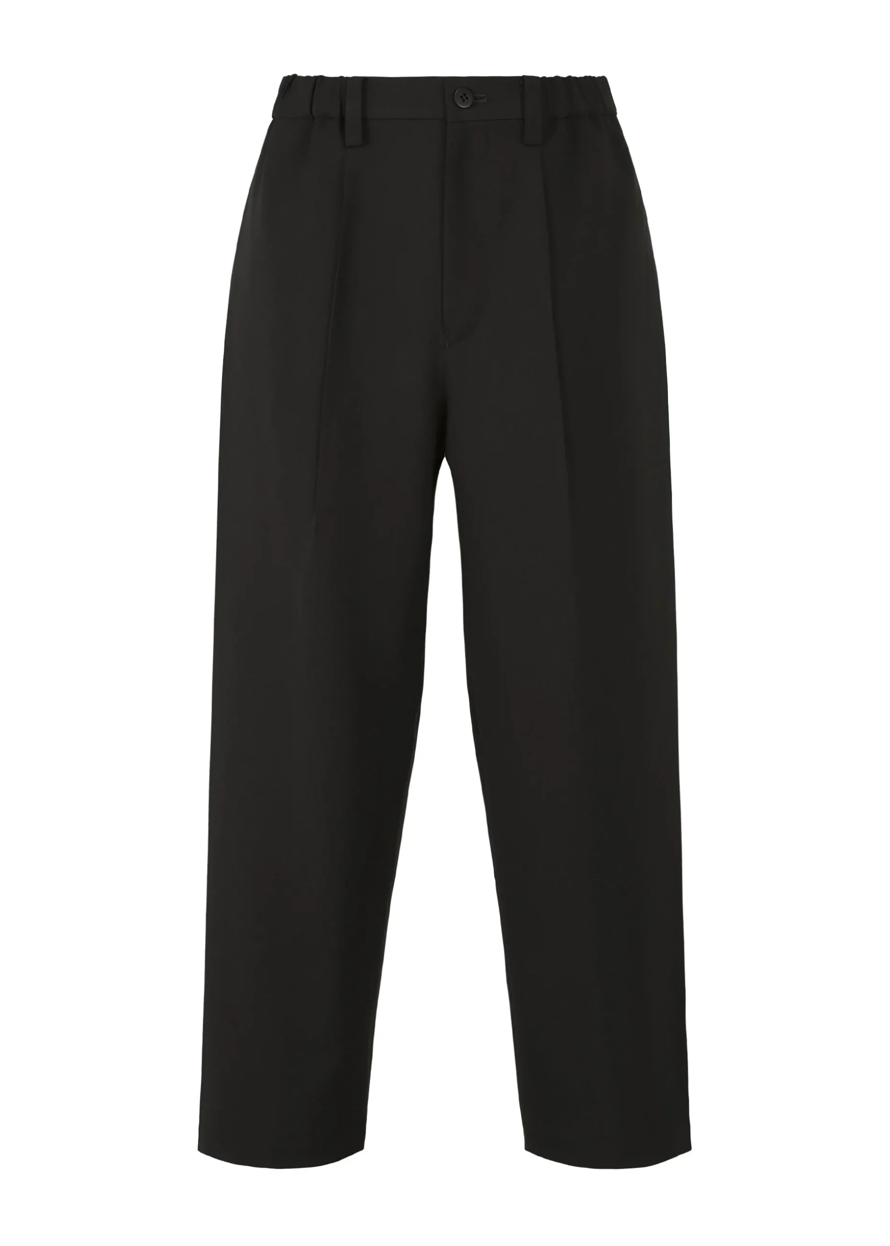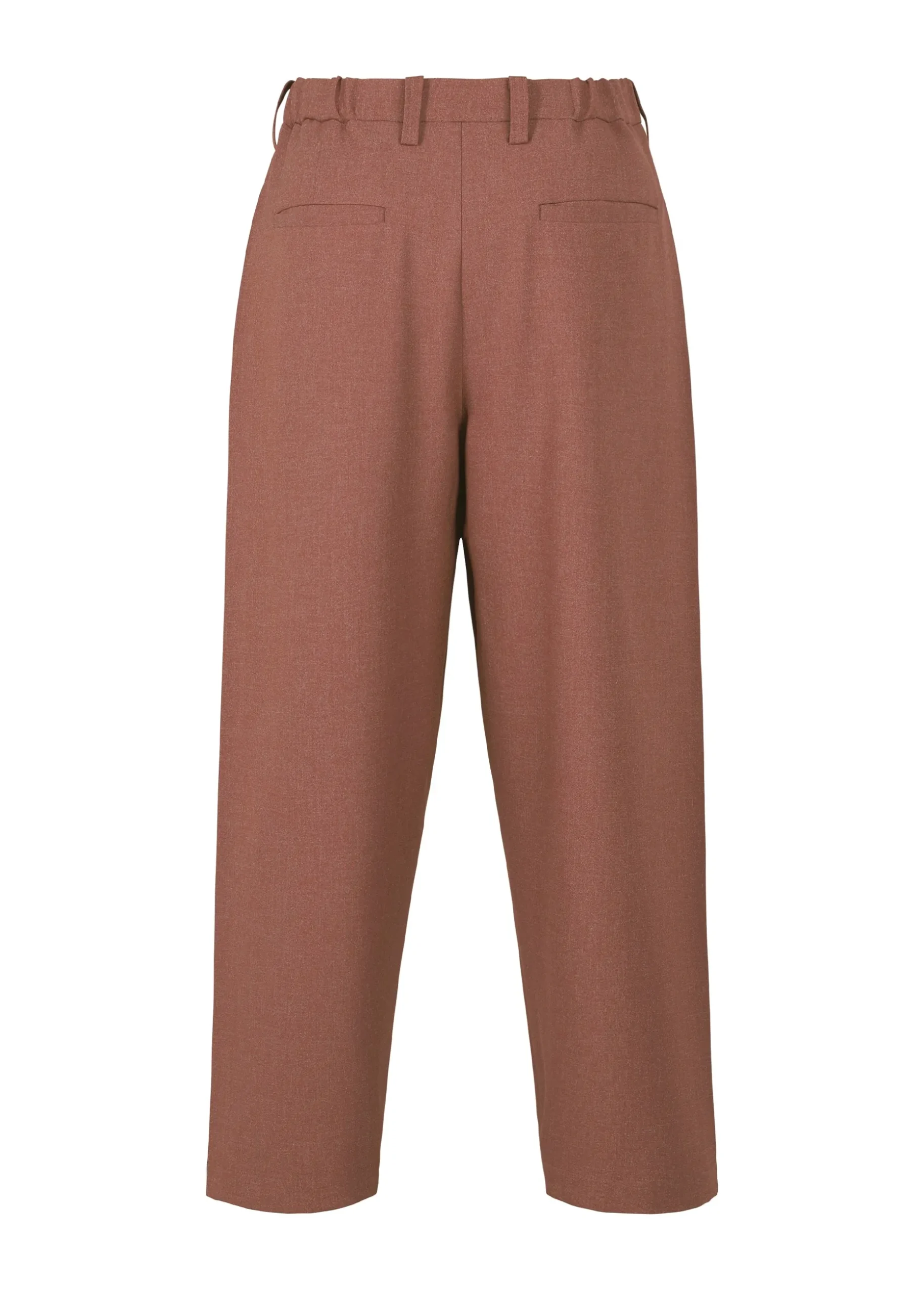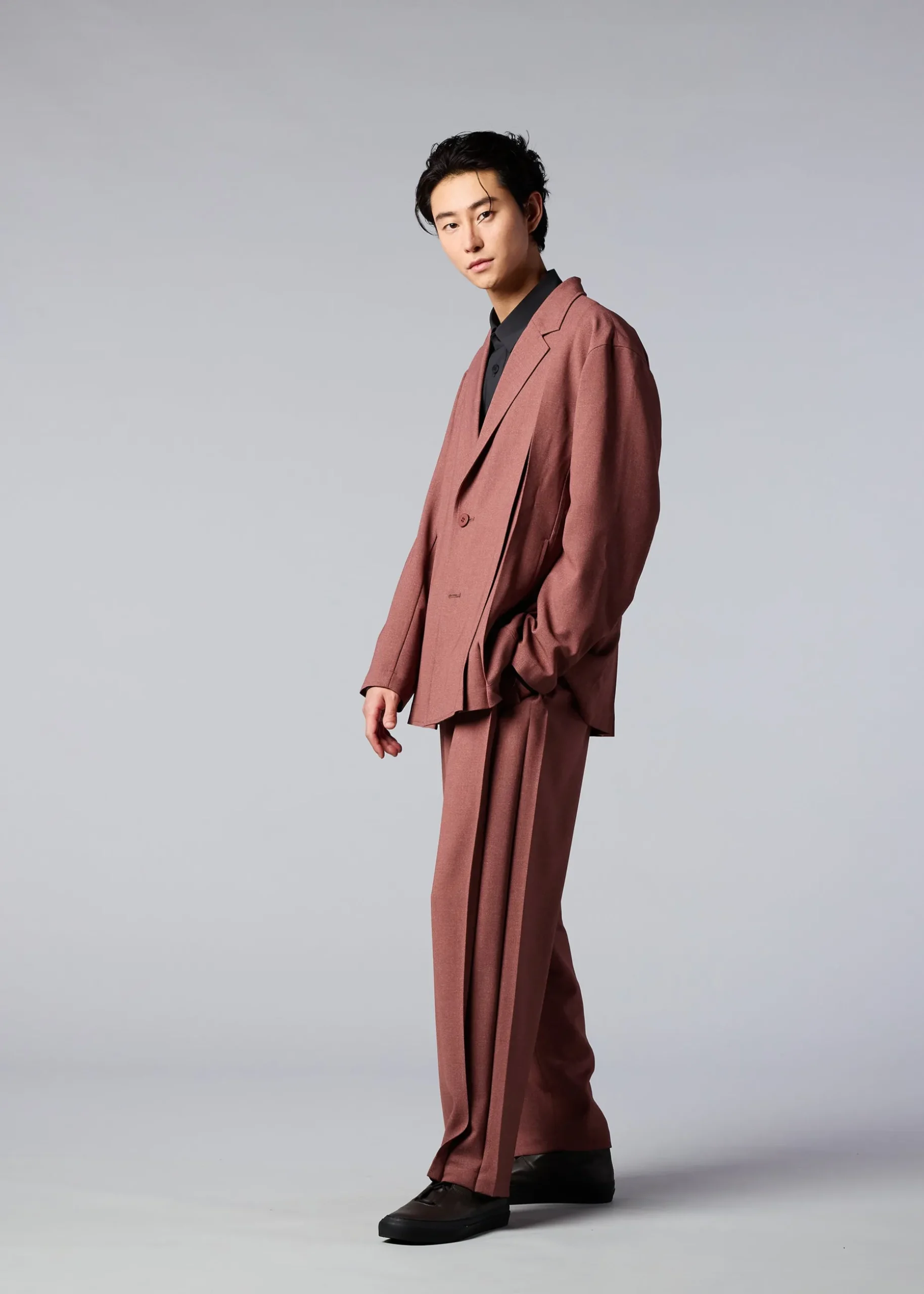 The pants are hand pleated on both sides, giving them a clean silhouette and a functional design that is light and easy to move in. Two types of threads are dyed differently and woven to look like wool.